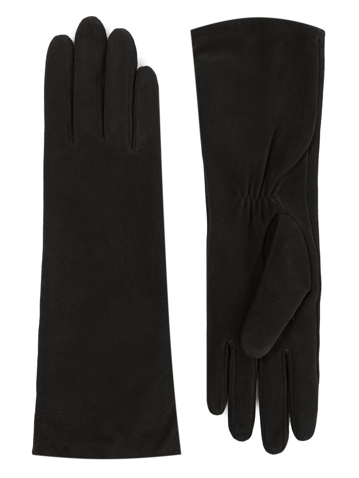 Трендовые удлиненные женские перчатки торговой марки ELEGANZZA. Выполнены из высококачественной натуральной замши на подкладе из шерстяной пряжи с добавлением кашемира. Модель со средней длиной пальцев и длиной манжеты от нижней точки большого пальца до края перчаток - 14 см.