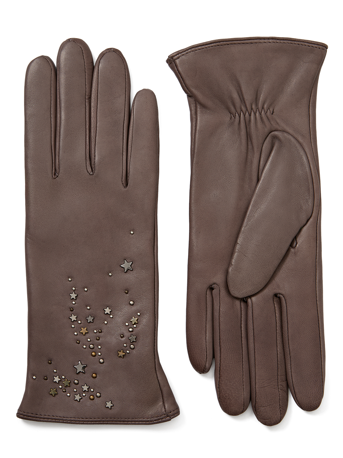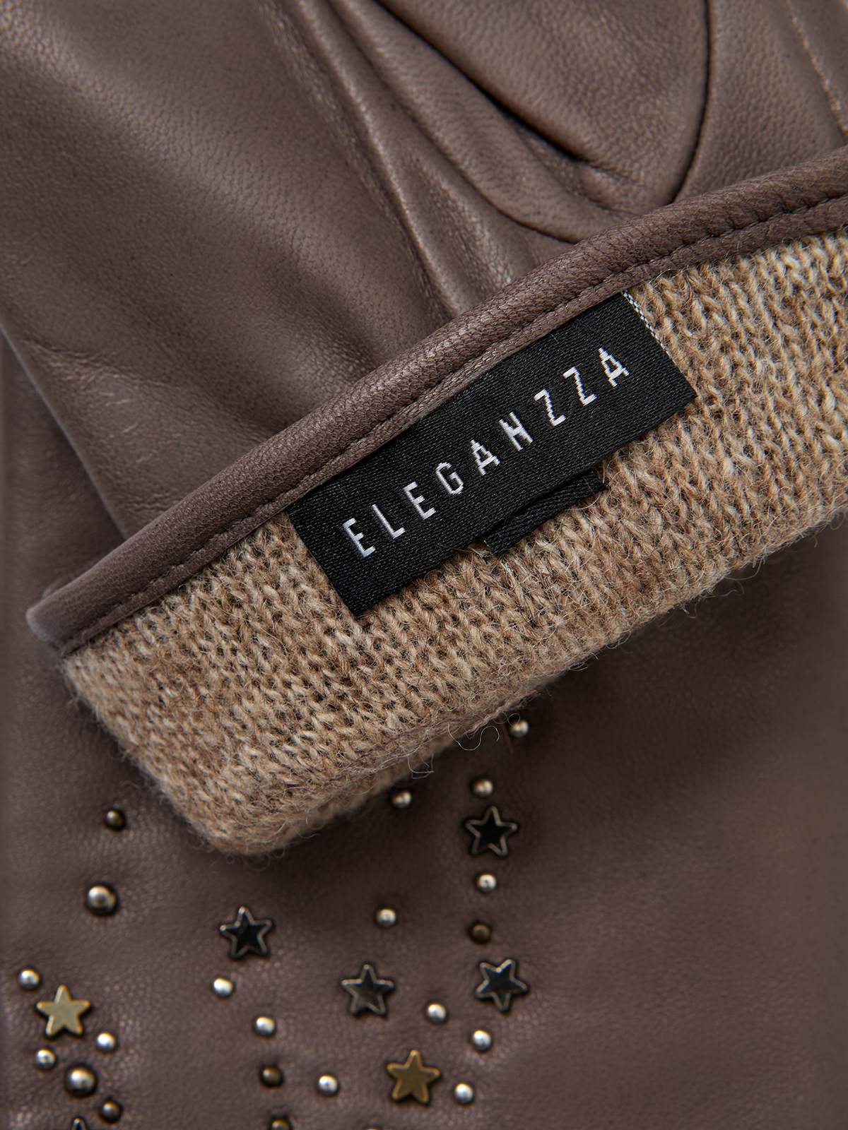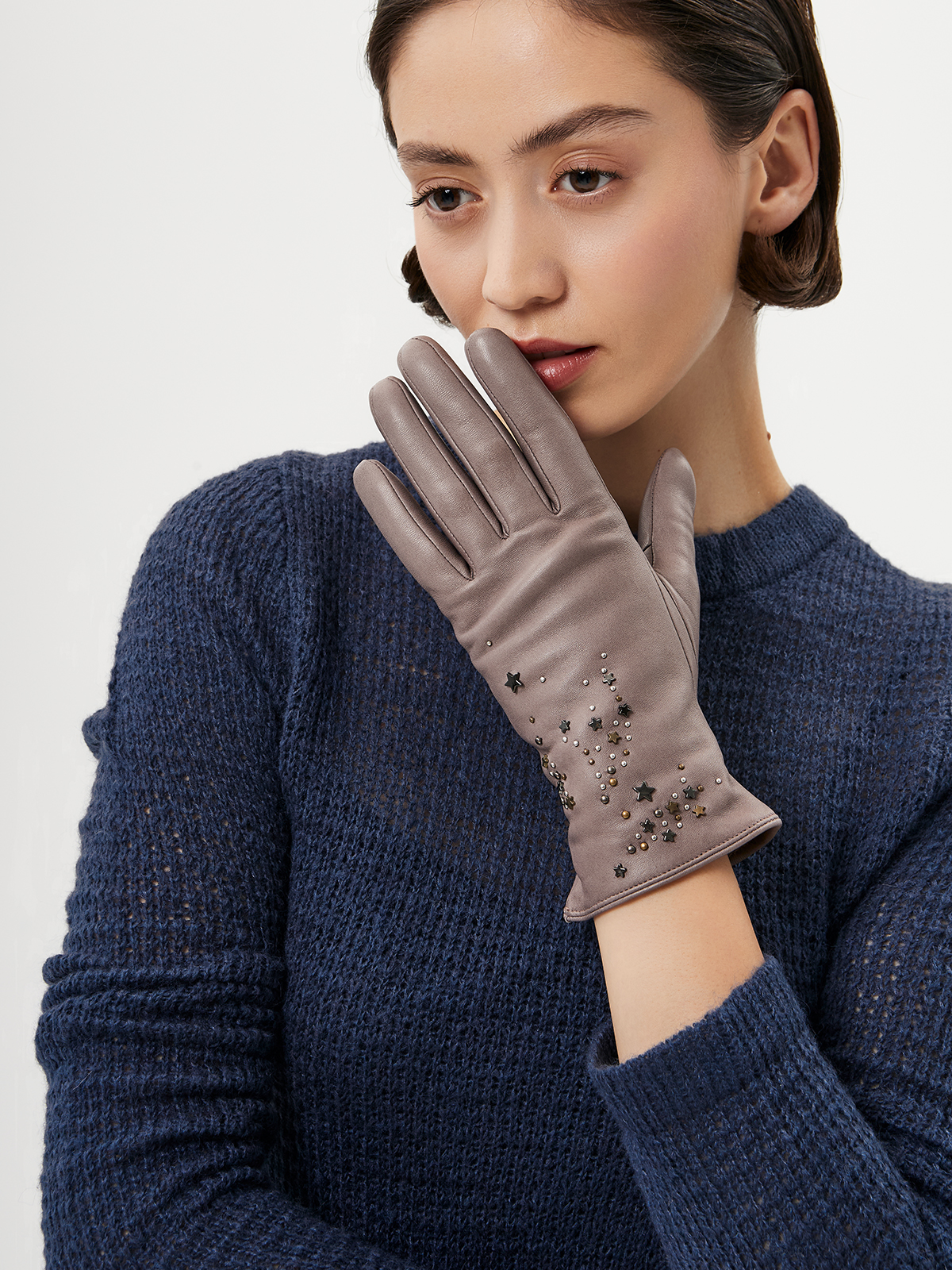 Перчатки женские торговой марки ELEGANZZA. Выполнены из эксклюзивной итальянской кожи ягнёнка в трендовом цвете сезона и дополнены шерстяным подкладом с добавлением кашемира. Декорированы россыпью металлических хольнитенов создающих замысловатый узор. Модель со средней длиной пальцев и длиной манжеты от нижней точки большого пальца до края перчаток - 6 см.