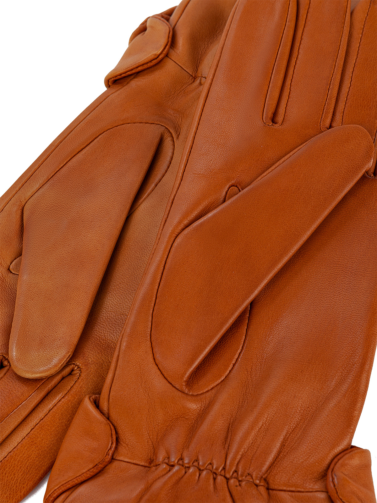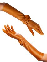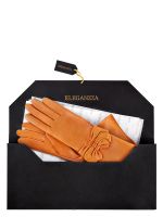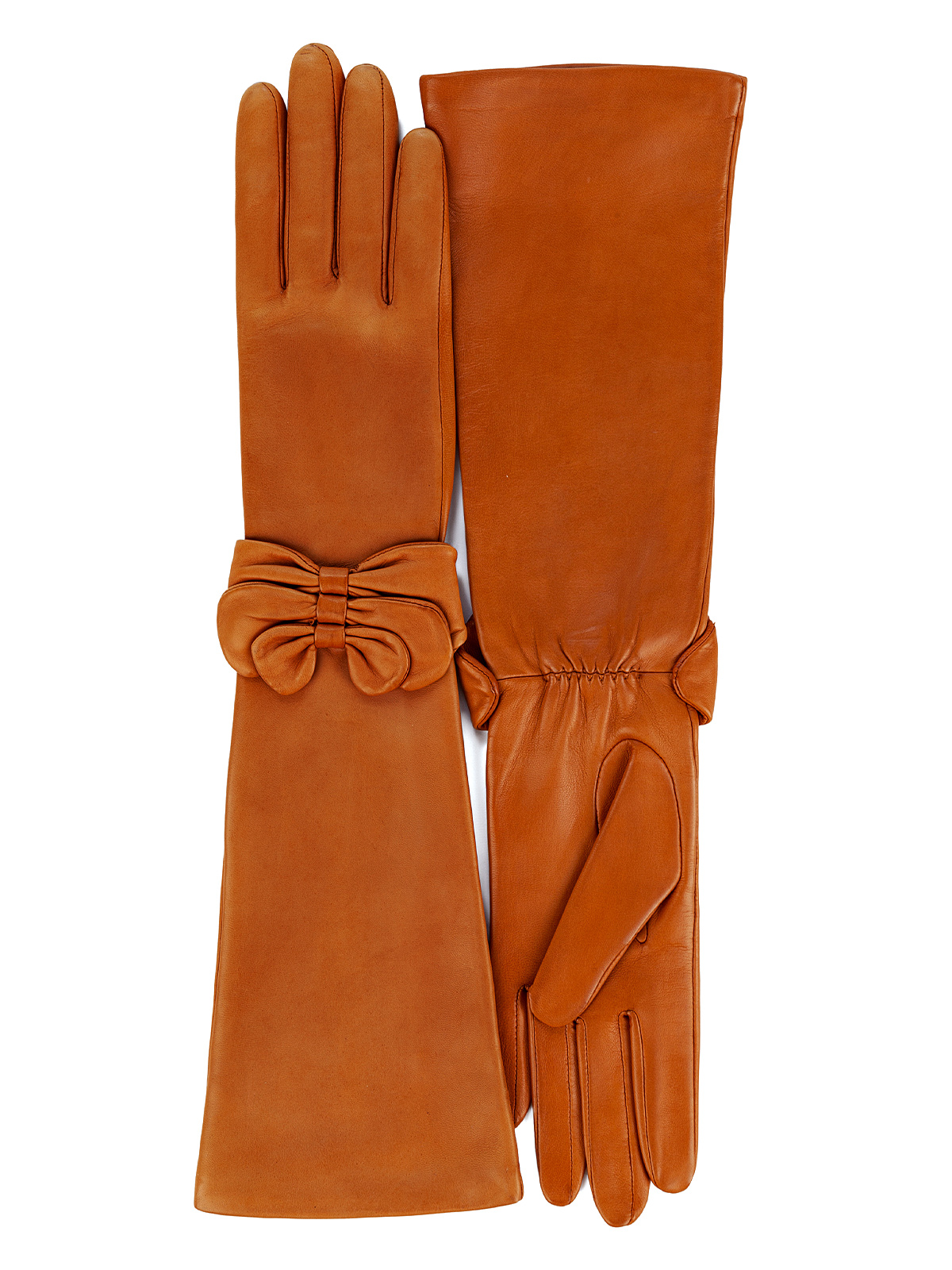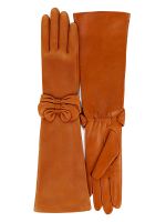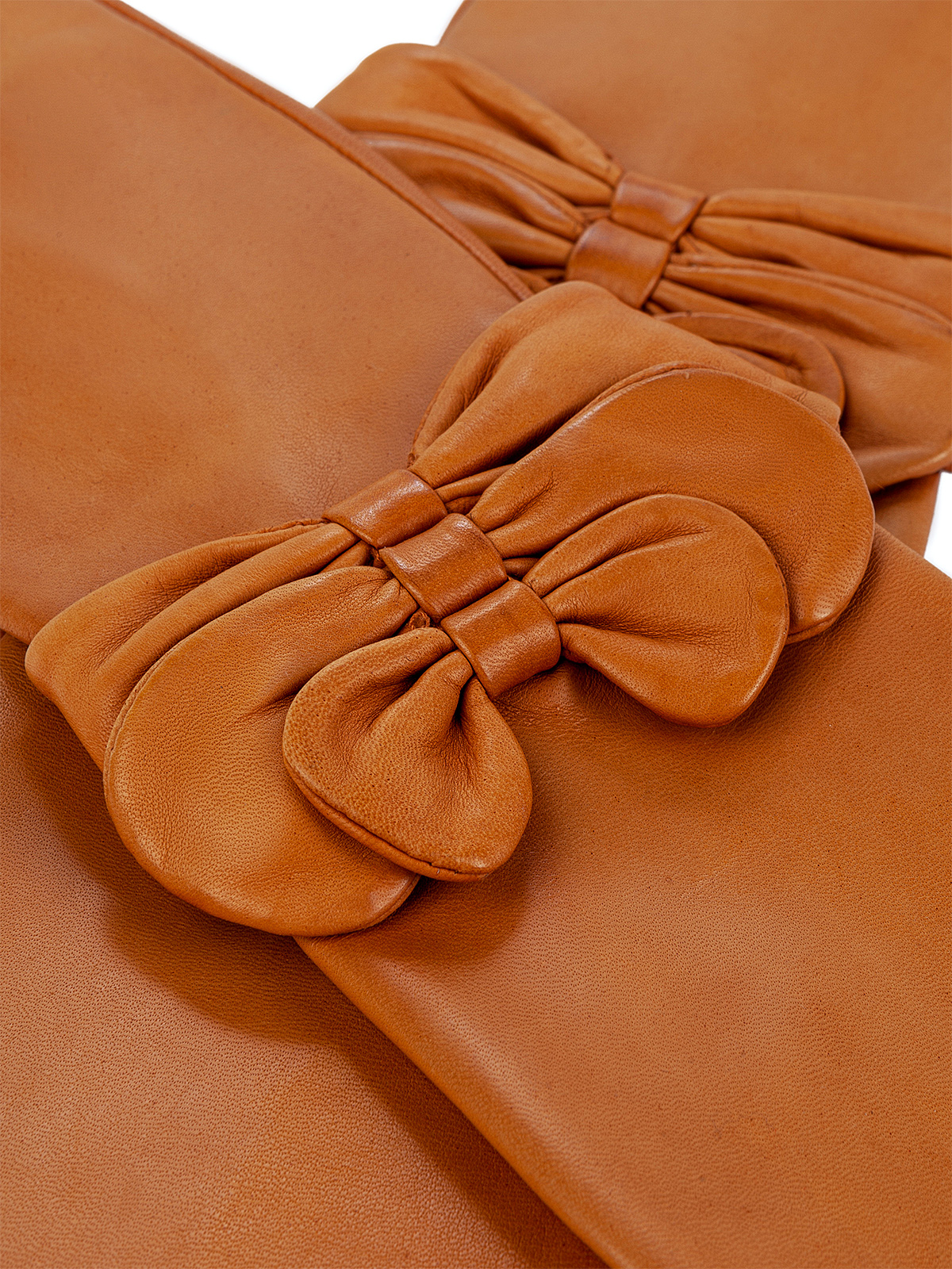 Перчатки торговой марки ELEGANZZA производства Филиппины выполнены из кожи ягнёнка черного цвета. Подкладка - 100% шелк. Отделка - два декоративных кожаных бантика. Длина манжеты от нижней точки большого пальца до края перчаток - 25 см. Длина пальцев - средние.