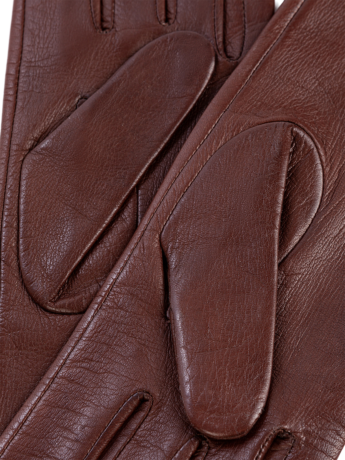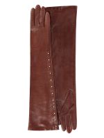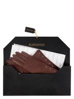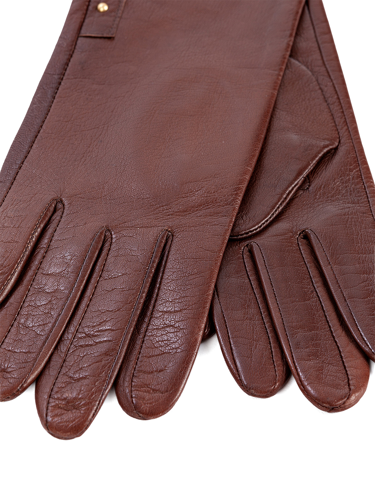 Перчатки торговой марки ELEGANZZA производства Филиппины. Изготовлены из натуральной кожи ягнёнка. Подкладка - натуральный шелк. Отделка - дополнительная тонкая полоска по всей длине перчатки по линии мизинца украшенная миниматюрными хольнитенами. Длина манжеты от нижней точки большого пальца до края перчаток составляет - 35 см. Длина пальцев - средняя.