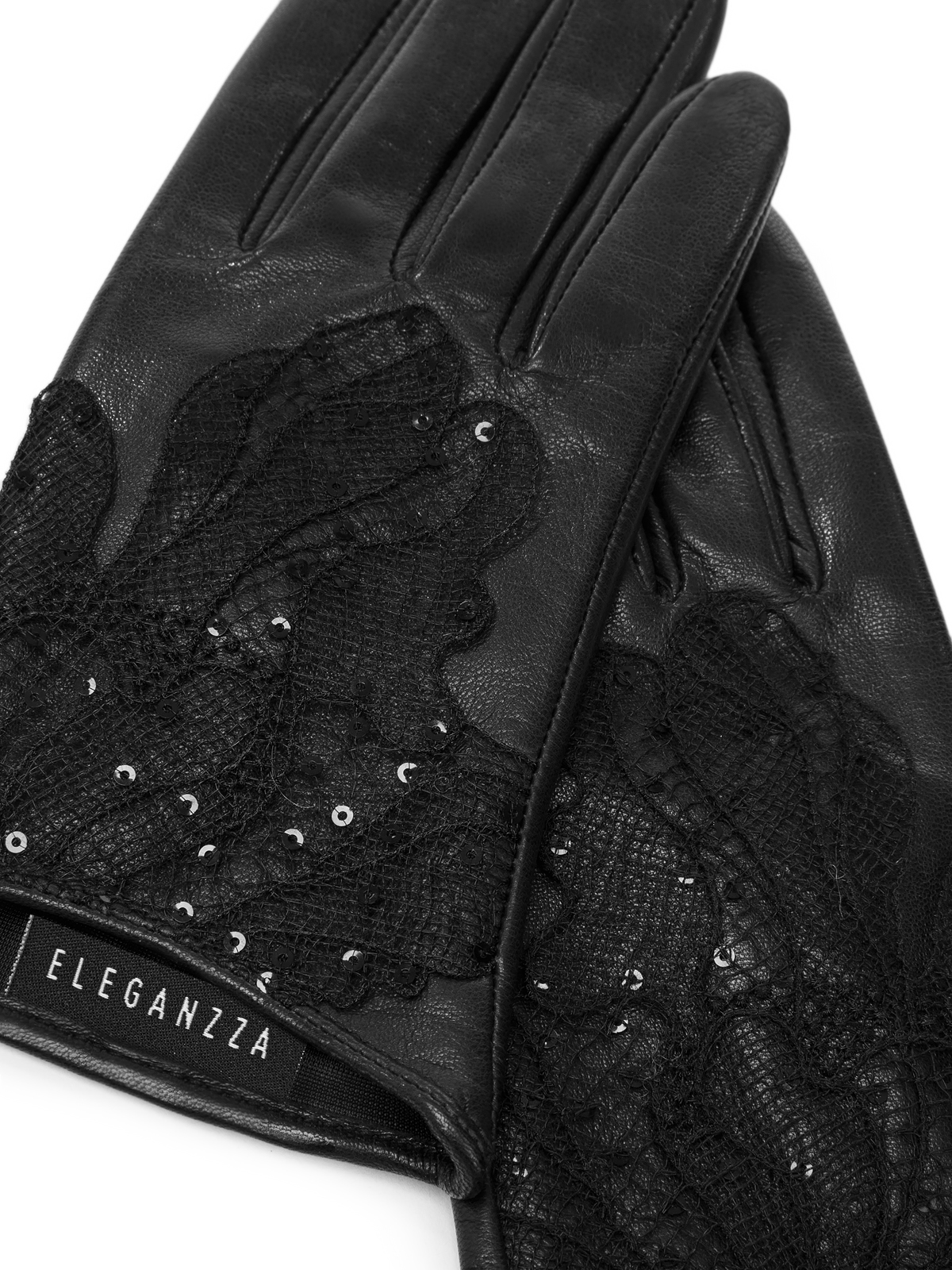 Перчатки женские торговой марки ELEGANZZA из натуральной кожи ягненка. Производство Италия. Подкладка 100% шелк. Декоративная отделка - кружевная вставка с мерцающими пайетками на лицевой стороне перчатки. Длина манжеты от нижней точки большого пальца до края перчаток - 3 см. Длина пальцев - средняя.