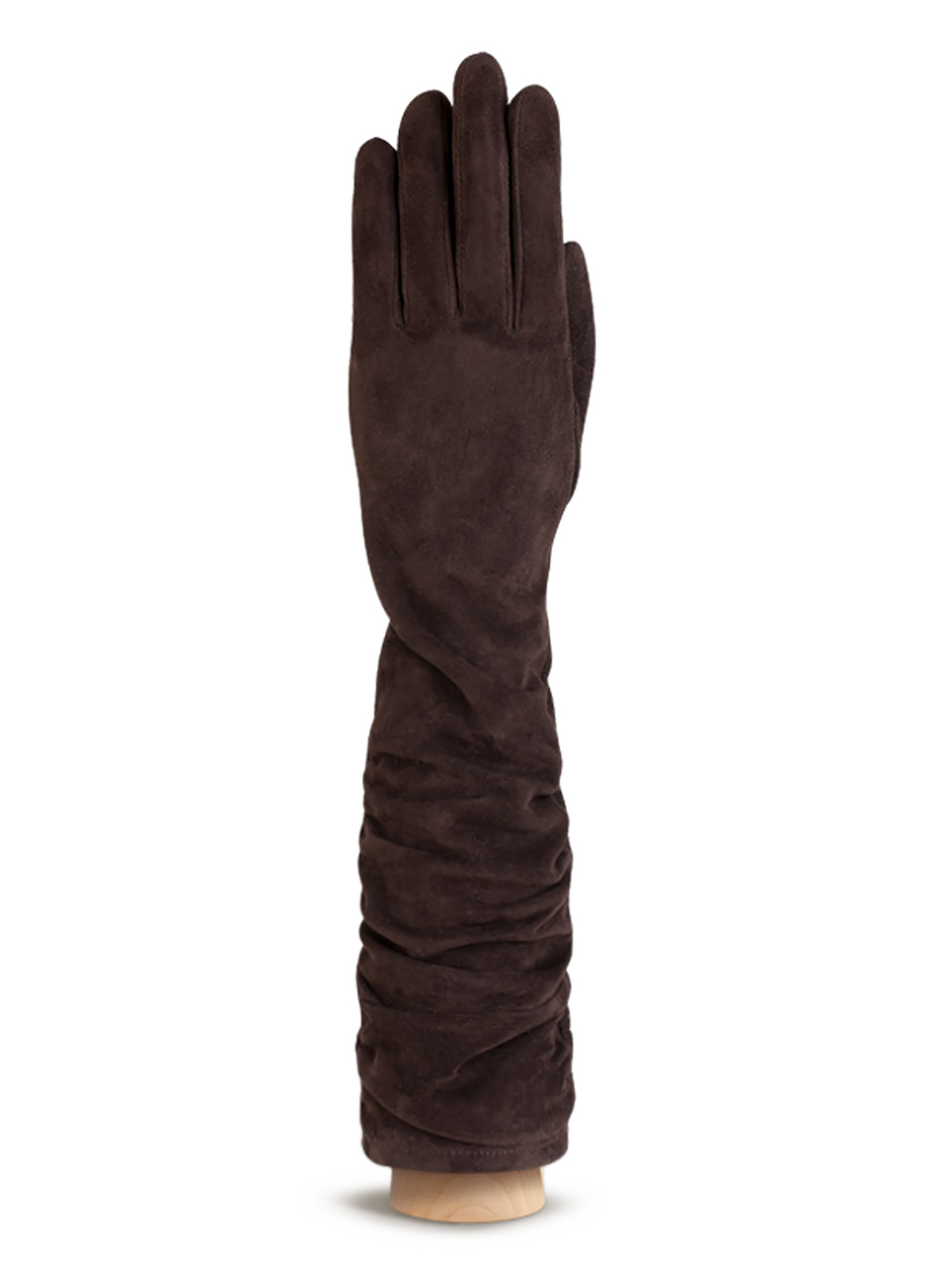 Перчатки торговой марки ELEGANZZA производства Италия выполнены из натуральной замши темно-коричневого цвета. Имеет декоративную сборку на манжете. Подкладка: искусственный шелк. Длина манжеты от нижней точки большого пальца до края перчаток - 235 см . Пальцы - средние