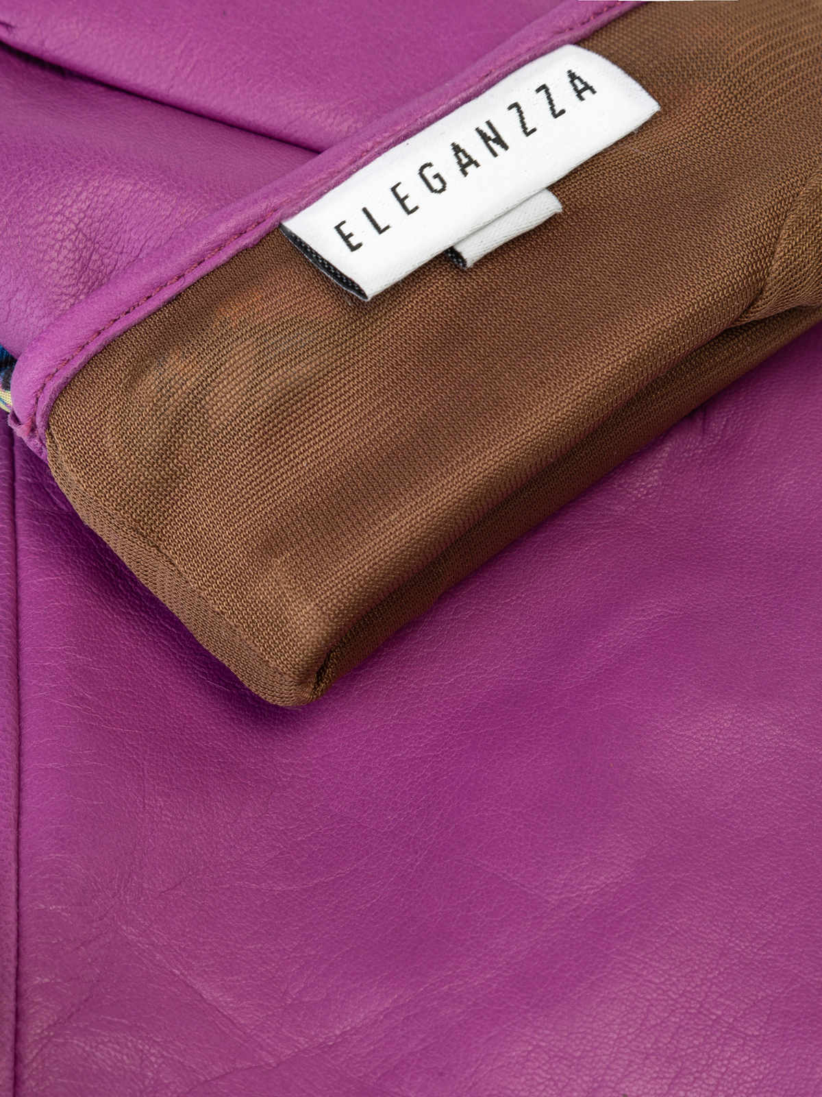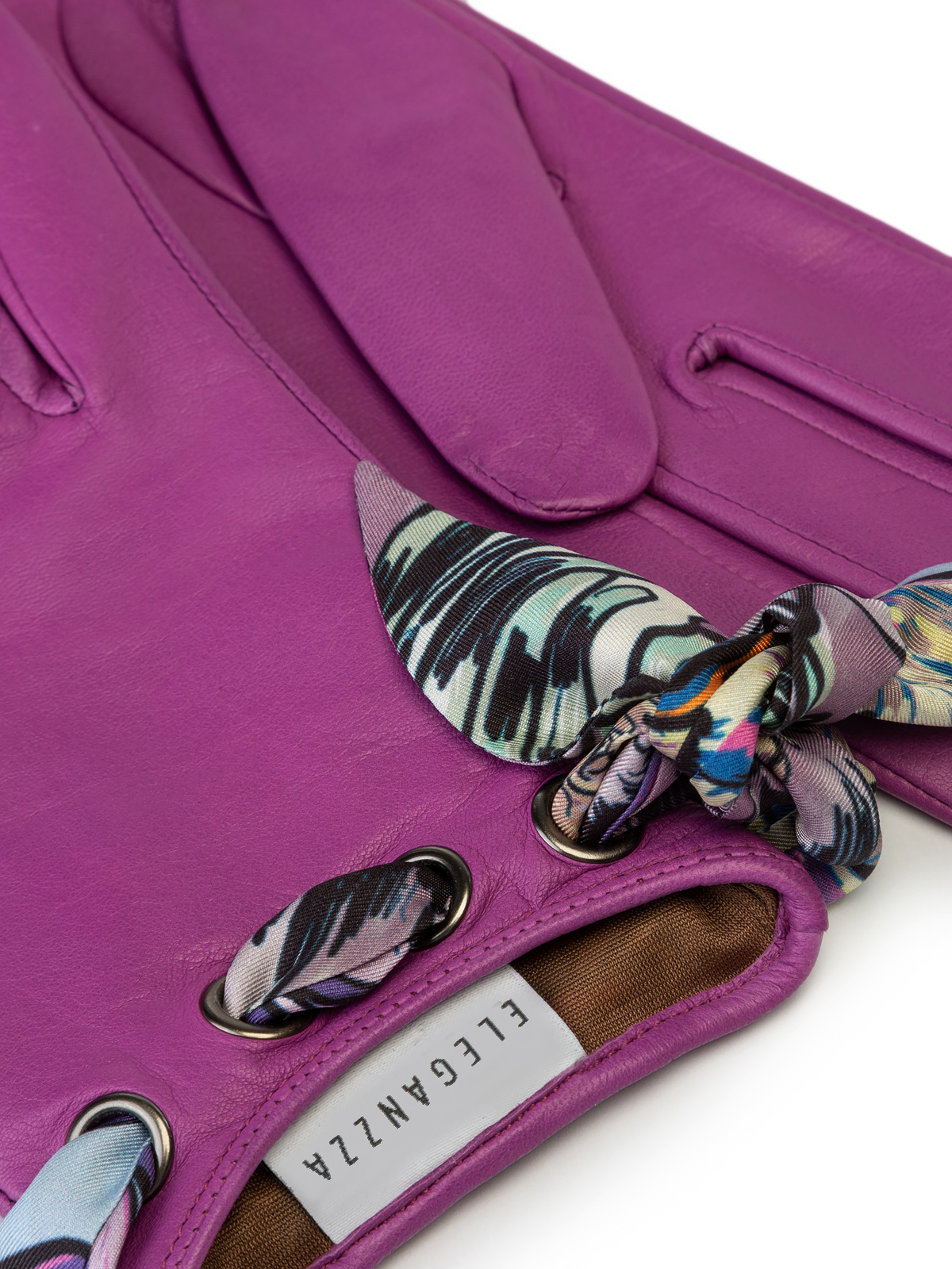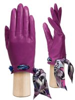 Перчатки женские торговой марки ELEGANZZA из натуральной кожи ягненка производства Италии. Подкладка: искусственный шелк. Отделка - край манжеты украшен декоративными люверсами через которые проходит шелковый платок (съёмный). Длина манжеты от нижней точки большого пальца до края перчаток - 25 см. Длина пальцев - средняя.