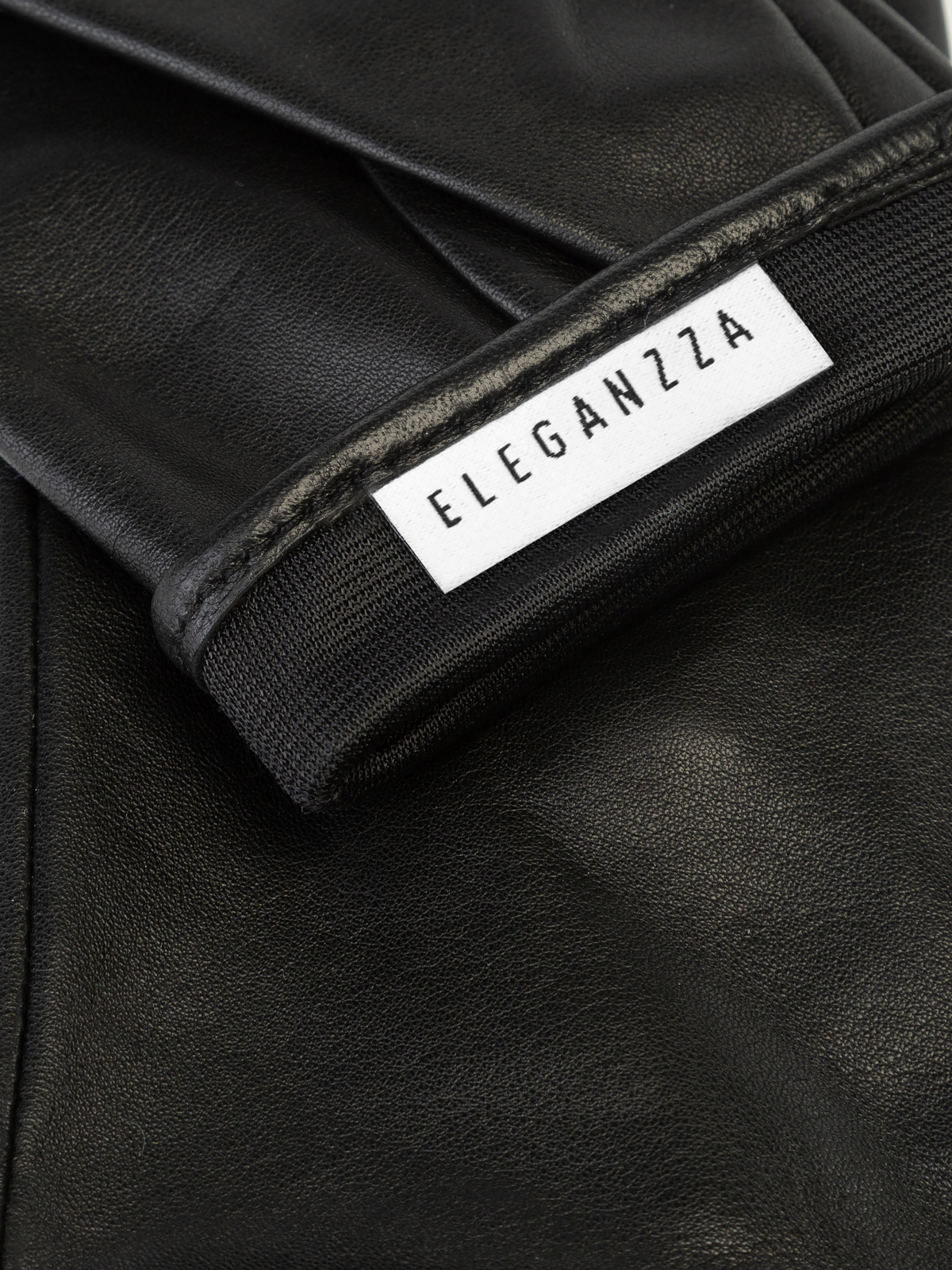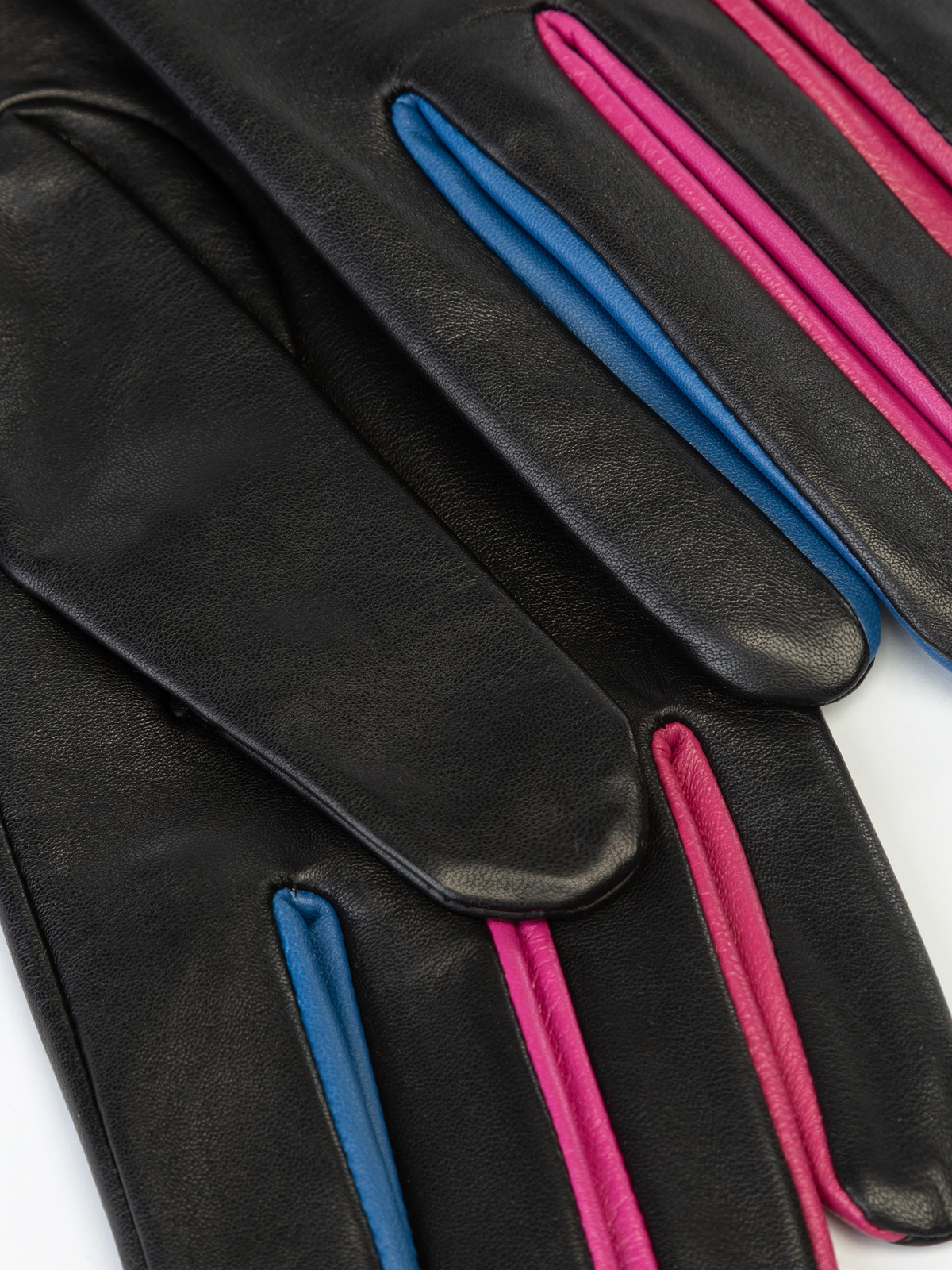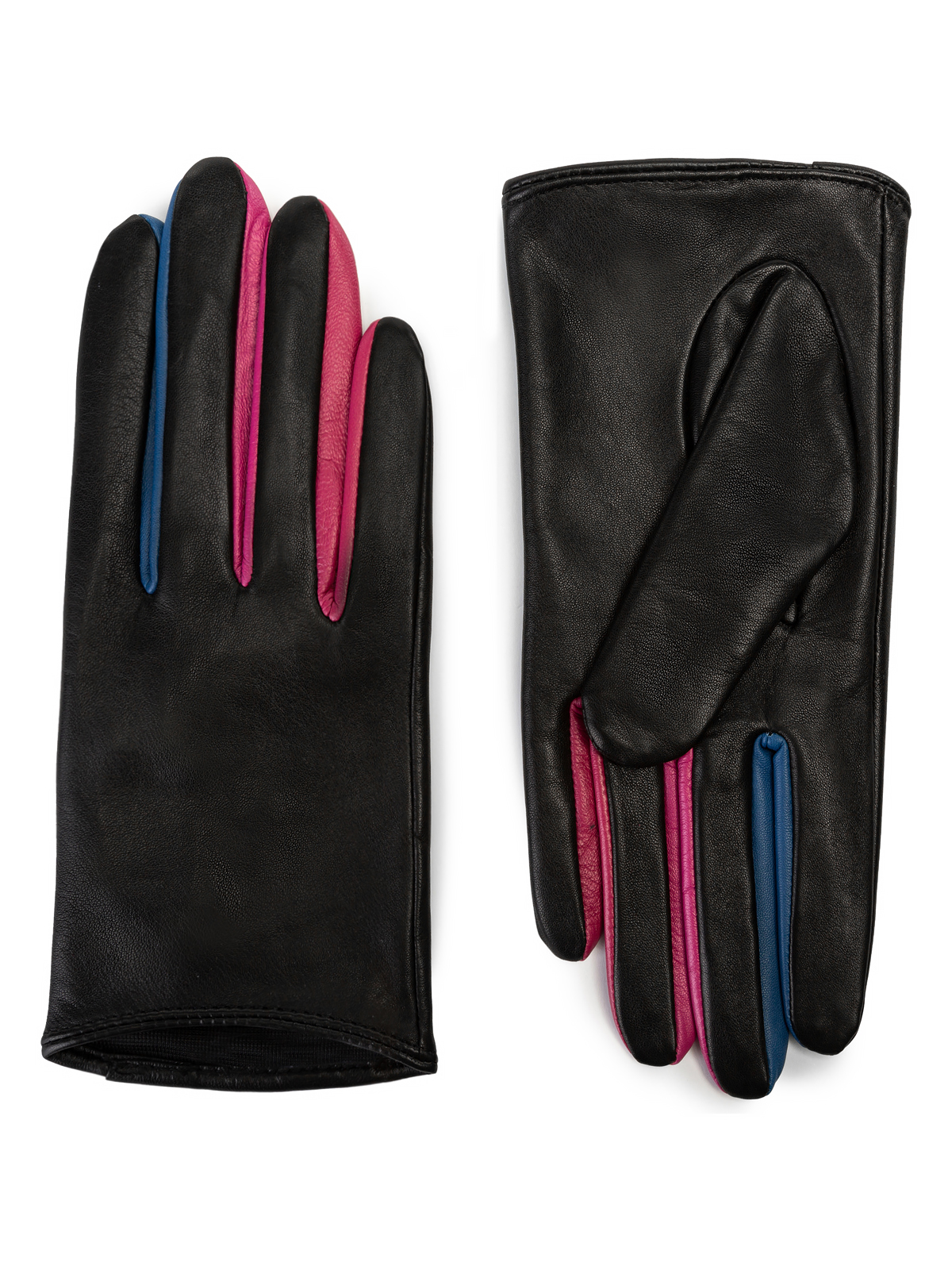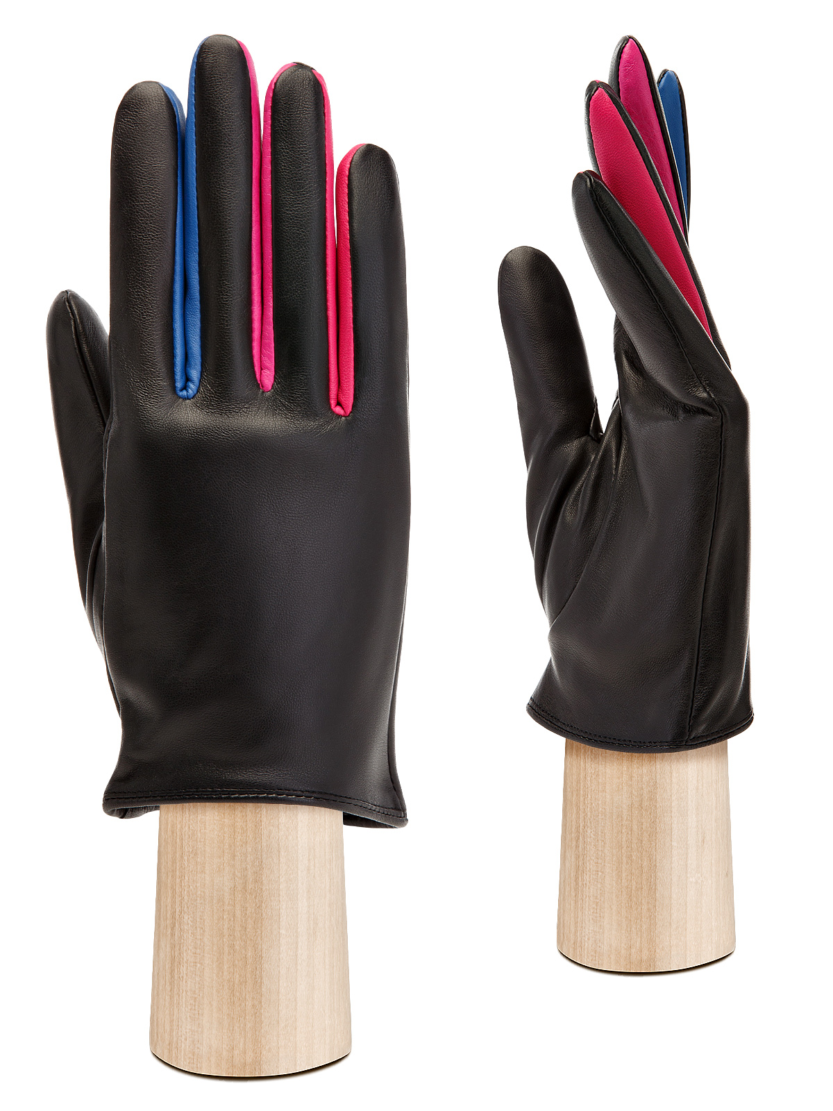 Перчатки женские торговой марки ELEGANZZA из натуральной кожи ягненка. Производство Китай. Подкладка: шелк. Отделка: стрелки между пальцев выполнены из разных ярких цветов кожи. Длина манжеты от нижней точки большого пальца до края перчаток - 3 см. Длина пальцев - средняя.