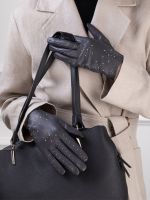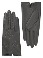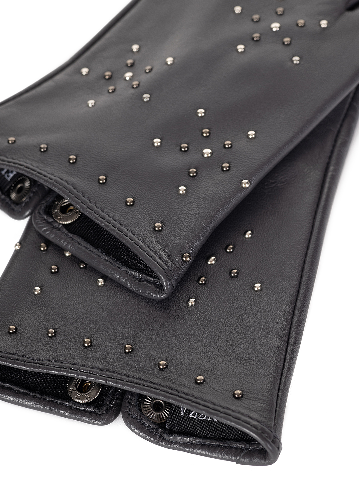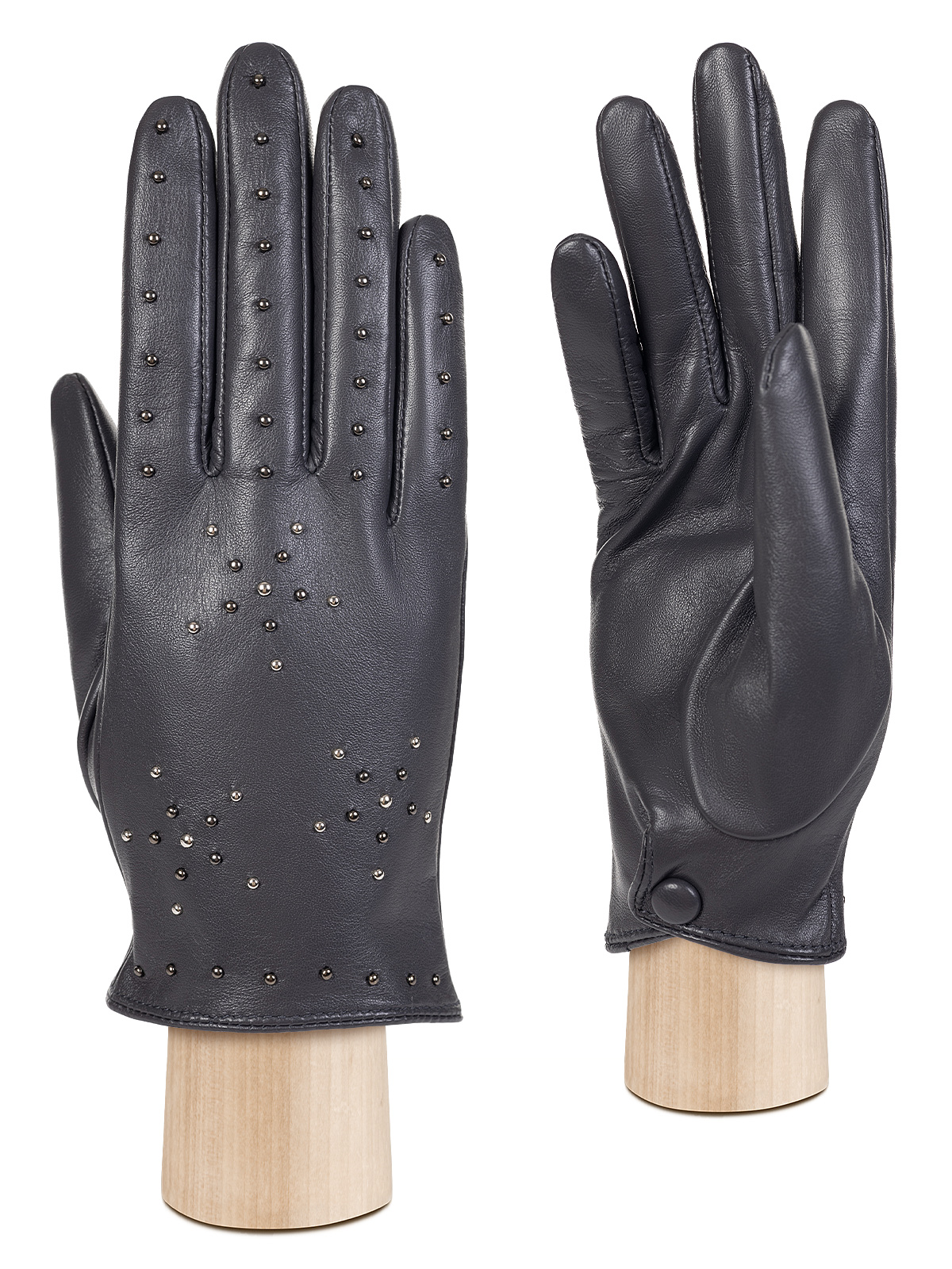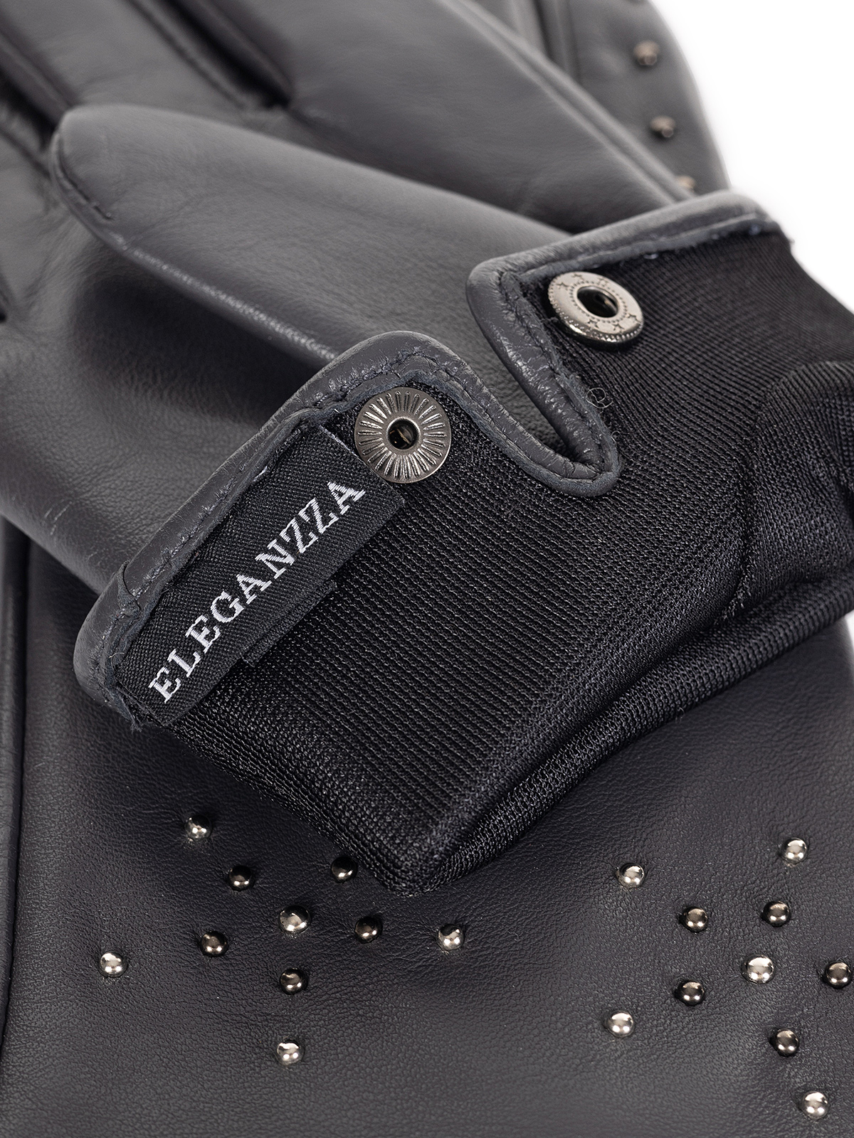 Перчатки женские торговой марки ELEGANZZA производства Китай изготовлены из натуральной кожи ягненка. Подкладка: шелк. Отделка - декоративные металлические хольнитены разного цвета по всей лицевой части перчатки. На ладонной части рабочая кнопка обтянута кожей. Длина манжеты от нижней точки большого пальца до края перчаток - 3 см. Длина пальцев - средняя.
