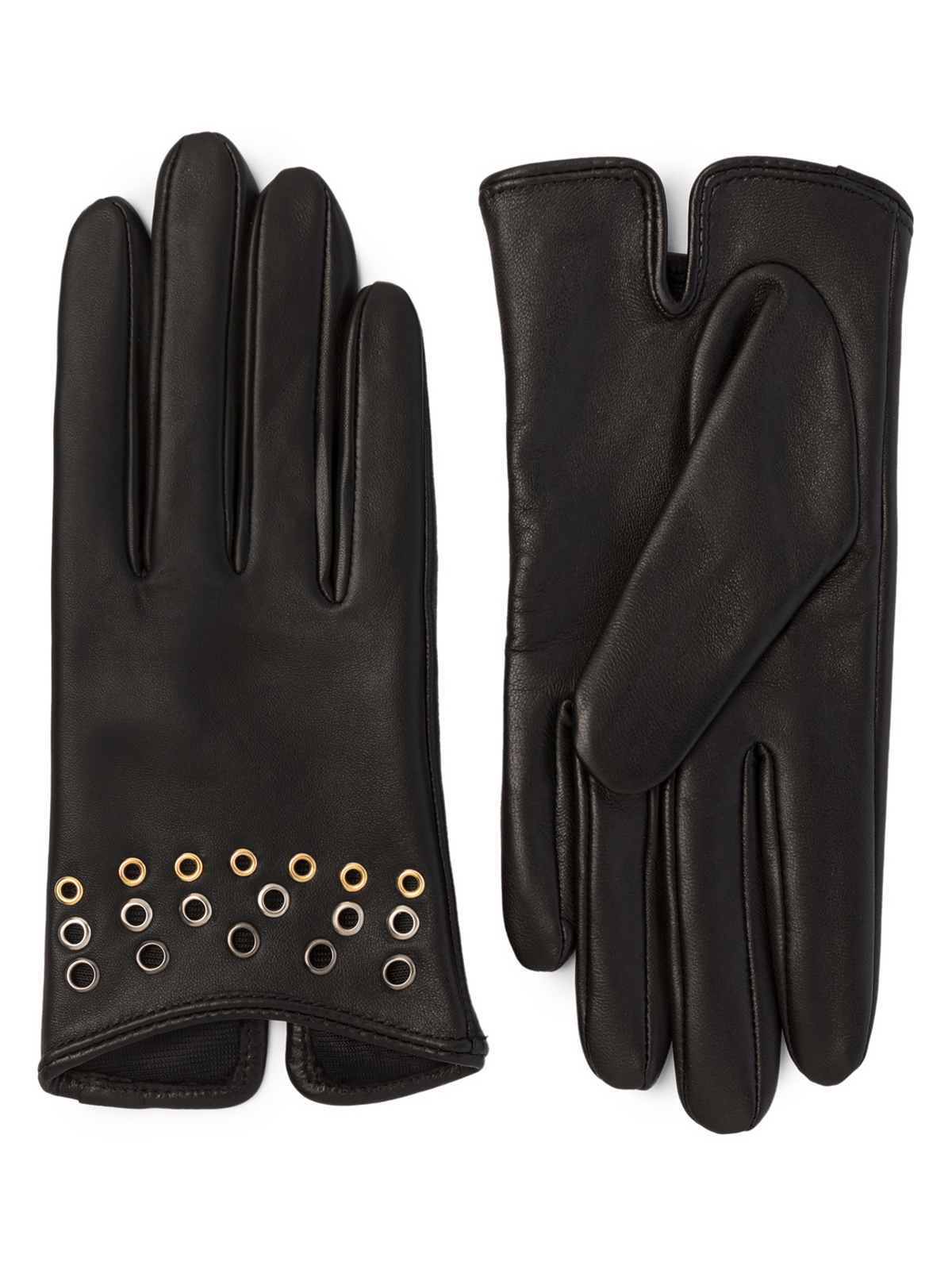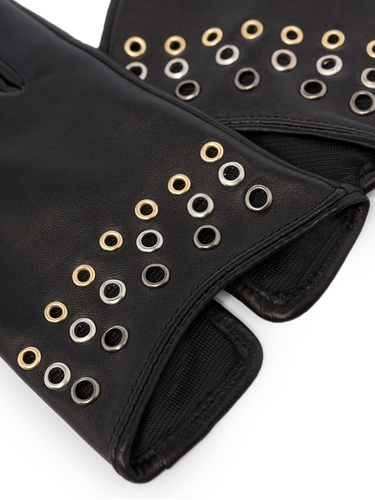 Перчатки женские торговой марки LABBRA производства Китай выполнены из натуральной кожи ягнёнка. Подкладка: шелк. Отделка - металлические люверсы на лицевой части имитирующие браслет. Длина манжеты от нижней точки большого пальца до края перчаток - 2 см. Длина пальцев - средняя.