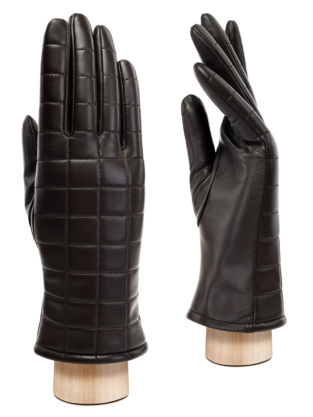 Перчатки женские торговой марки ELEGANZZA из натуральной кожи ягненка. Производство Китай. Подкладка: 100% шерсть. Отделка – декоративная отстрочка в форме симметричных квадратов по всей лицевой части. Длина манжеты от нижней точки большого пальца до края перчаток - 5 см. Длина пальцев - средняя.