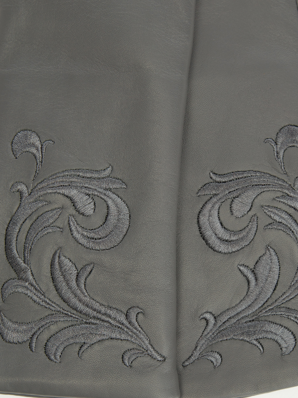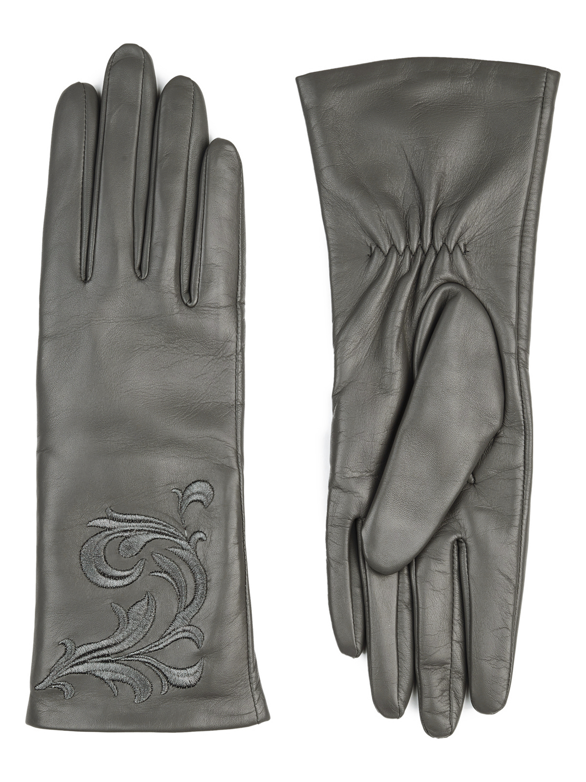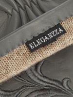 Перчатки женские торговой марки ELEGANZZA производства Китай изготовлены из натуральной кожи ягненка. Декоративная отделка - дизайнерская вензельная вышивка гладью в тон перчаток. Подкладка: 100% шерсть. Длина манжеты от нижней точки большого пальца до края перчаток - 7 см. Длина пальцев - средняя.