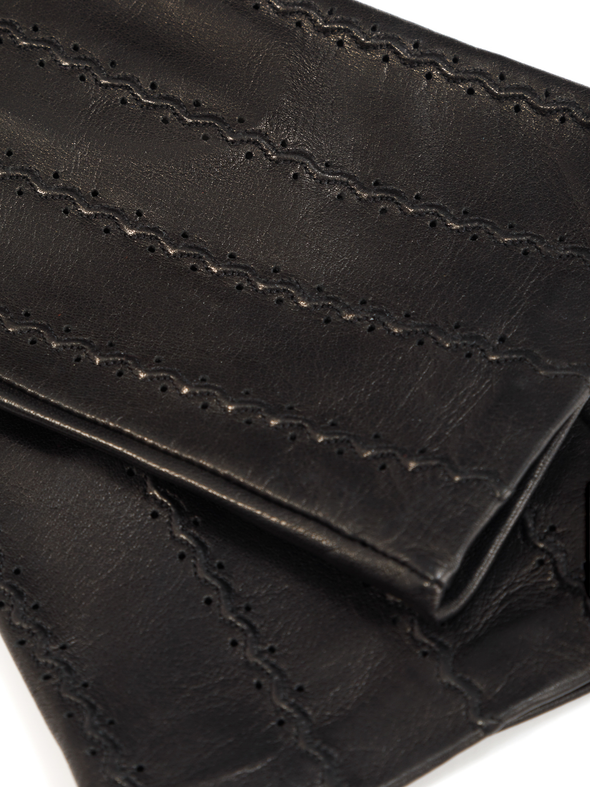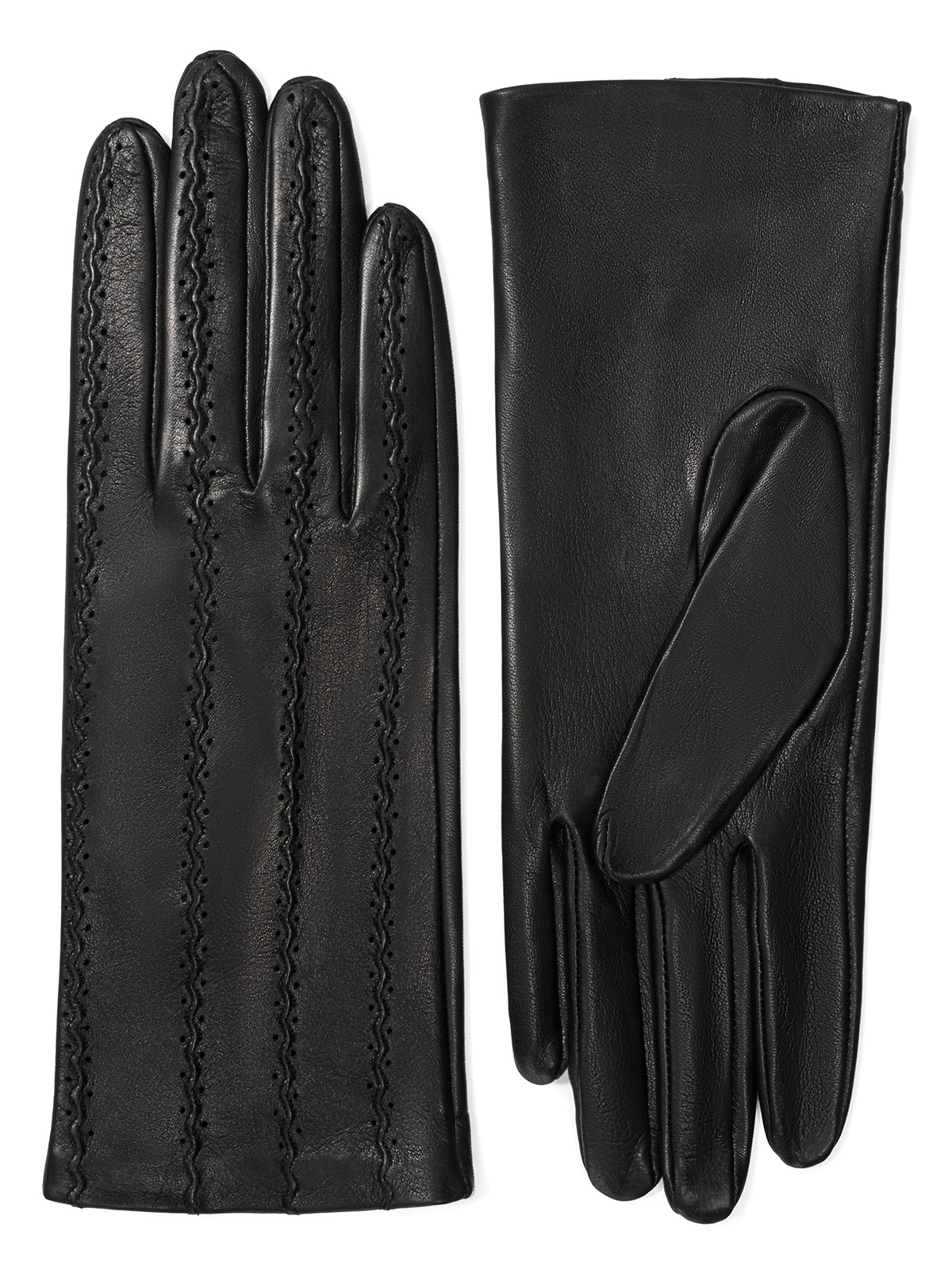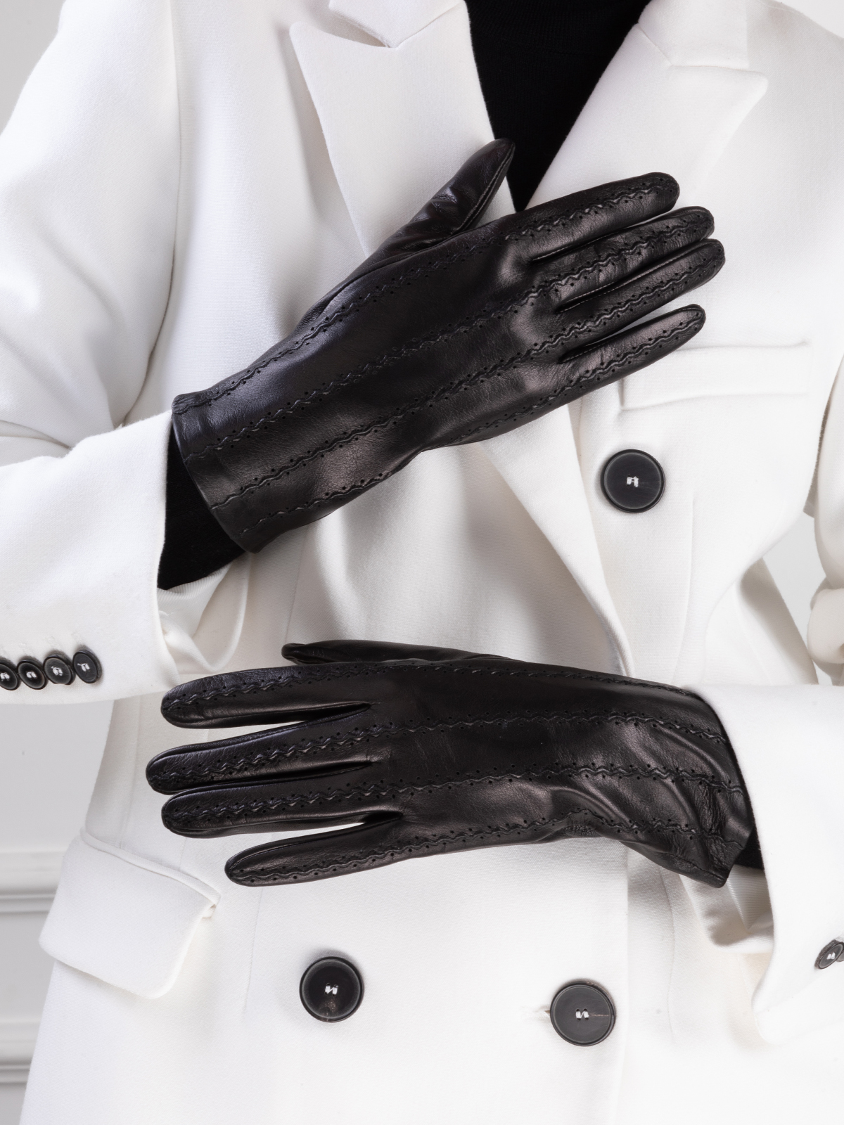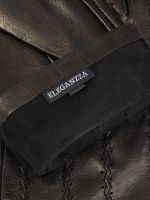 Перчатки женские торговой марки ELEGANZZA выполнены из натуральной кожи ягнёнка производства Италии. Без подкладки. Отделка - перфорация и декоративная отстрочка на лицевой стороне перчатки. Длина манжеты от нижней точки большого пальца до края перчаток составляет - 6 см. Длина пальцев - средняя.