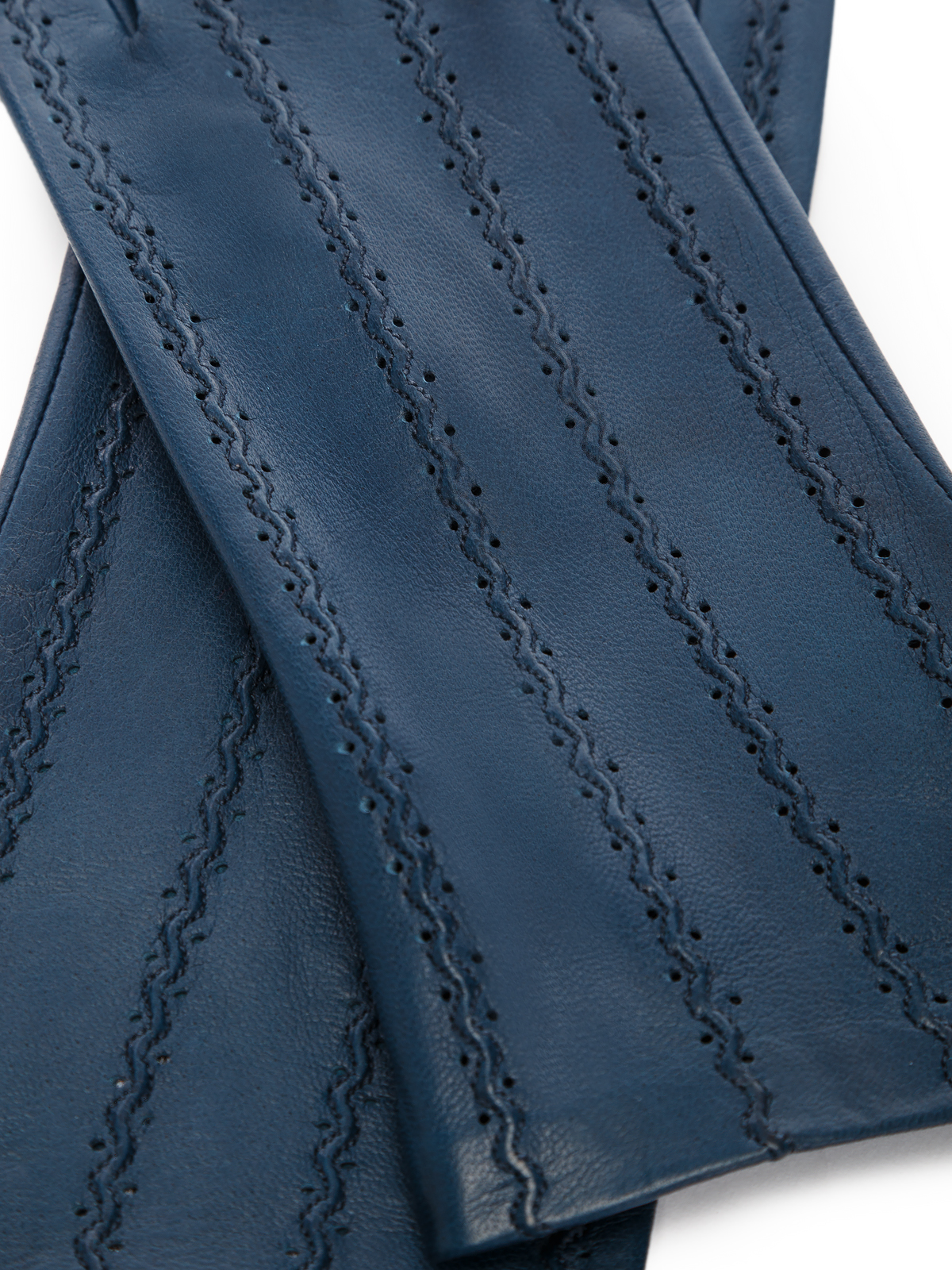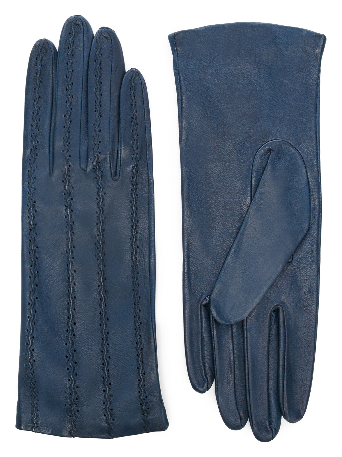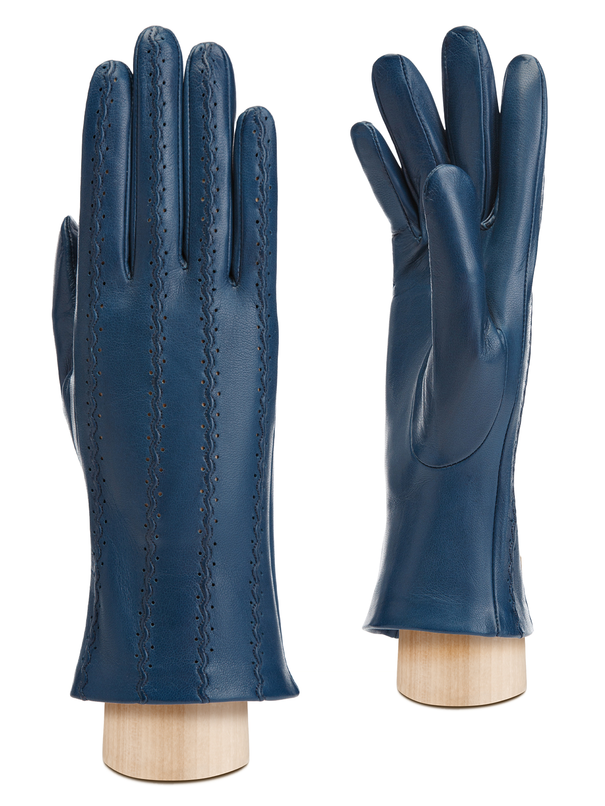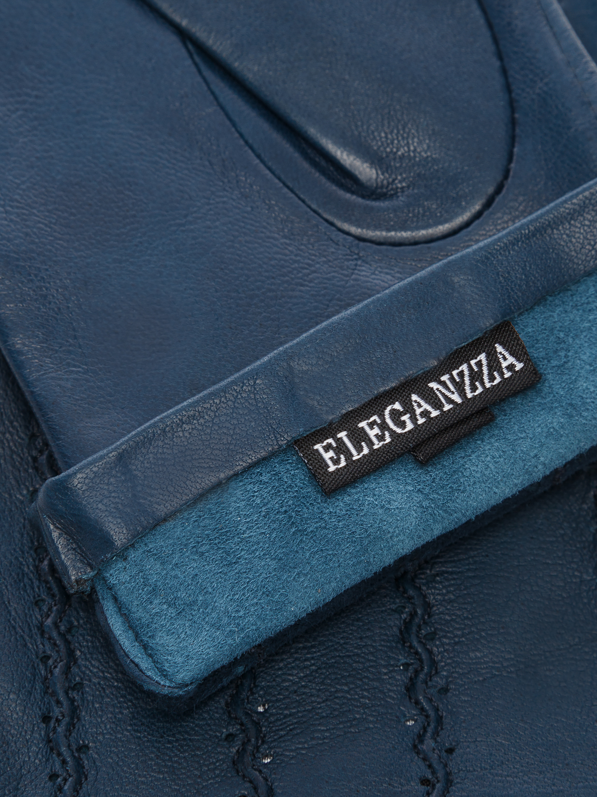 Перчатки женские торговой марки ELEGANZZA выполнены из натуральной кожи ягнёнка производства Италии. Без подкладки. Отделка - перфорация и декоративная отстрочка на лицевой стороне перчатки. Длина манжеты от нижней точки большого пальца до края перчаток составляет - 6 см. Длина пальцев - средняя.
