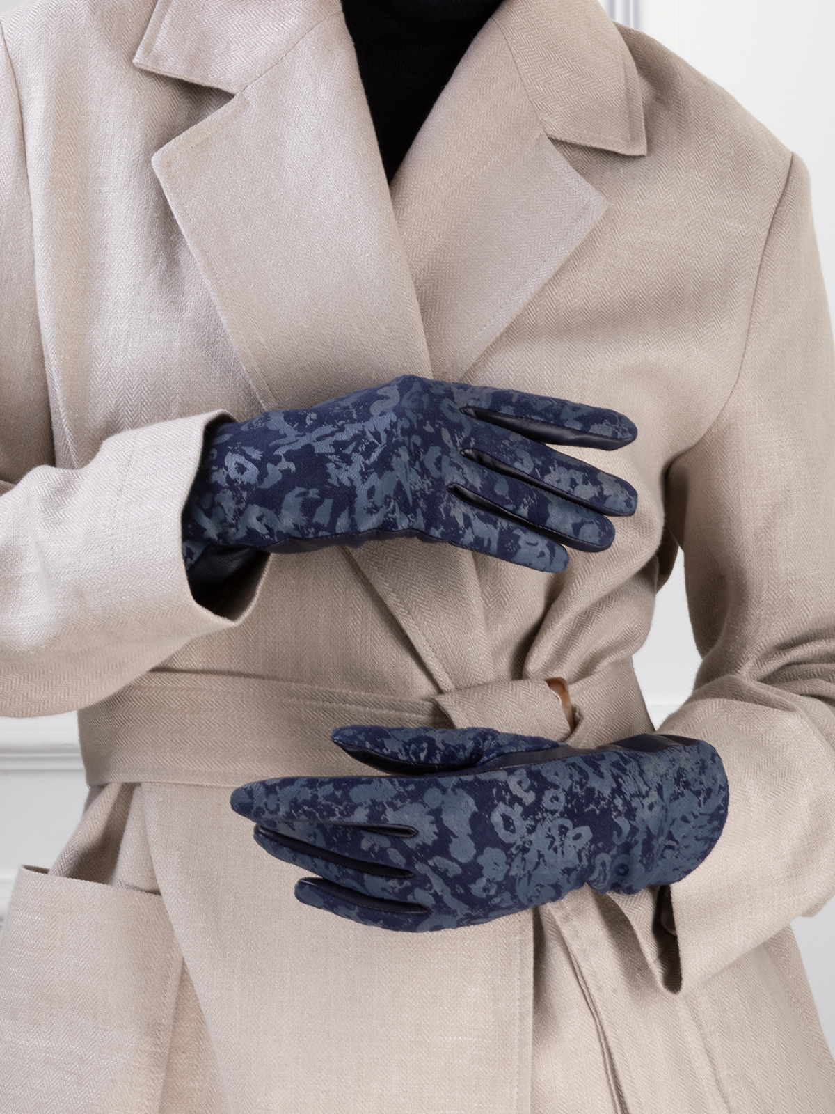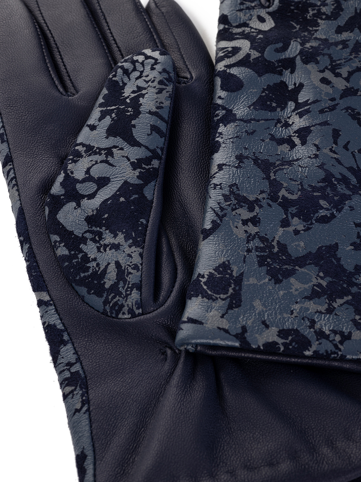 Перчатки женские торговой марки ELEGANZZA из натуральной кожи ягненка. Производство Италия. Подкладка: 85% шерсть 15% кашемир. Лицевая сторона перчатки выполнена из натурального велюра с дизайнерским принтом ладонная часть из натуральной кожи ягненка. Длина манжеты от нижней точки большого пальца до края перчаток - 7 см. Длина пальцев - средняя.