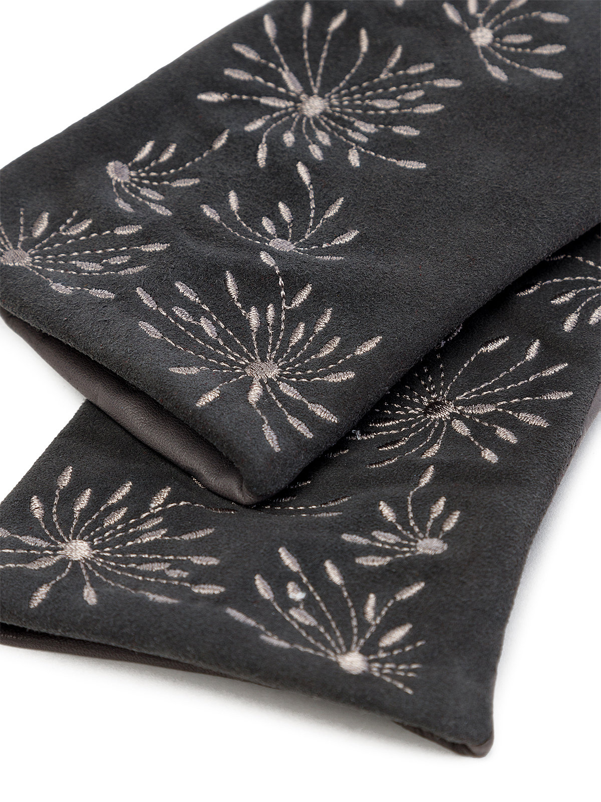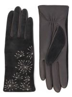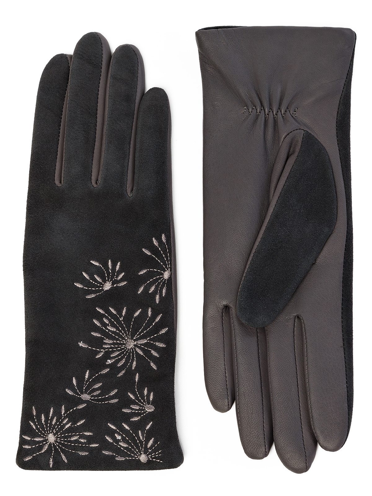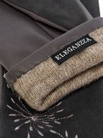 Перчатки женские торговой марки ELEGANZZA из натуральной итальянской кожи ягненка и натурального велюра на лицевой части. Подкладка: 85% шерсть + 15% кашемир. Отделка - декоративная вышивка в цветочной тематике. Длина манжеты от нижней точки большого пальца до края перчаток - 65 см. Длина пальцев - средняя.