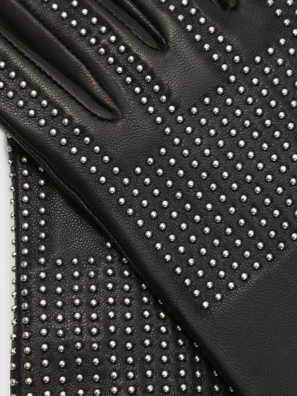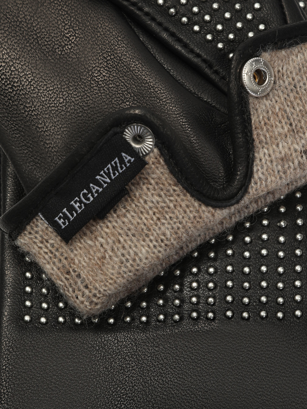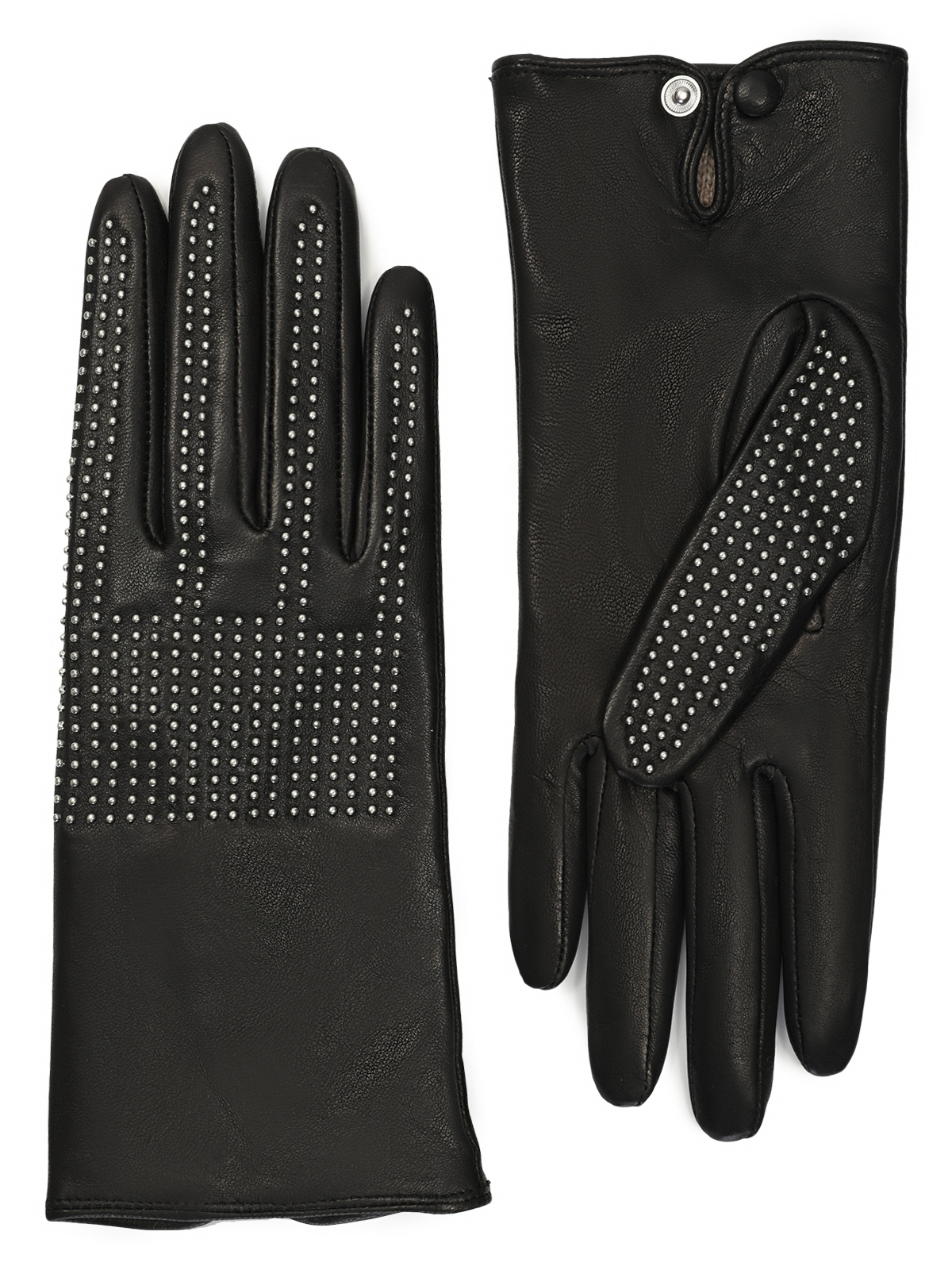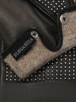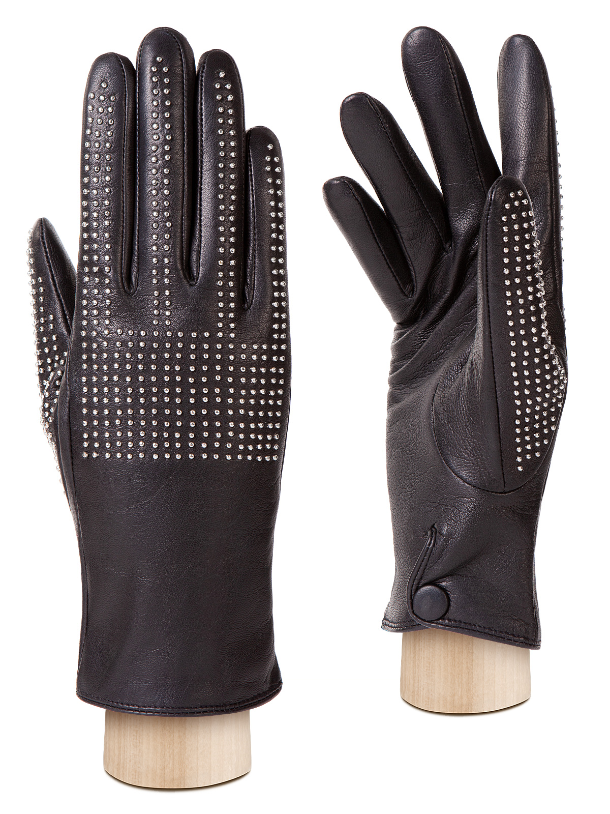 Перчатки торговой марки ELEGANZZA производства Италия выполнены из натуральной кожи ягненка. Подкладка: 85% шерсть 15% кашемир. Отделка - геометрический орнамент выполненный из металлических хольнитенов в том числе с наруней части большого пальца. Длина манжеты от нижней точки большого пальца до края перчаток - 55 см. Длина пальцев - средняя.
