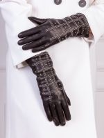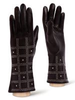 Перчатки торговой марки ELEGANZZA производства Италия выполнены из натуральной кожи ягненка. Подкладка: 85% шерсть 15% кашемир. Отличительная особенность перчатки - выполнена из одного куска кожи без шва по указательному пальцу. Отделка - геометрический орнамент выполненный из металлических хольнитенов. Длина манжеты от нижней точки большого пальца до края перчаток - 95 см. Длина пальцев - средняя.