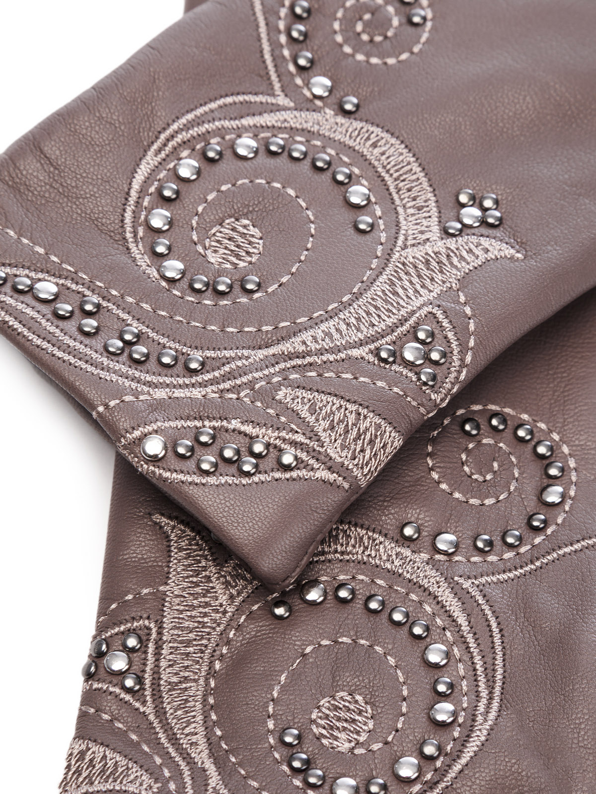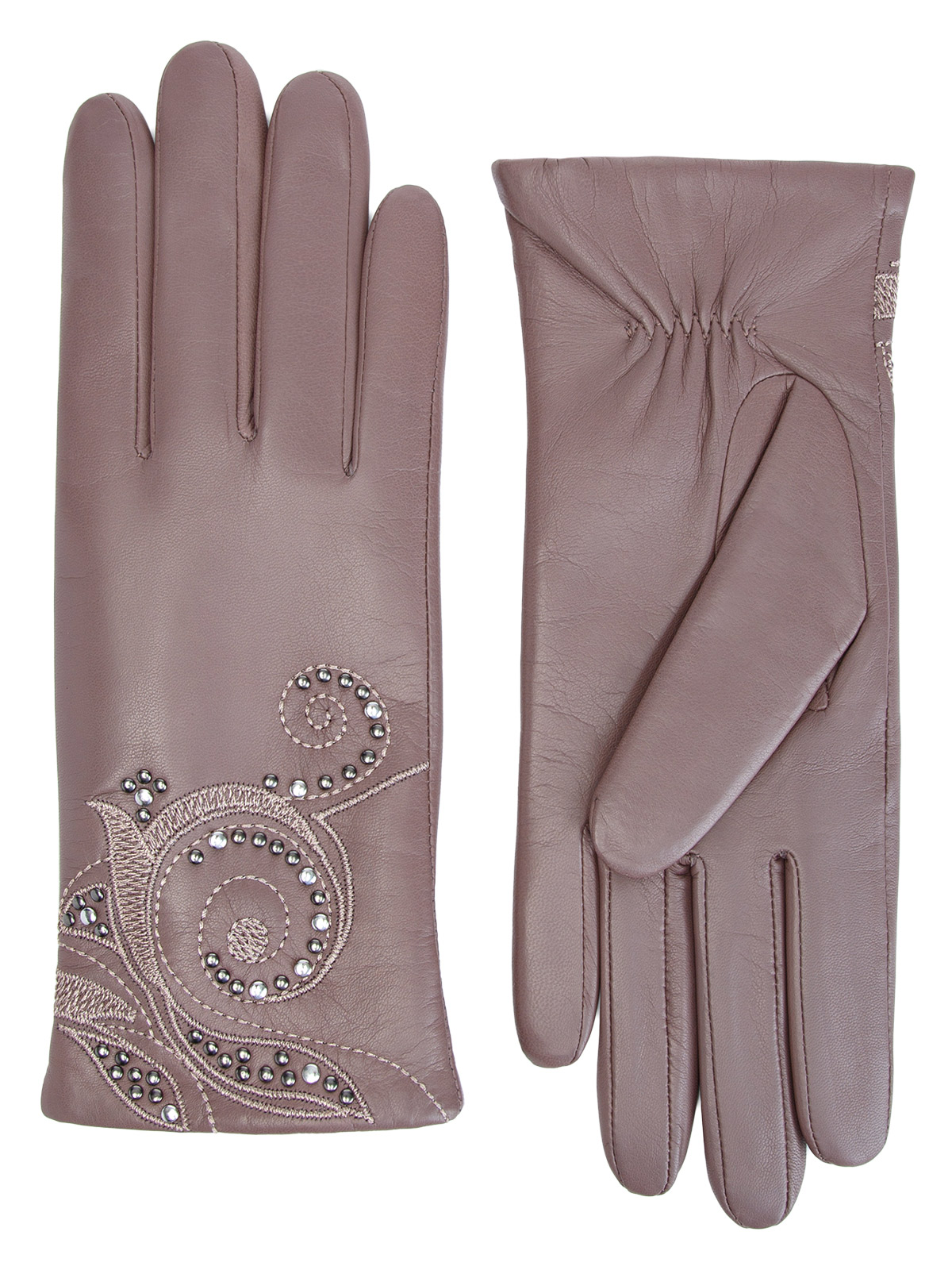 Перчатки торговой марки ELEGANZZA выполнены из натуральной кожи ягненка производства Италии. Подкладка: 85% шерсть 15% кашемир. Отделка - декоративная вензельная вышивка украшенная металлическими хольнитенами по лицевой стороне перчатке. Длина манжеты от нижней точки большого пальца до края перчаток - 55 см. Длина пальцев - средняя.