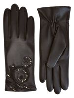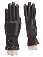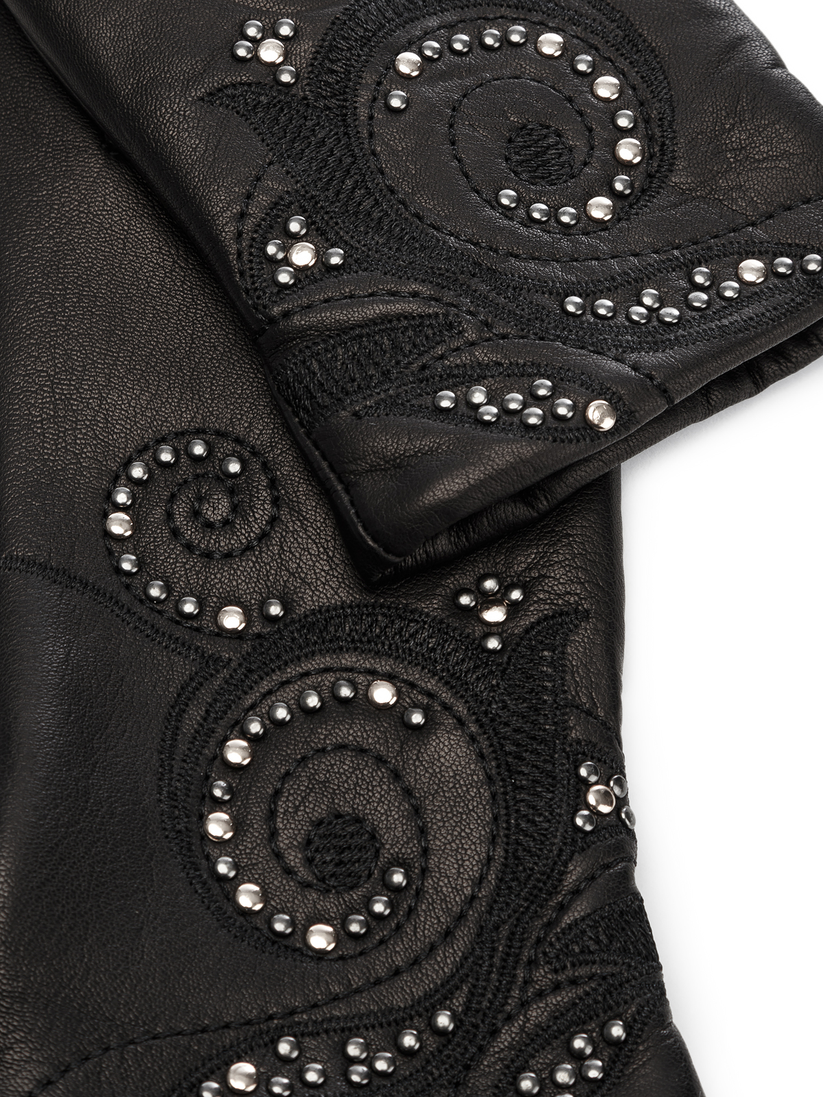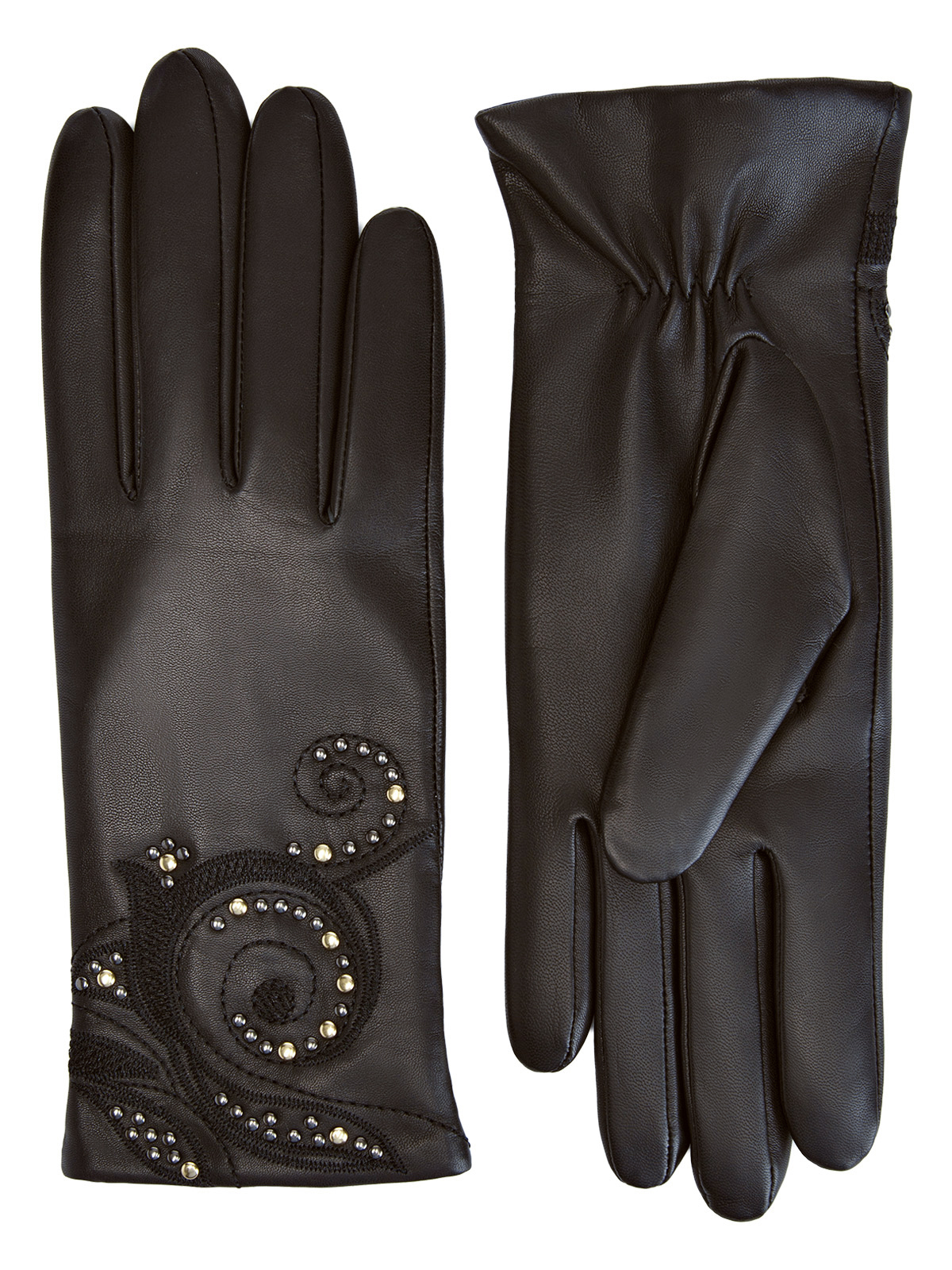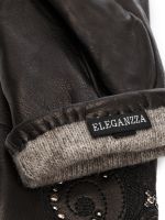 Перчатки торговой марки ELEGANZZA выполнены из натуральной кожи ягненка производства Италии. Подкладка: 85% шерсть 15% кашемир. Отделка - декоративная вензельная вышивка украшенная металлическими хольнитенами по лицевой стороне перчатке. Длина манжеты от нижней точки большого пальца до края перчаток - 55 см. Длина пальцев - средняя.
