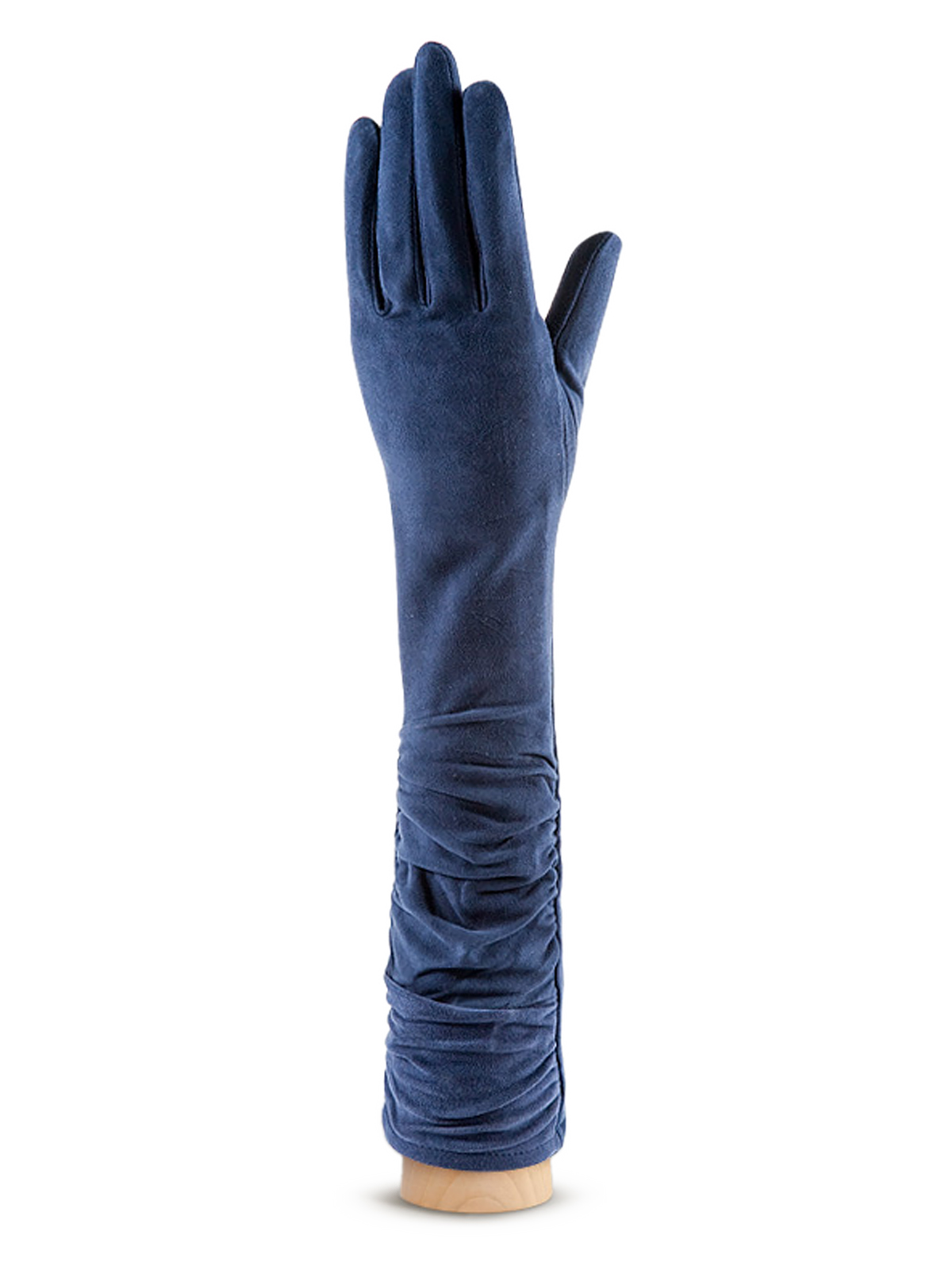 Перчатки торговой марки ELEGANZZA производства Италия выполнены из натуральной замши темно-синего цвета. Имеет декоративную сборку на манжете. Подкладка: 85% шерсть 15%кашемир. Длина манжеты от нижней точки большого пальца до края перчаток - 235 см. Пальцы - средне-удлиненные.