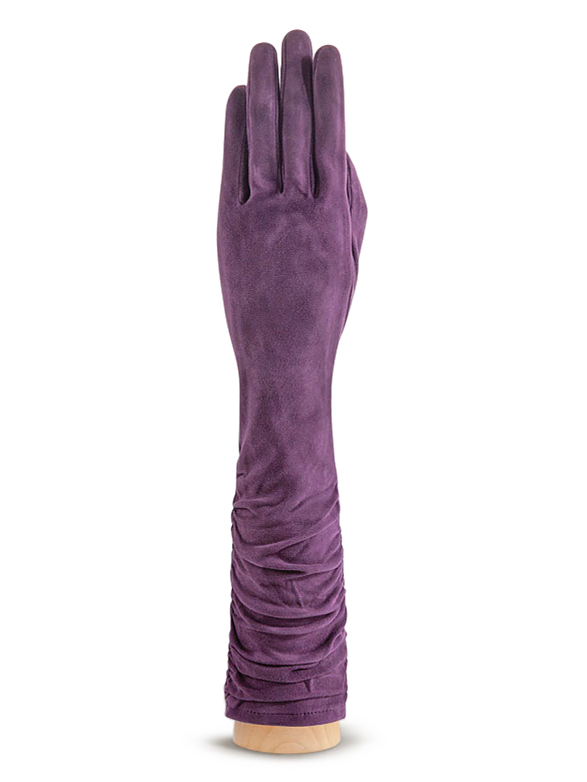 Перчатки торговой марки ELEGANZZA производства Италия выполнены из натуральной замши фиолетового цвета. Имеет декоративную сборку на манжете. Подкладка: 85% шерсть 15%кашемир. Длина манжеты от нижней точки большого пальца до края перчаток - 235 см. Пальцы - средне-удлиненные.