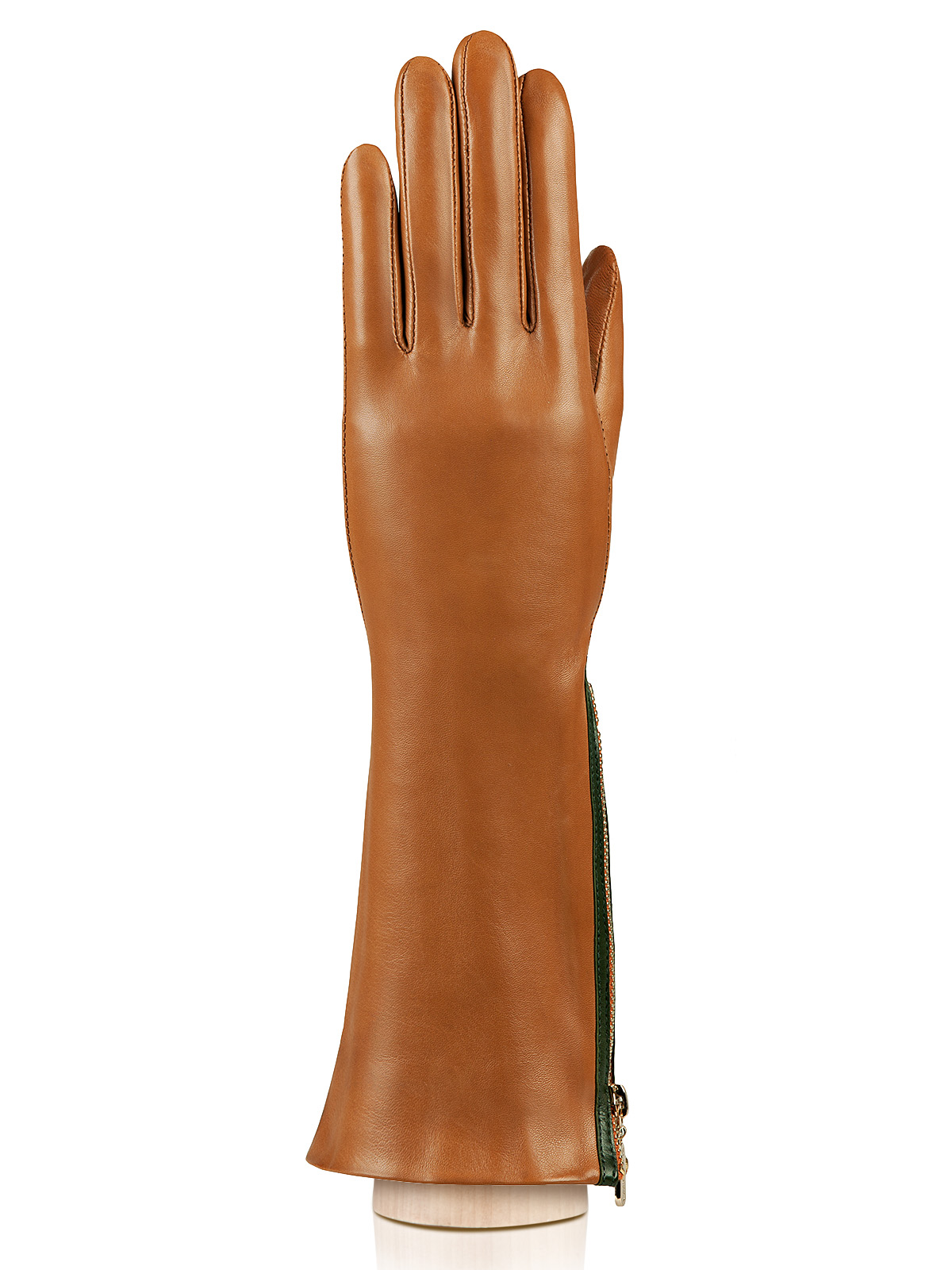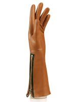 Перчатки женские торговой марки ELEGANZZA из натуральной кожи ягненка. Производство Италия. Подкладка: 85% шерсть + 15% кашемир. Отделка - вдоль манжеты контрастная вставка и рабочая молния. Длина манжеты от нижней точки большого пальца до края перчаток - 16 см. Длина пальцев - средняя.