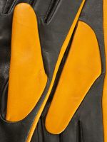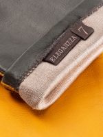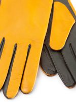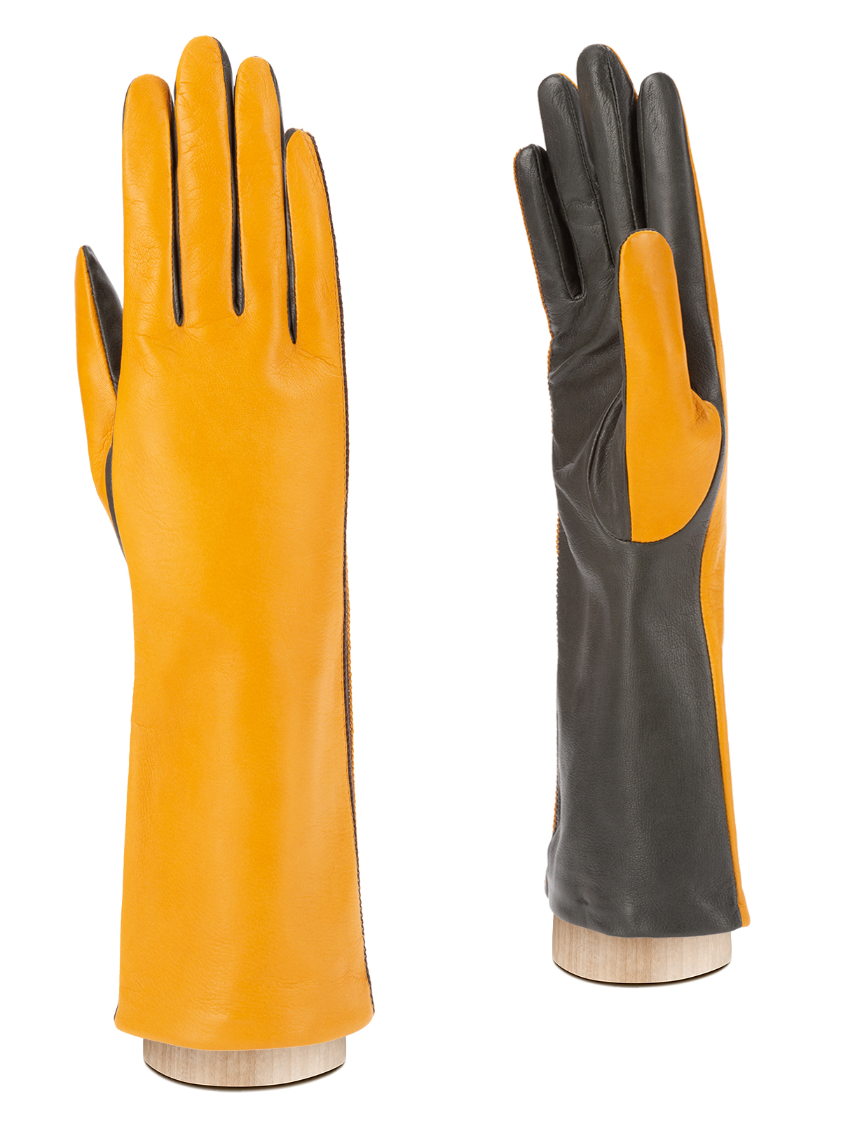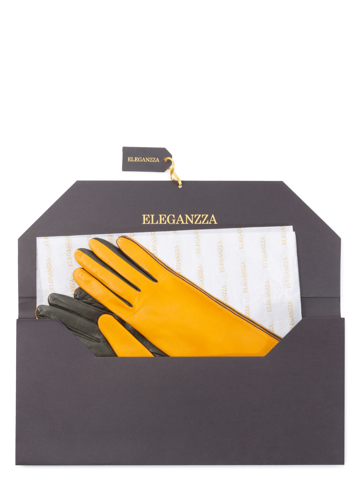 Перчатки женские торговой марки ELEGANZZA из натуральной кожи ягненка. Производство Филиппины. Двухцветная перчатка украшена контрастными отстрочками по всей длине вдоль мизинца. Подкладка: натуральный шёлк. Длина манжеты от нижней точки большого пальца до края перчаток - 15 см. Длина пальцев - средняя.