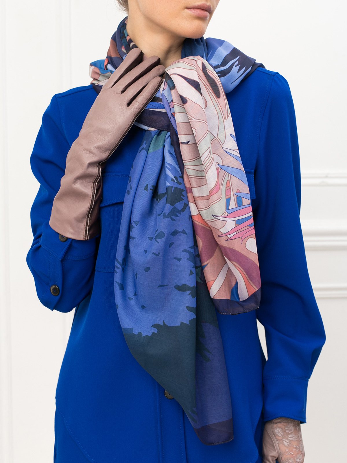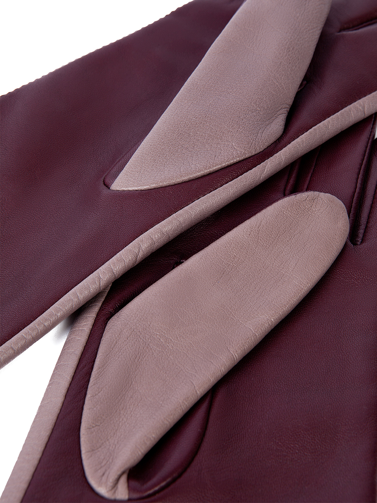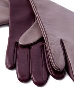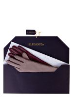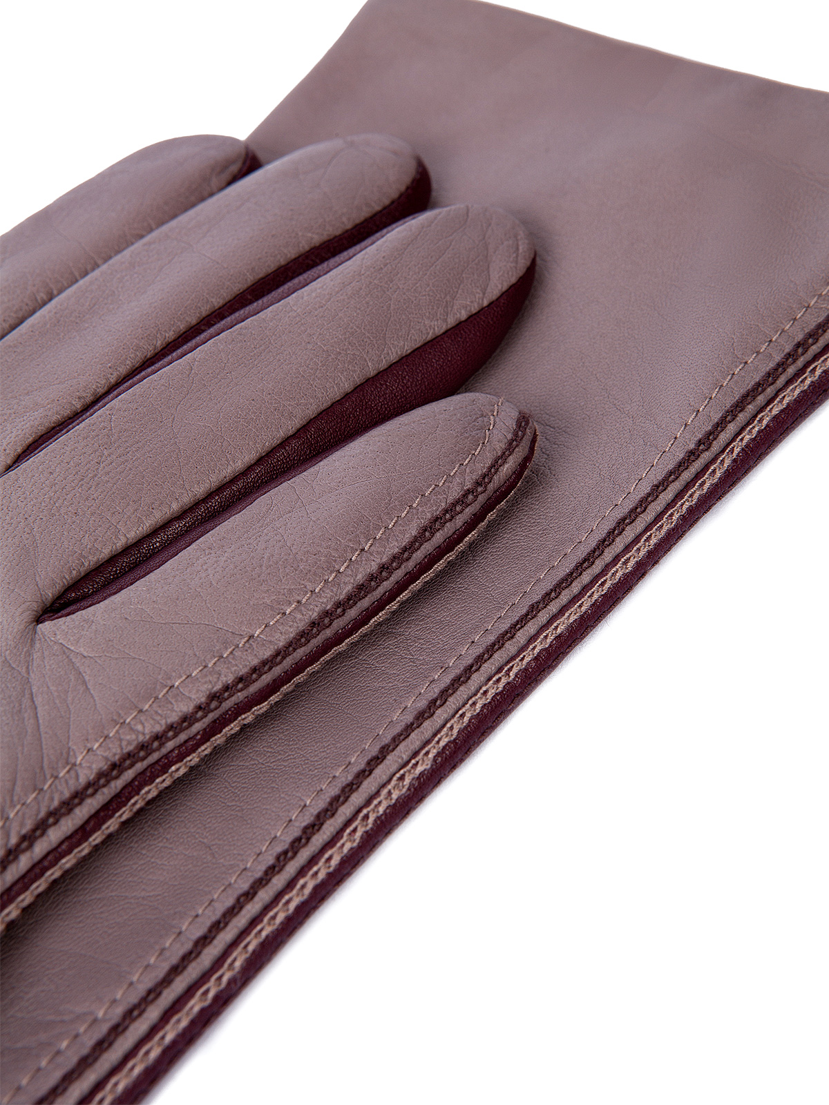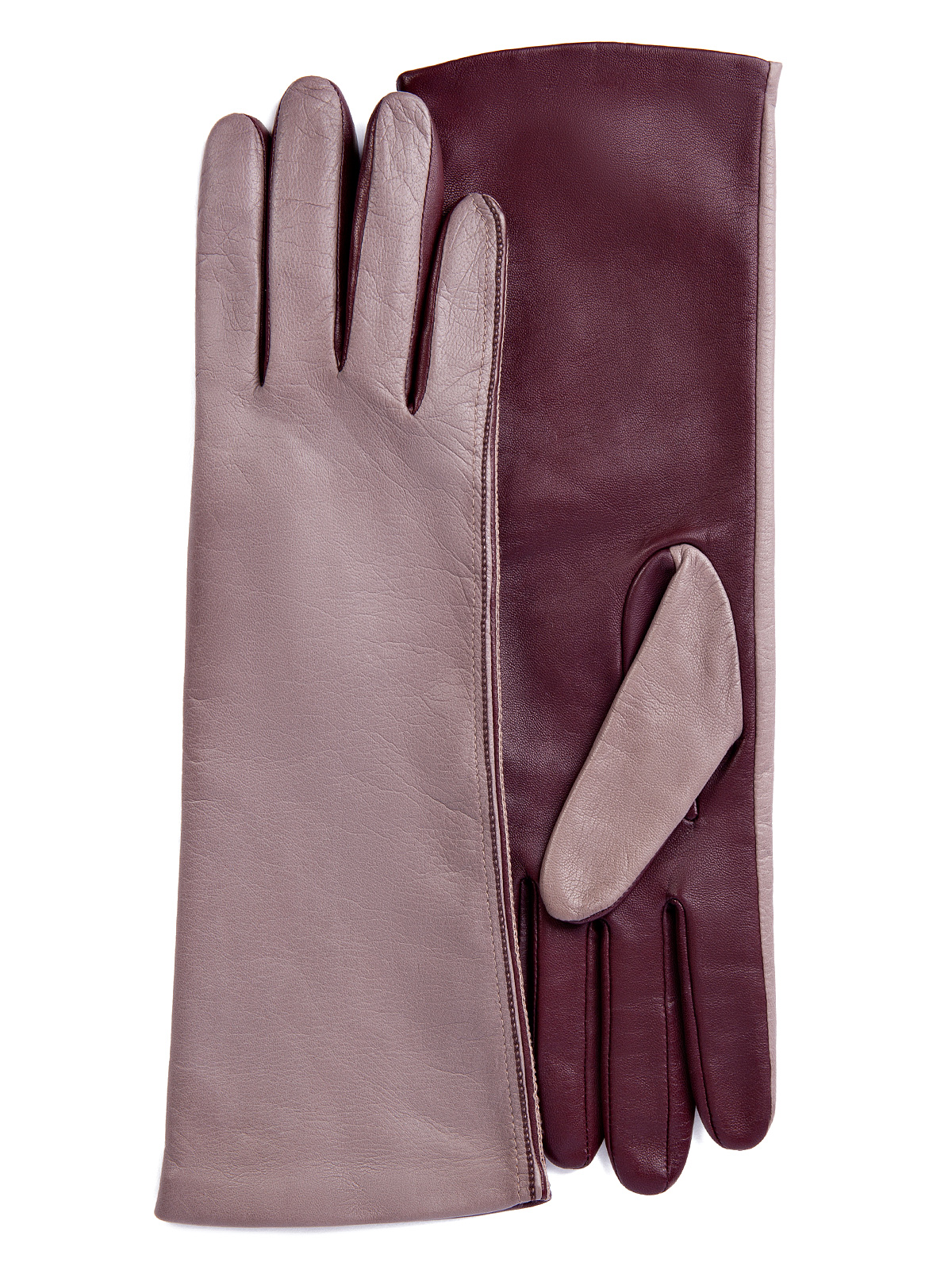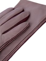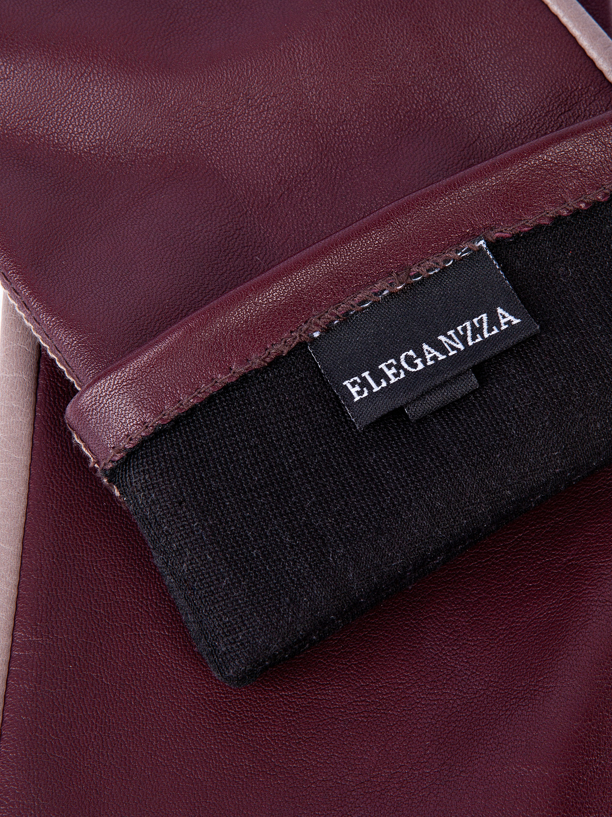 Перчатки торговой марки ELEGANZZA производства Филиппины изготовленный из натуральной кожи ягненка. Двухцветная перчатка украшена контрастными отстрочками по всей длине вдоль мизинца. Подкладка: натуральный шелк. Длина манжеты от нижней точки большого пальца до края перчаток - 14 см. Длина пальцев - средняя.