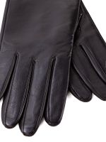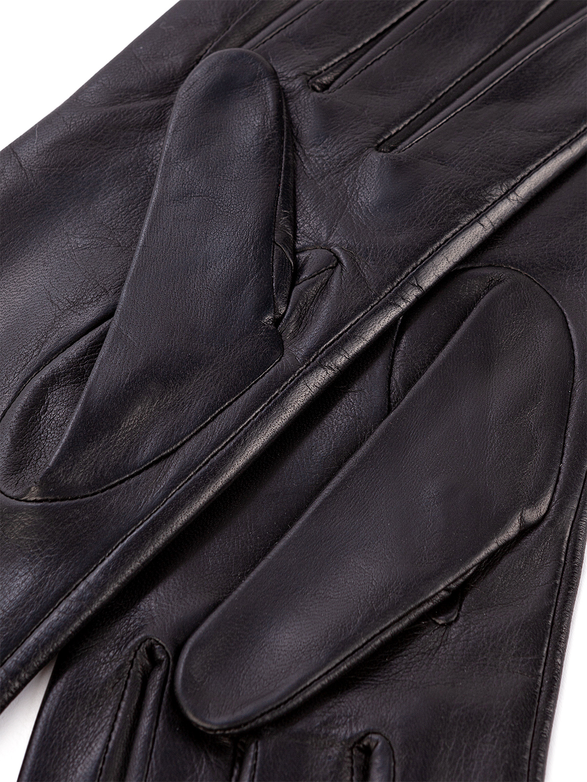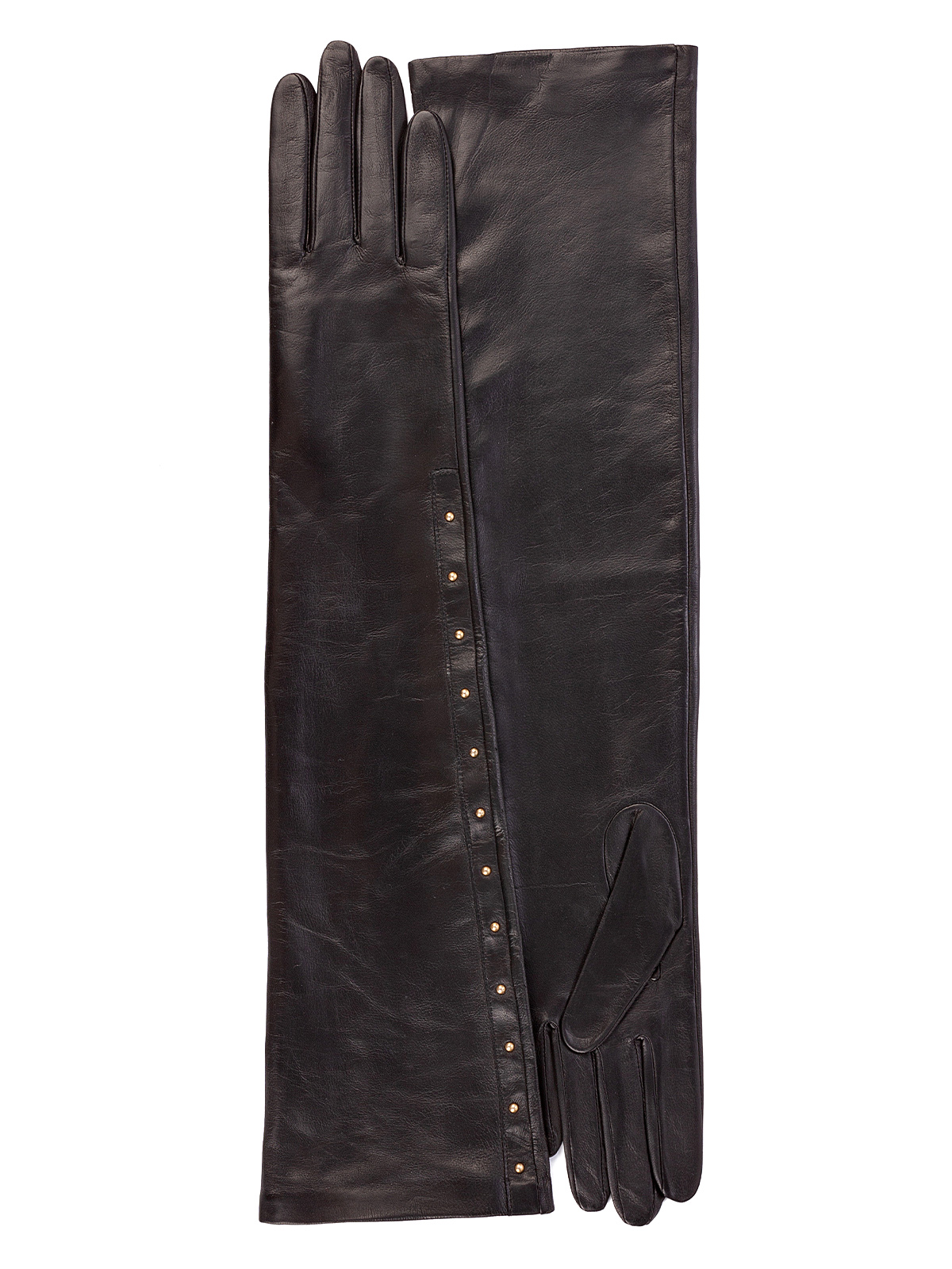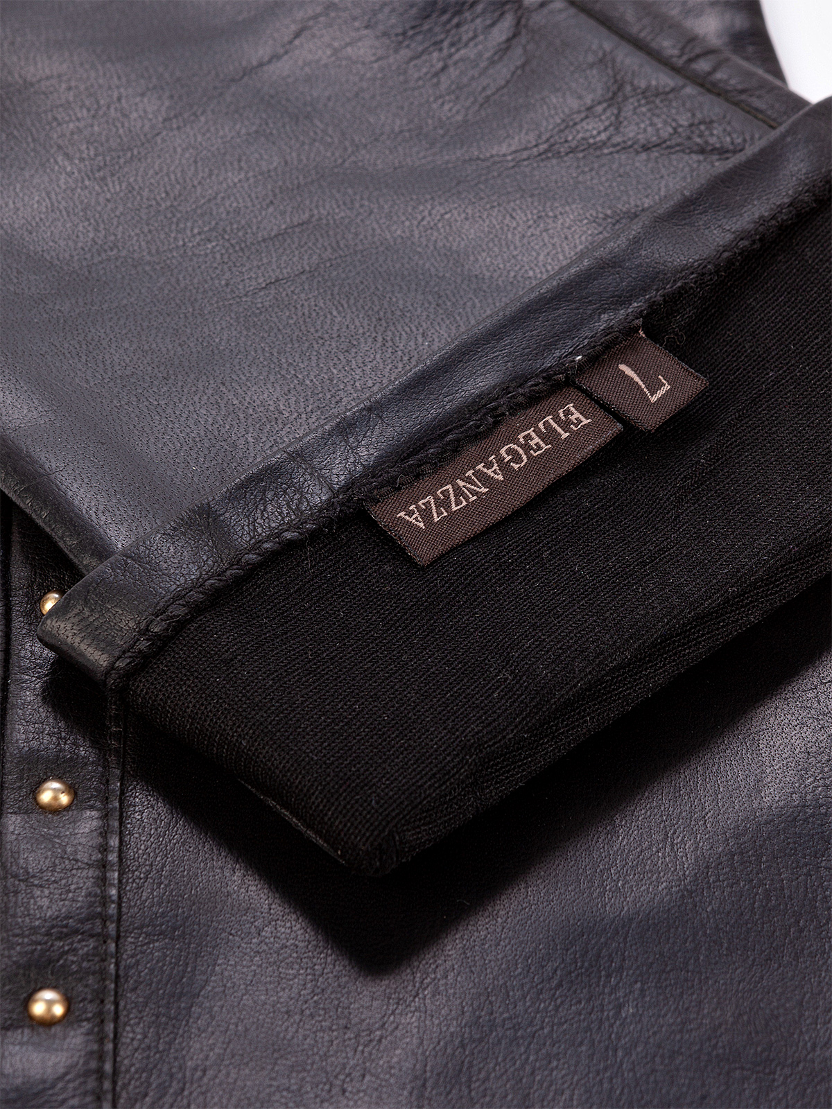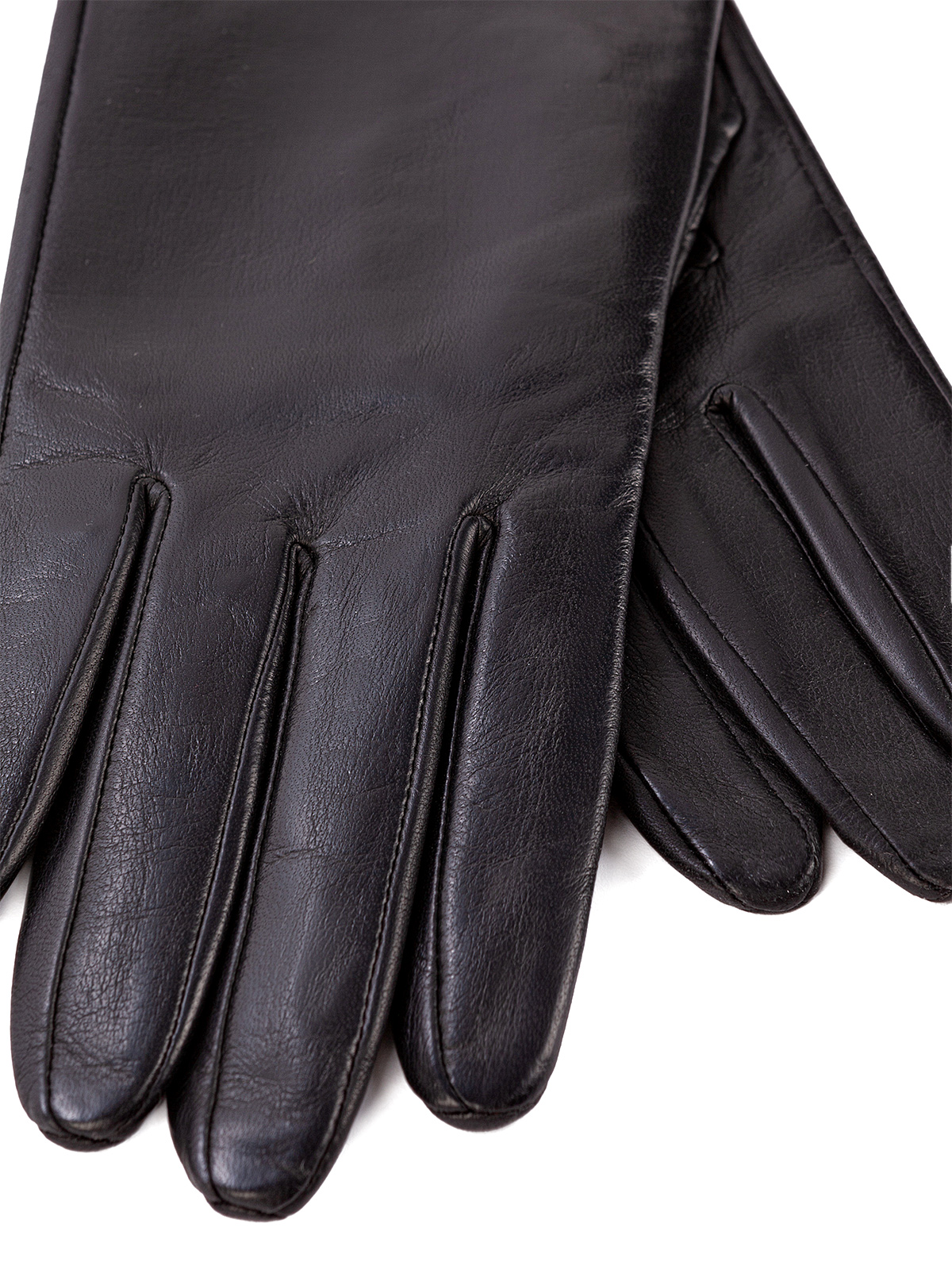 Перчатки торговой марки ELEGANZZA производства Филиппины. Изготовлены из натуральной кожи ягнёнка. Подкладка - натуральный шелк. Отделка - дополнительная тонкая полоска по всей длине перчатки по линии мизинца украшенная миниматюрными хольнитенами. Длина манжеты от нижней точки большого пальца до края перчаток составляет - 35 см. Длина пальцев - средняя.
