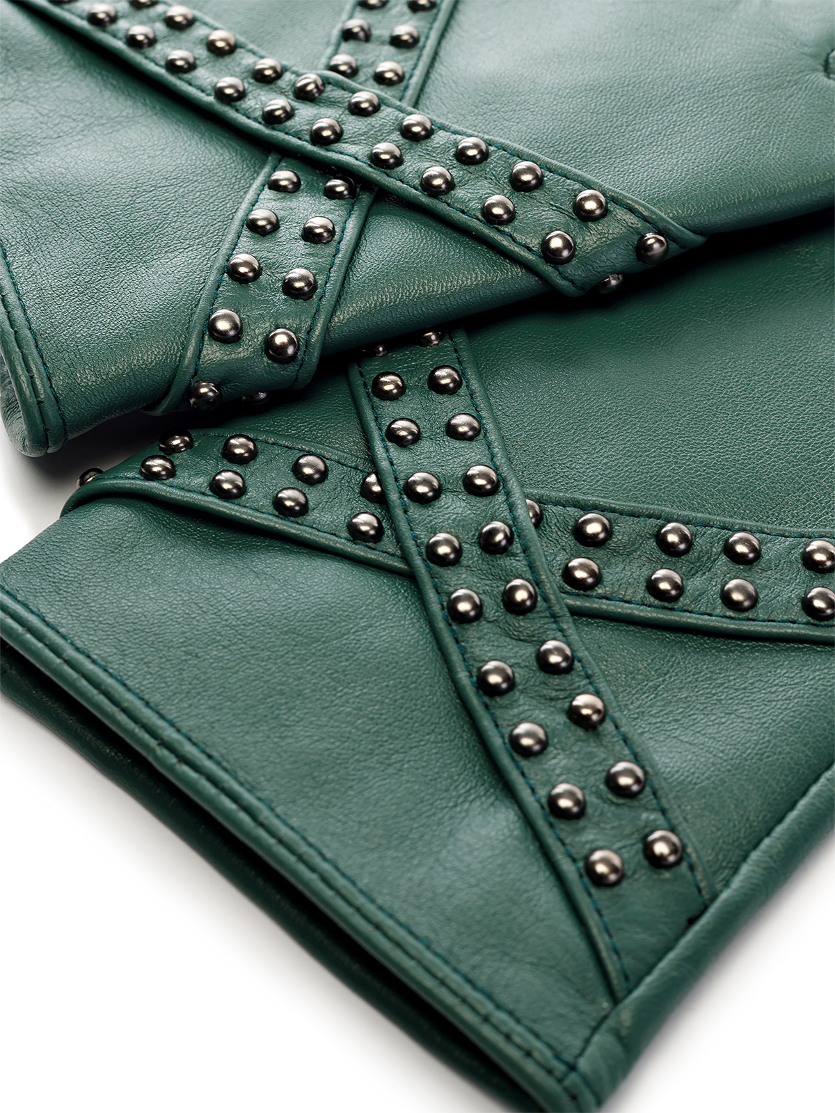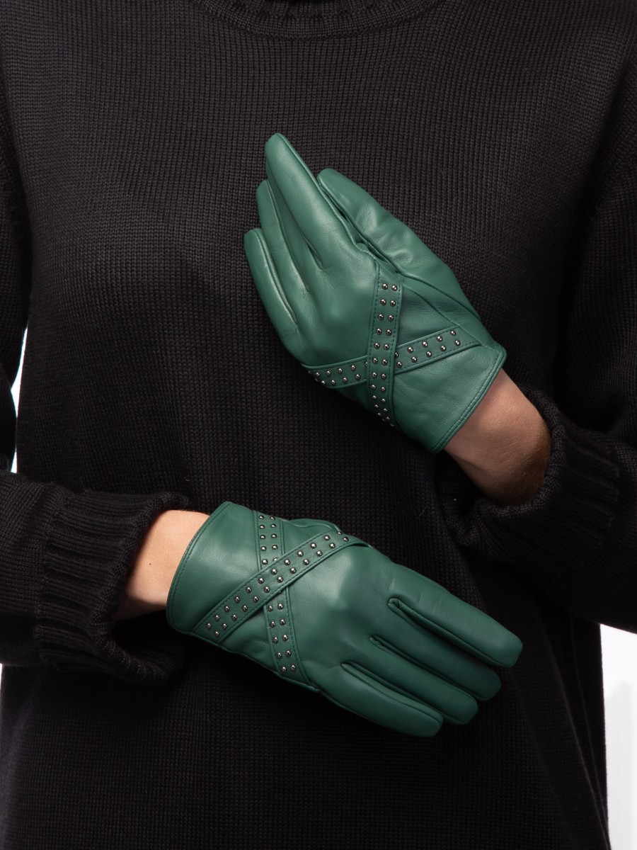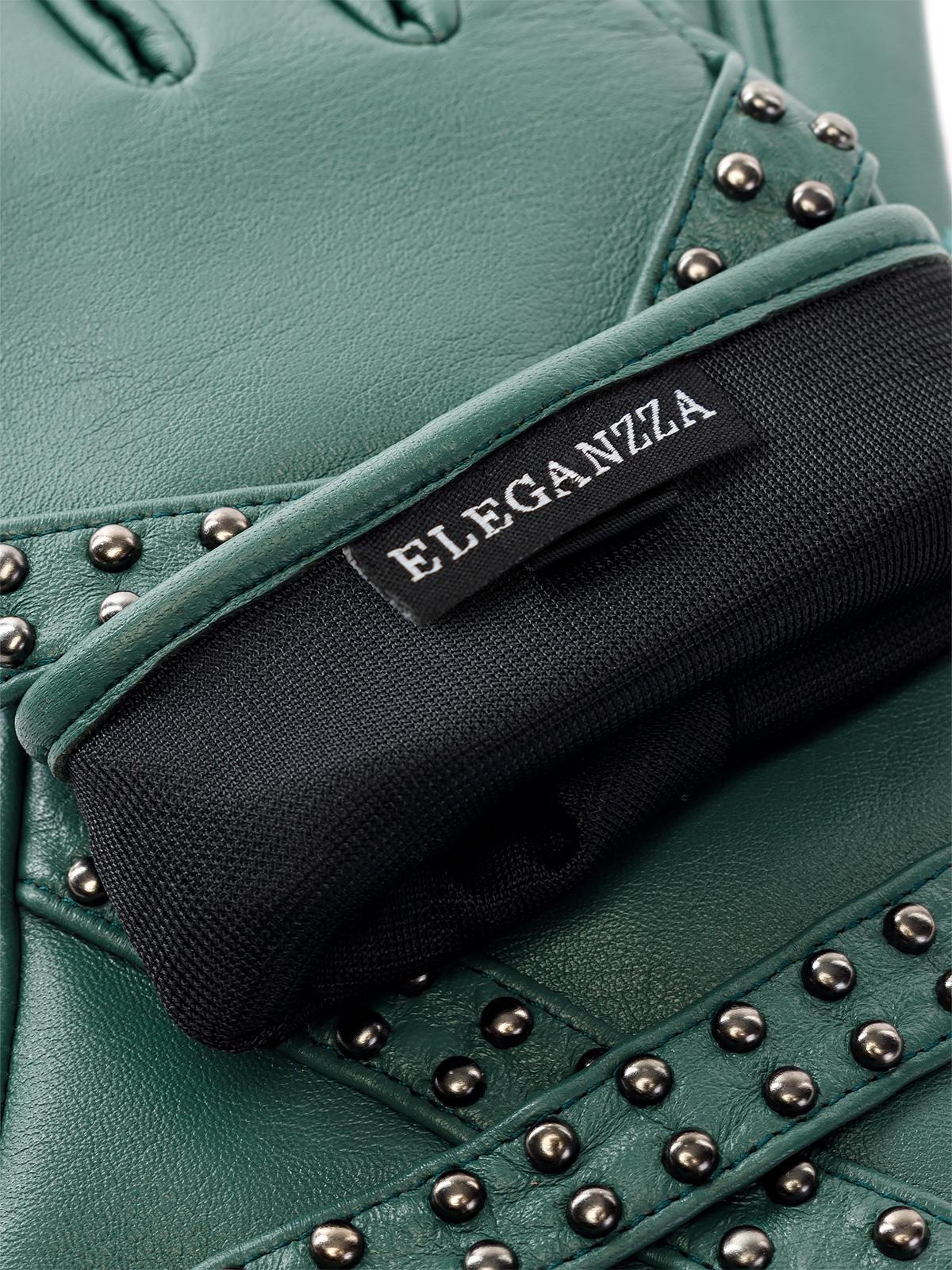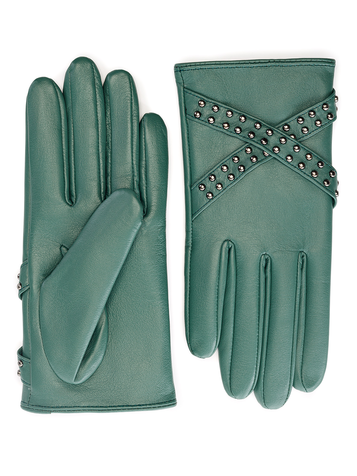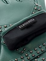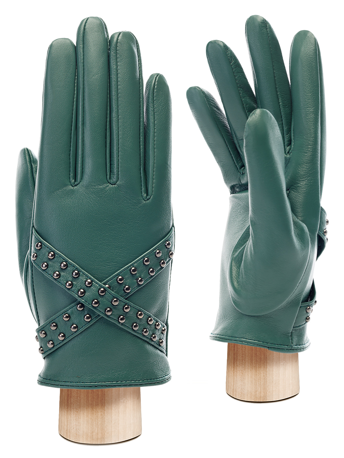 Перчатки женские торговой марки ELEGANZZA производства Китай изготовлены из натуральной кожи ягненка. Подкладка: шелк. Отделка - декоративные ремешки украшенные хольнитенами и пришитые крестообразно на лицевой стороне перчатки. Длина манжеты от нижней точки большого пальца до края перчаток - 15 см. Длина пальцев - средняя.