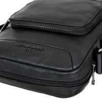 Сумка через плечо черного цвета из натуральной кожи. Сумка закрывается на молнию, внутри одно главное отделение, в котором расположены: карман на молнии и карман для мобильного телефона, два держателя для авторучки. С внешней стороны на лицевой стенке расположен отдел на молнии. Сумка оснащена съёмным регулируемым плечевым ремнём на карабинах.