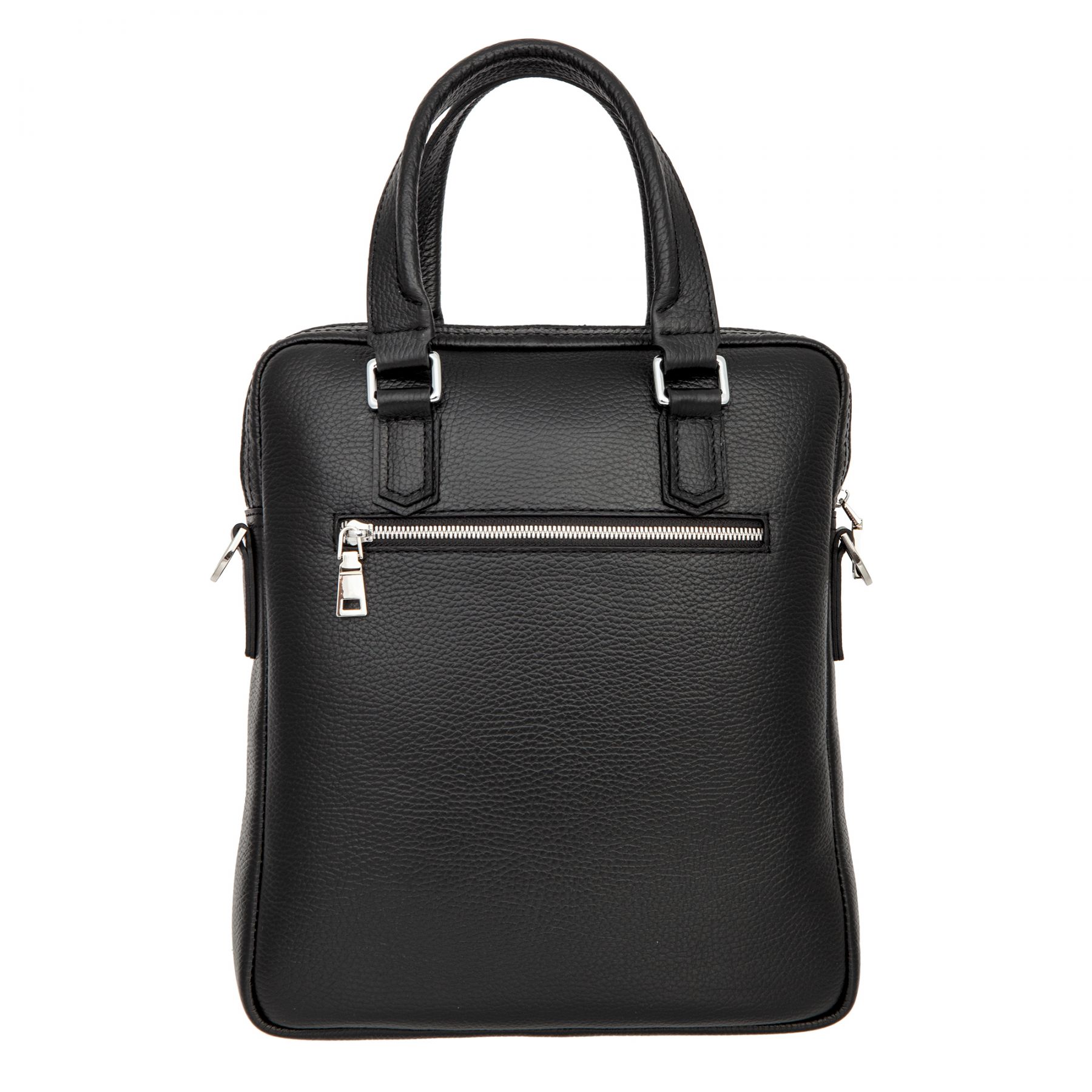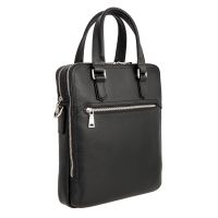 Мужская сумка чёрного цвета из мягкой натуральной кожи зернистой фактуры. Состоит из двух независимых отделений на молниях. Внутри карман на молнии, два кармашка для мелких предметов и отделение для планшета. Снаружи на лицевой и задней стенках карман на молнии. Планшет оснащён удобной верхней ручкой и съёмным регулируемым плечевым ремнём на карабинах. Цвет фурнитуры - серебро.