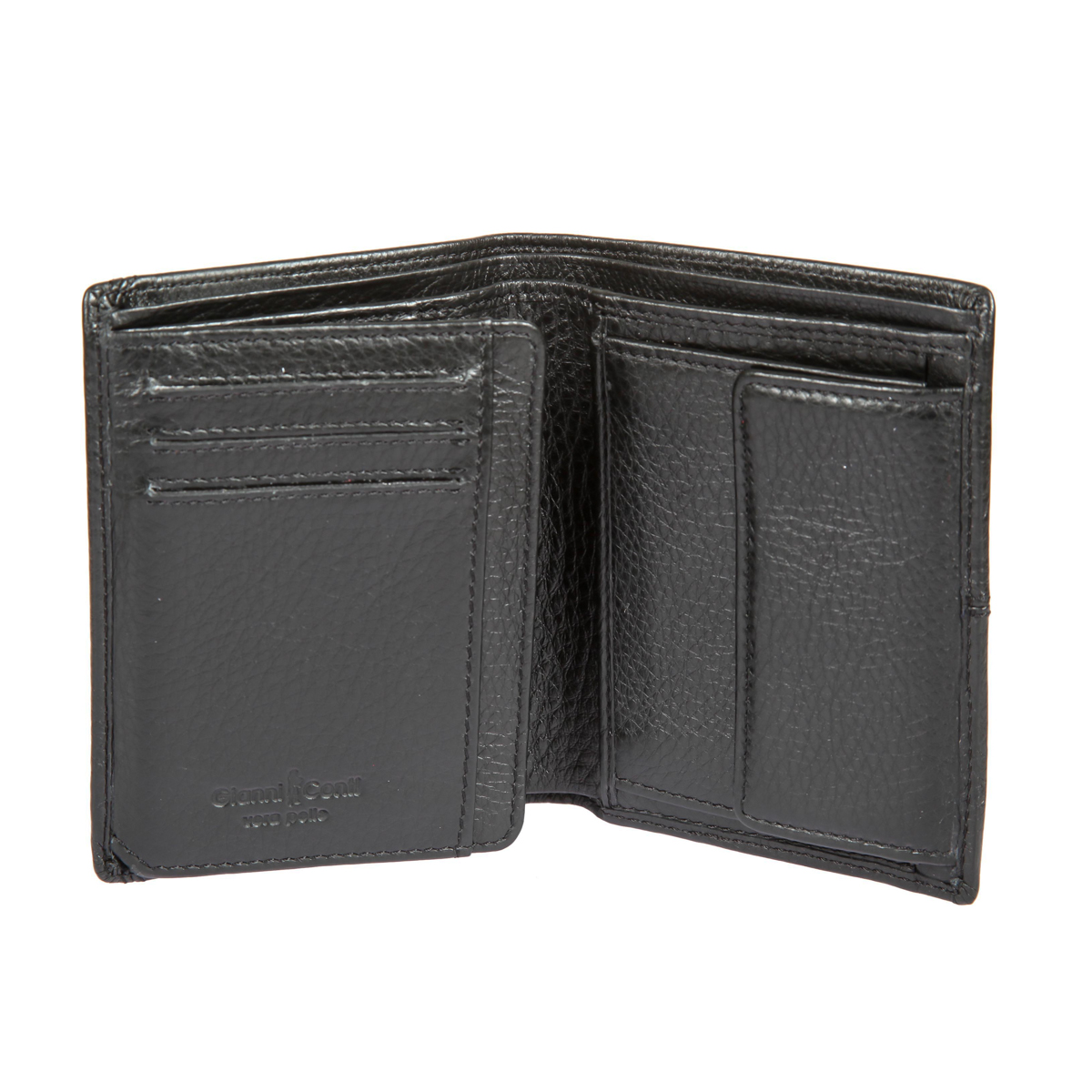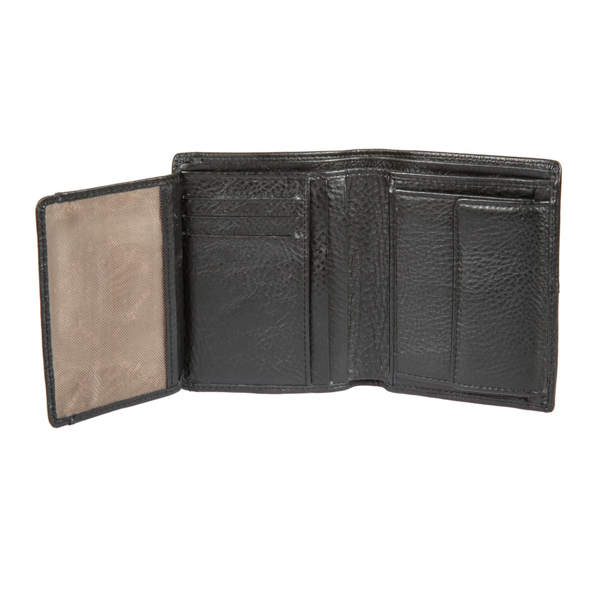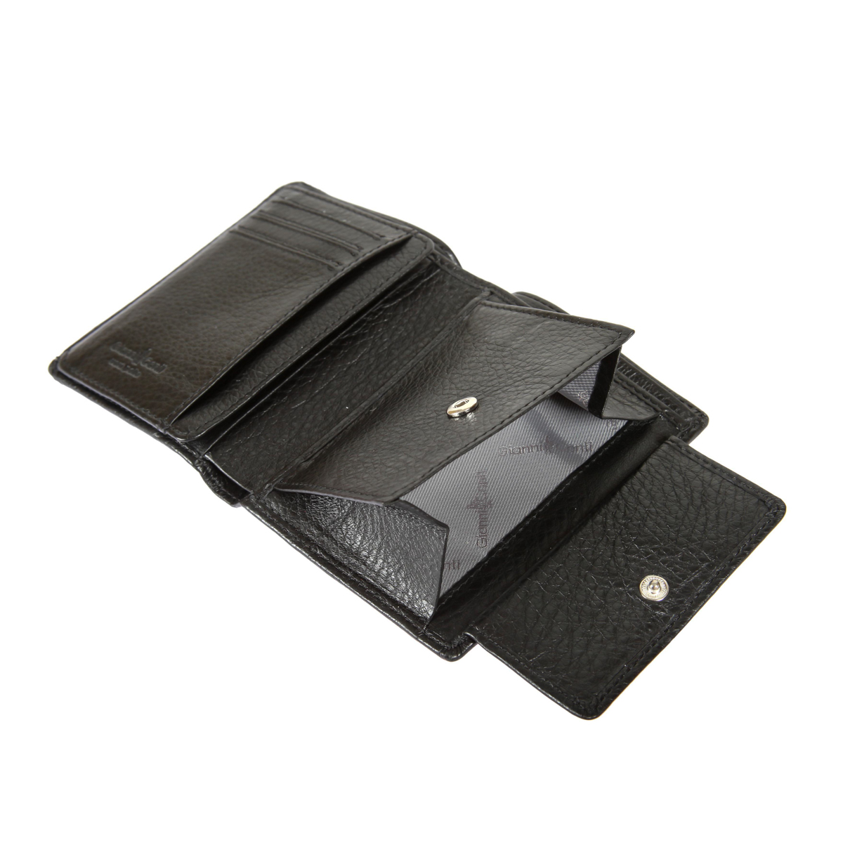 Внутри два отделения для купюр, карман для монет на кнопке, четыре кармана для документов, потайной карман, сетчатый карман и шесть кармашков для пластиковых карт.