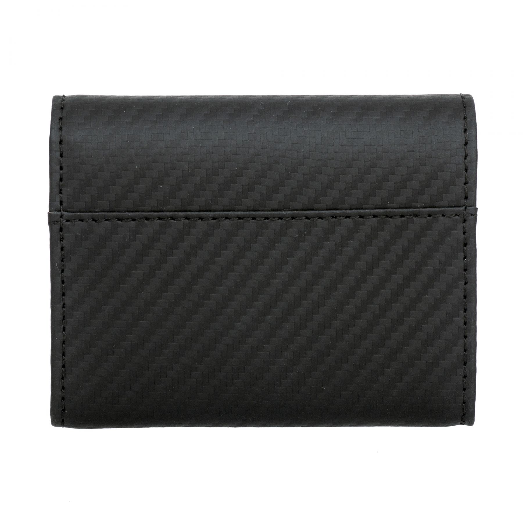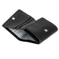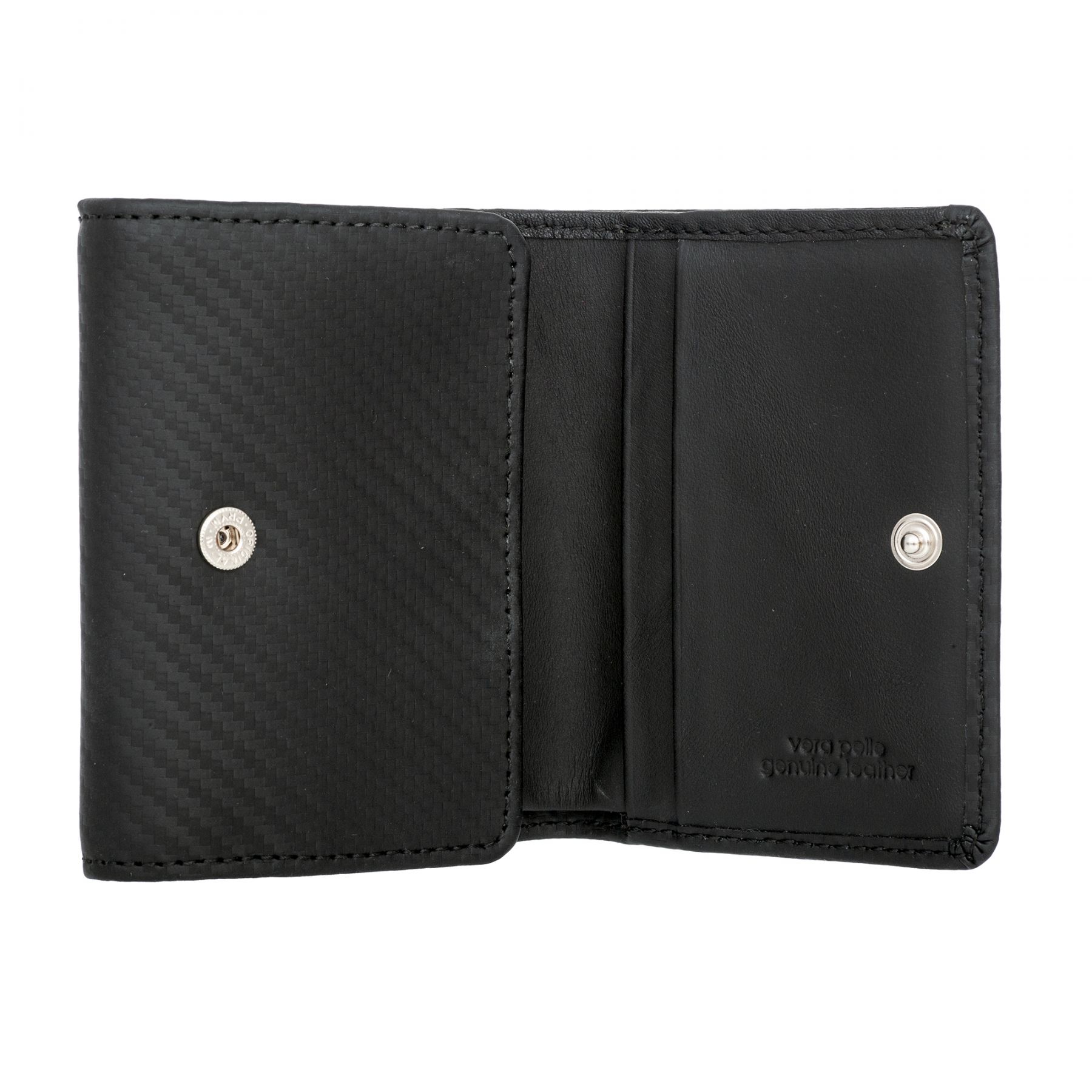 Портмоне закрывается клапаном на кнопку. Внутри портмоне отдел для купюр, карман для монет на кнопке и два кармашка для пластиковых карт.