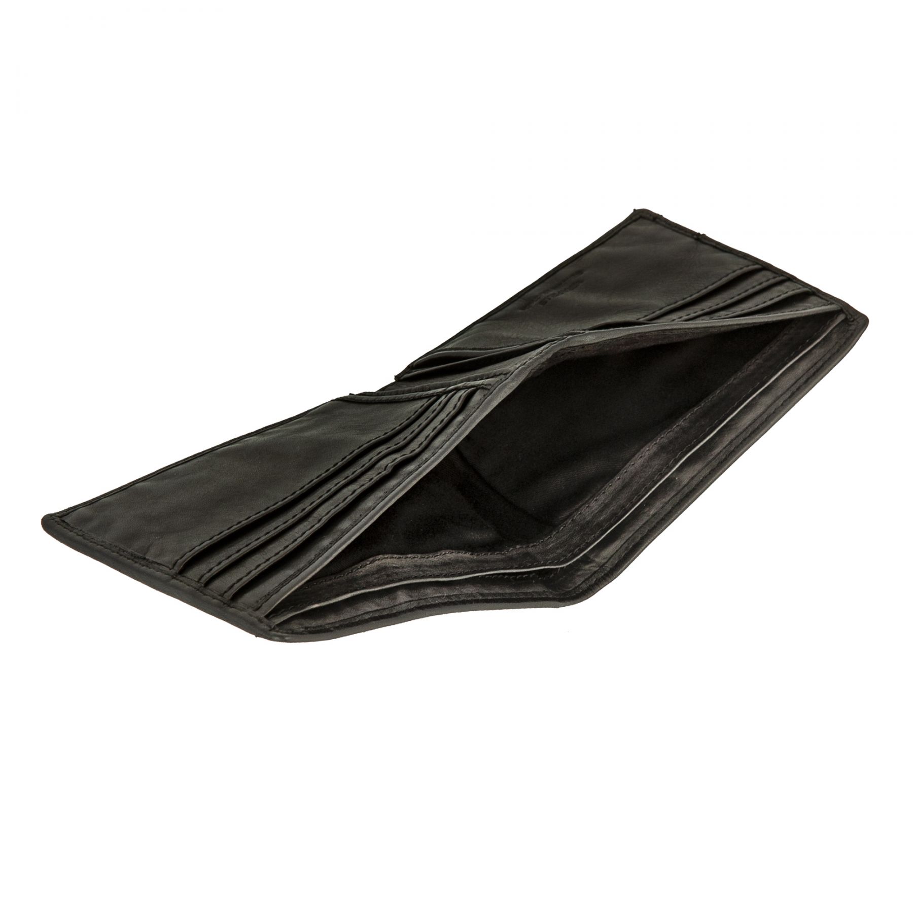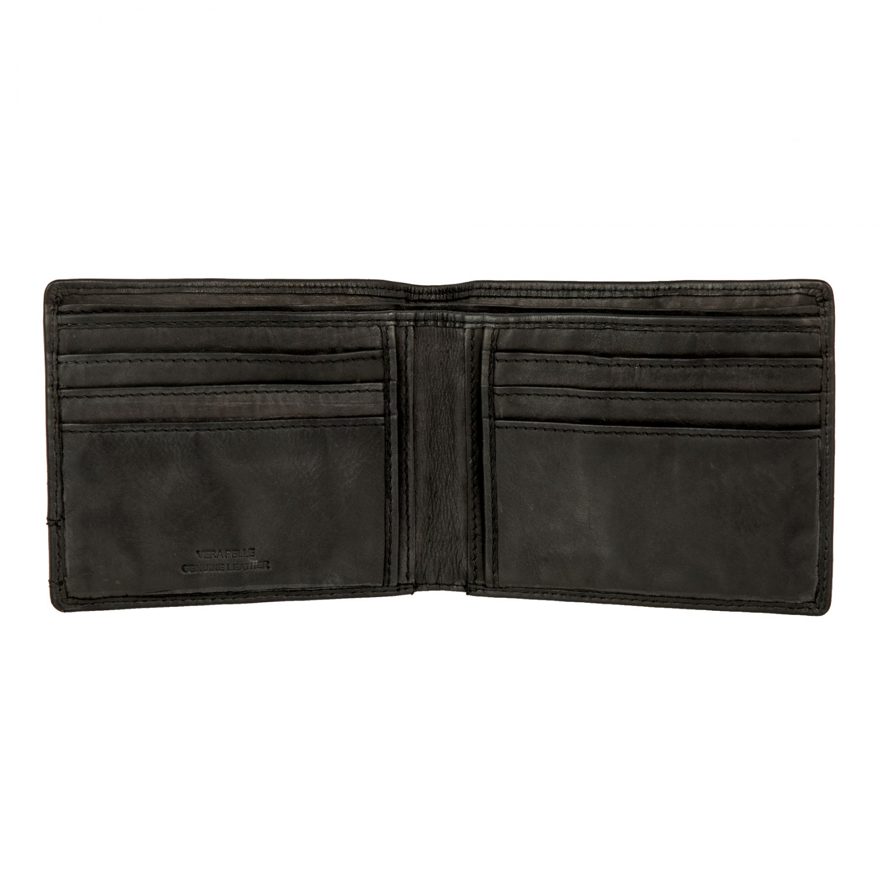 Портмоне раскладывается пополам, внутри два отделения для купюр, четыре кармашка для документов, восемь кармашков для пластиковых карт.