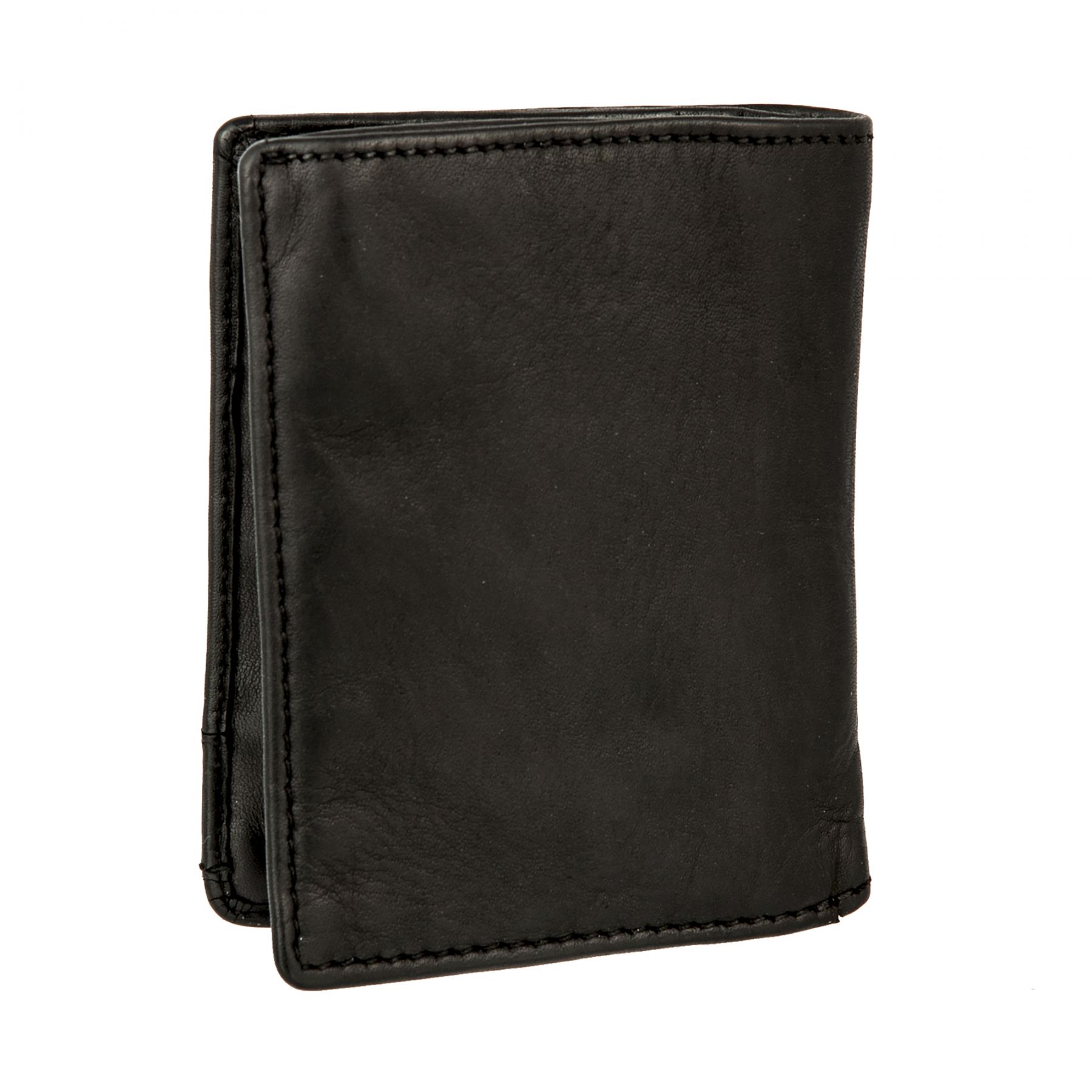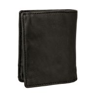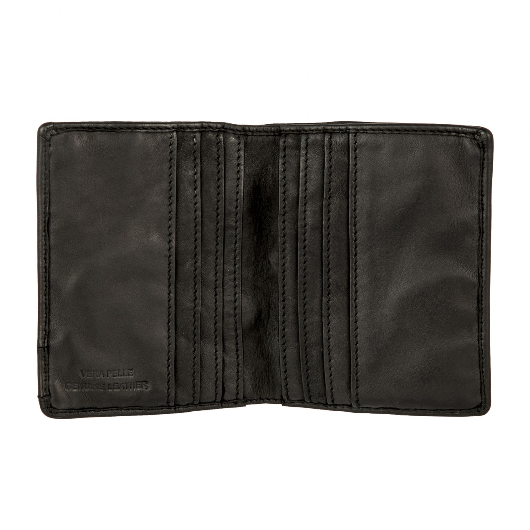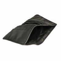 Портмоне из натуральной винтажной кожи чёрного цвета. Раскладывается пополам, внутри одно отделение для купюр и восемь кармашков для пластиковых карт.