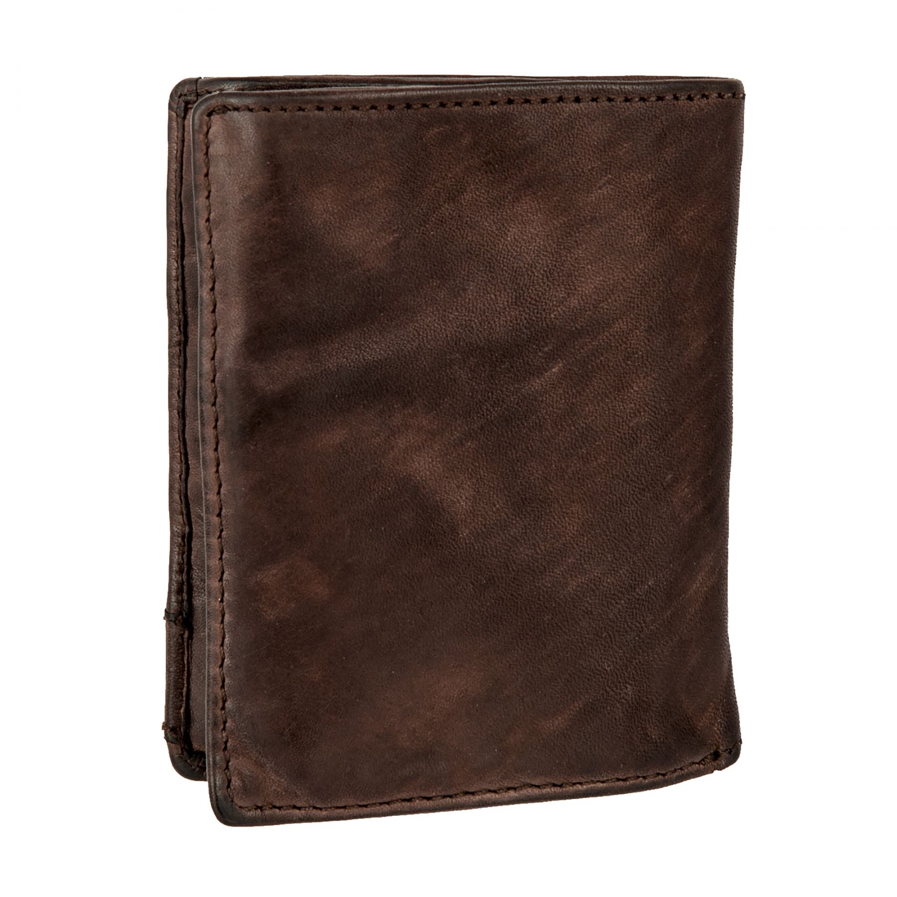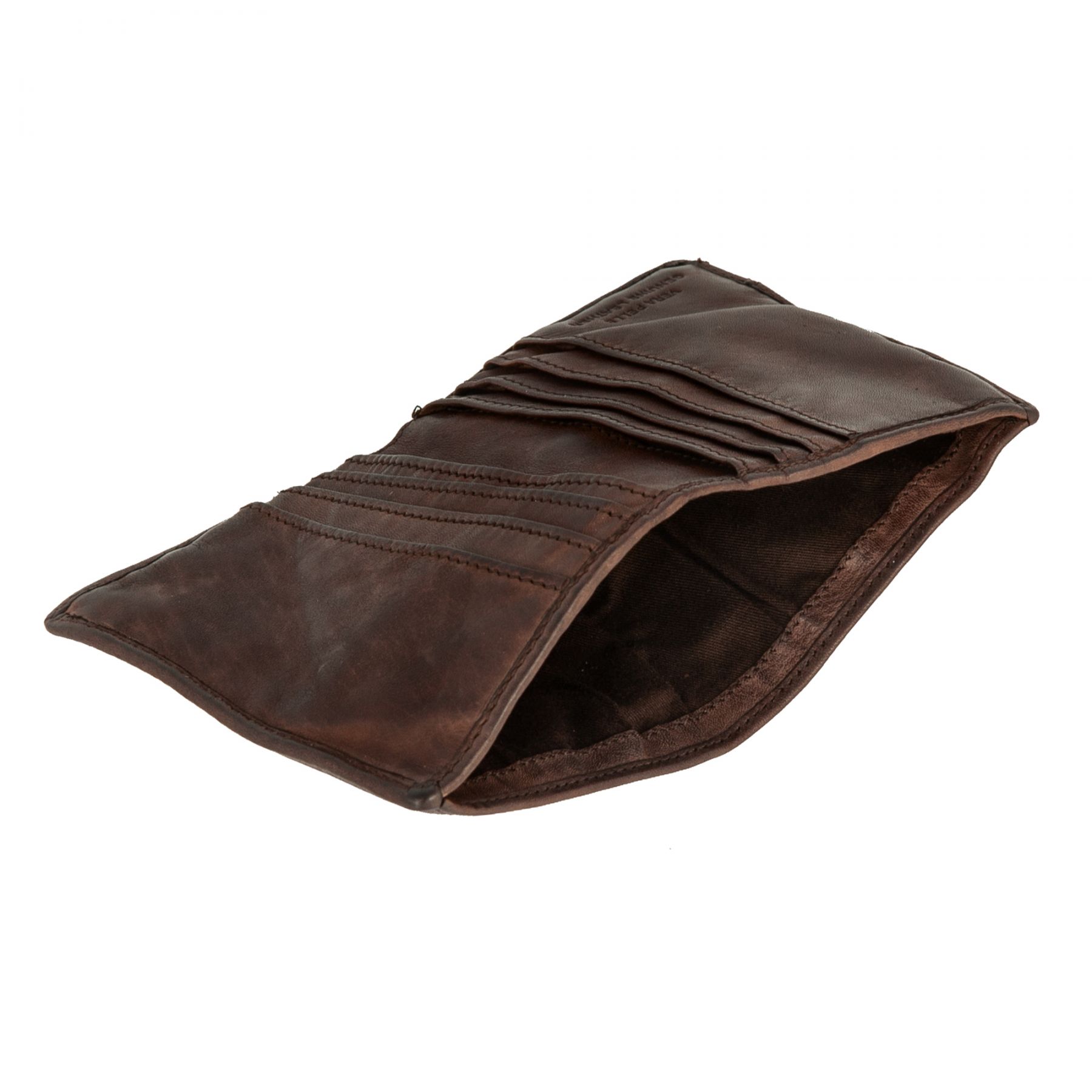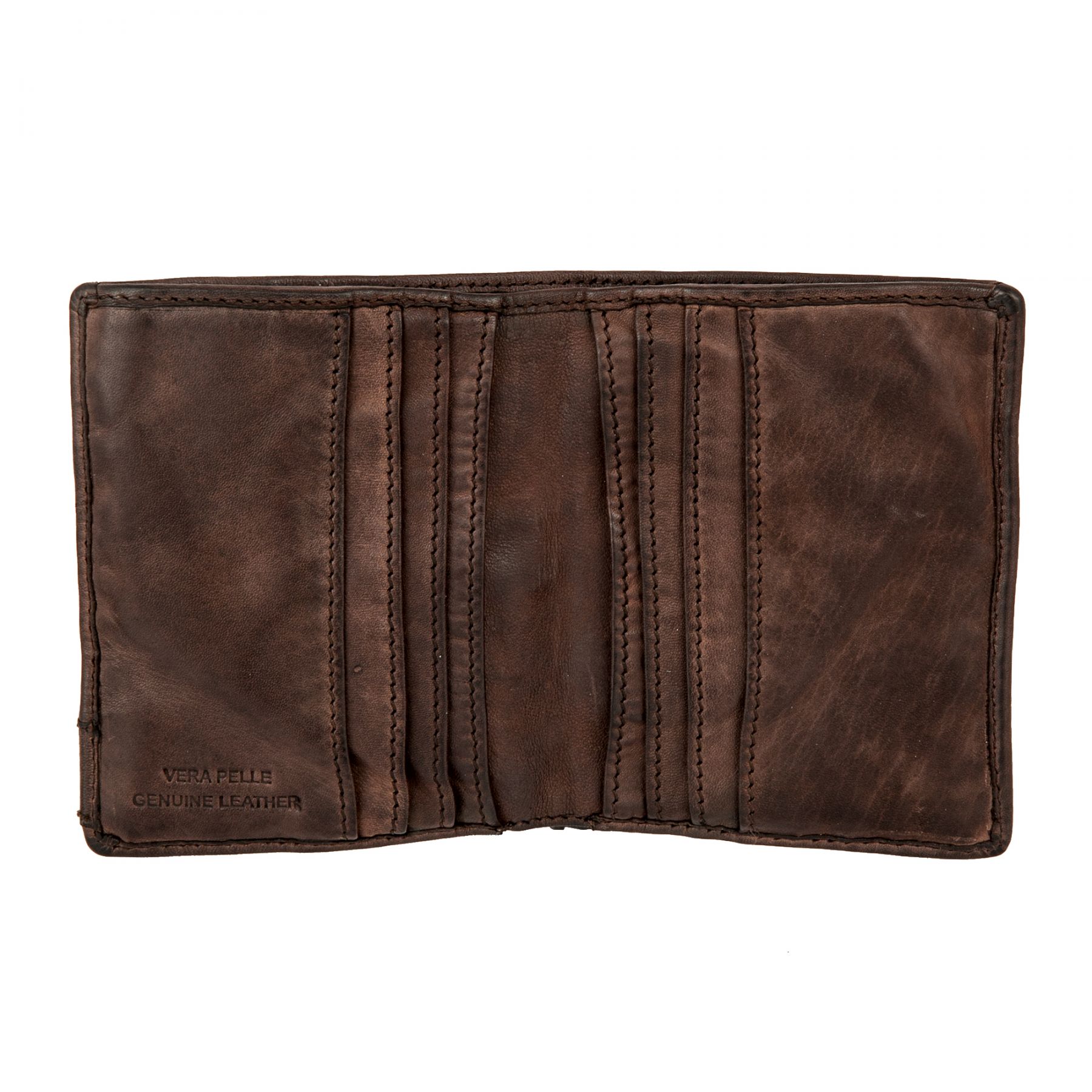 Портмоне из натуральной винтажной кожи коричневого цвета. Раскладывается пополам, внутри одно отделение для купюр и восемь кармашков для пластиковых карт.