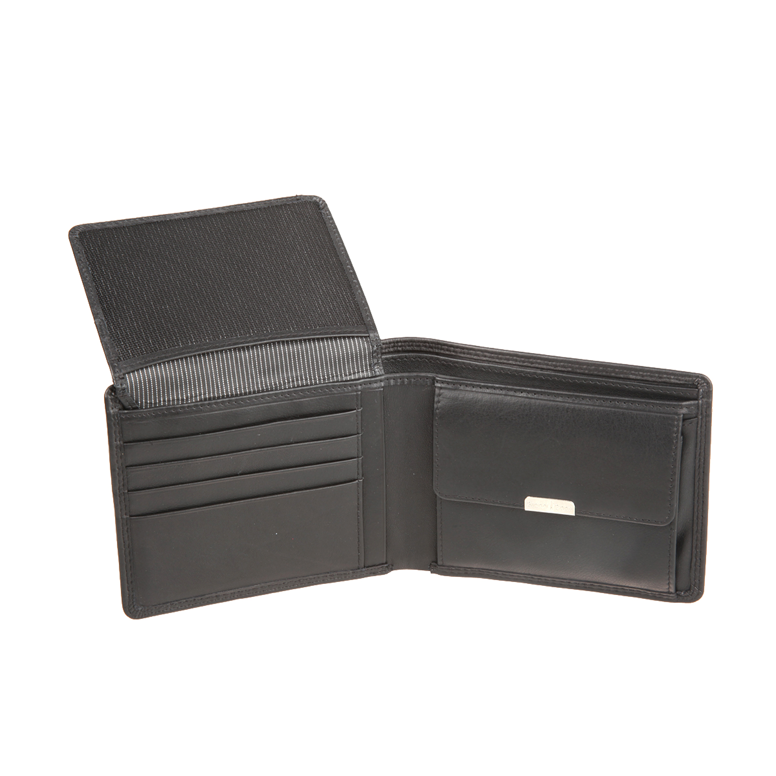 Портмоне черного цвета из натуральной кожи раскладывается пополам. Внутри два отдела для купюр, карман на молнии для купюр, отдел для мелочи на кнопке, одиннадцать кармашков для пластиковых карт, сетчатый карман для пропуска, потайной кармашек