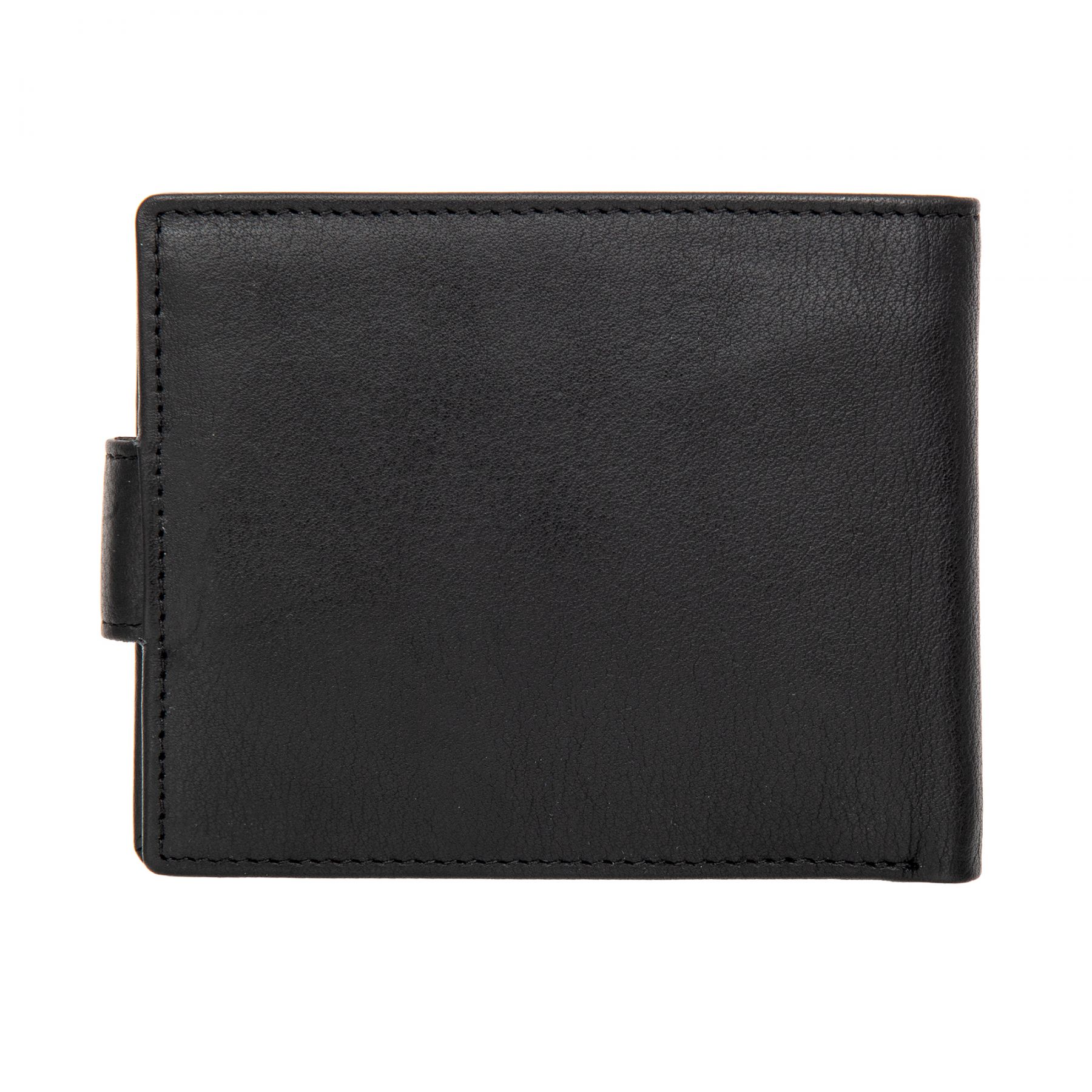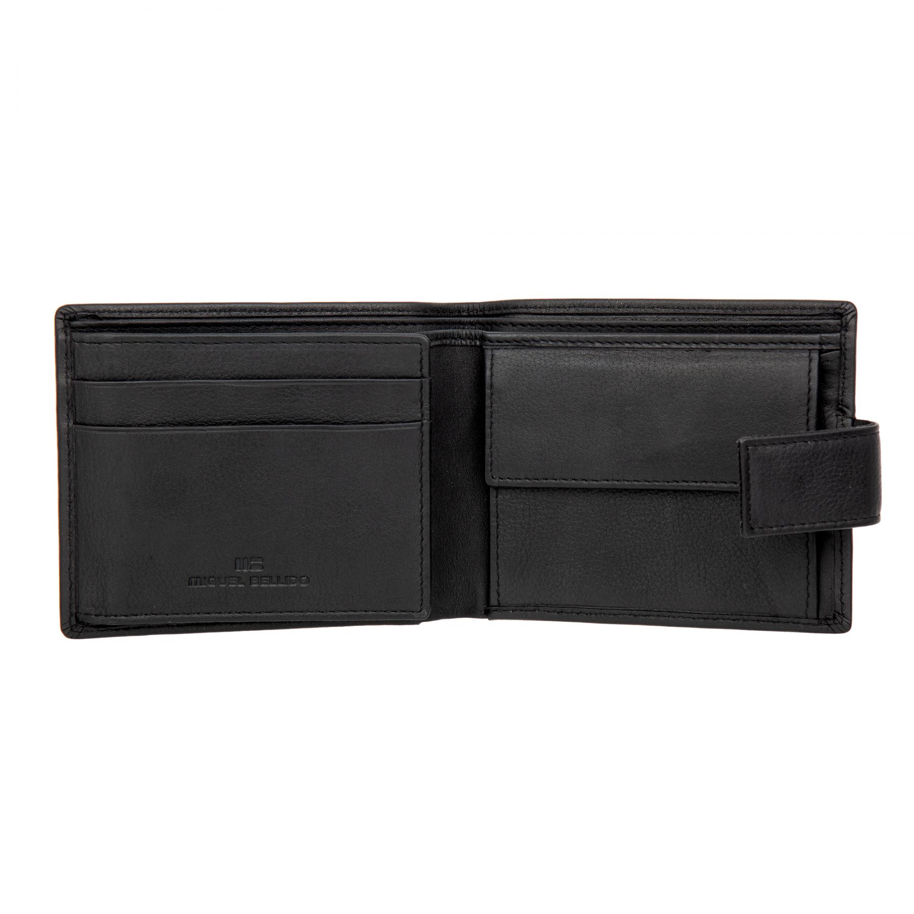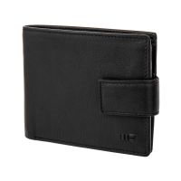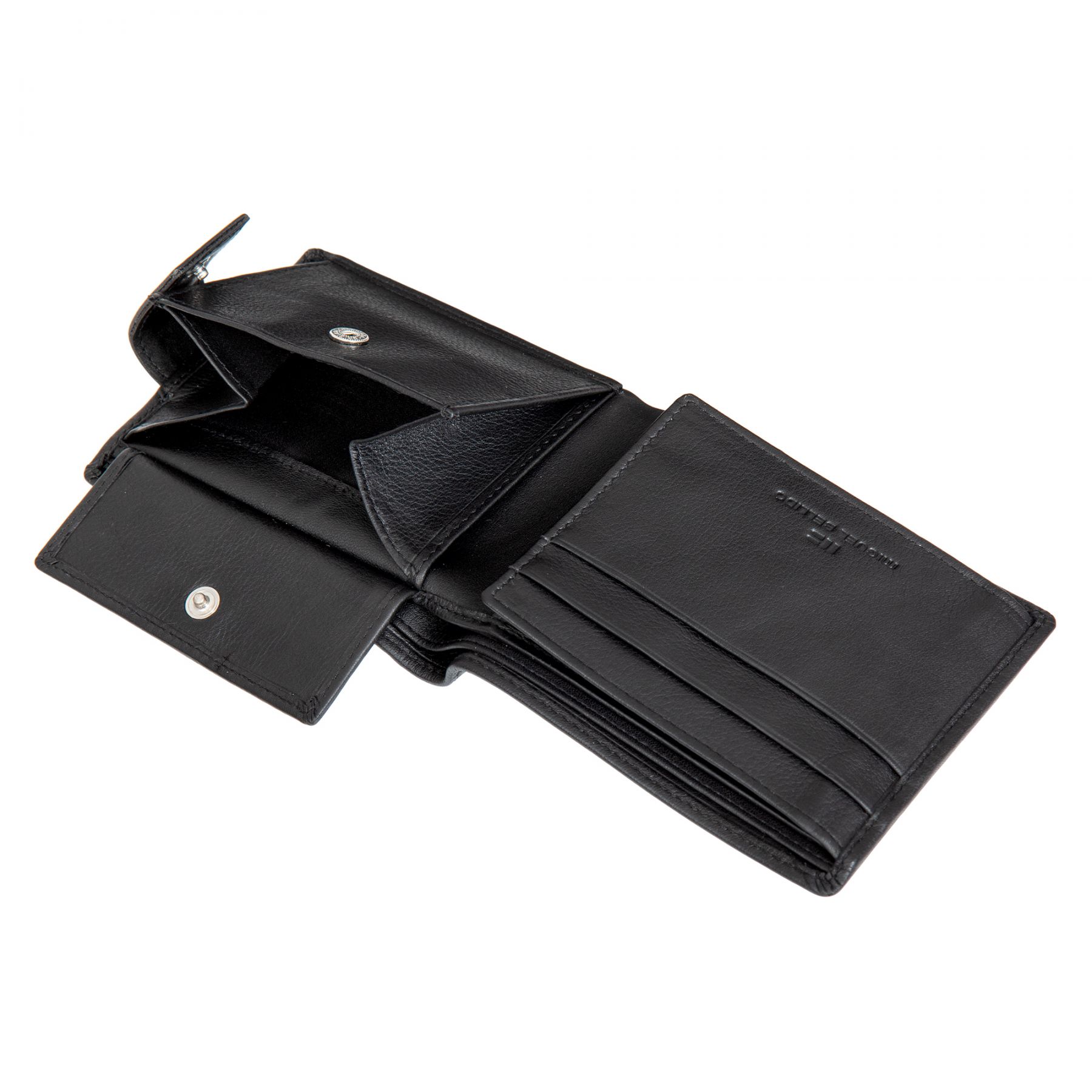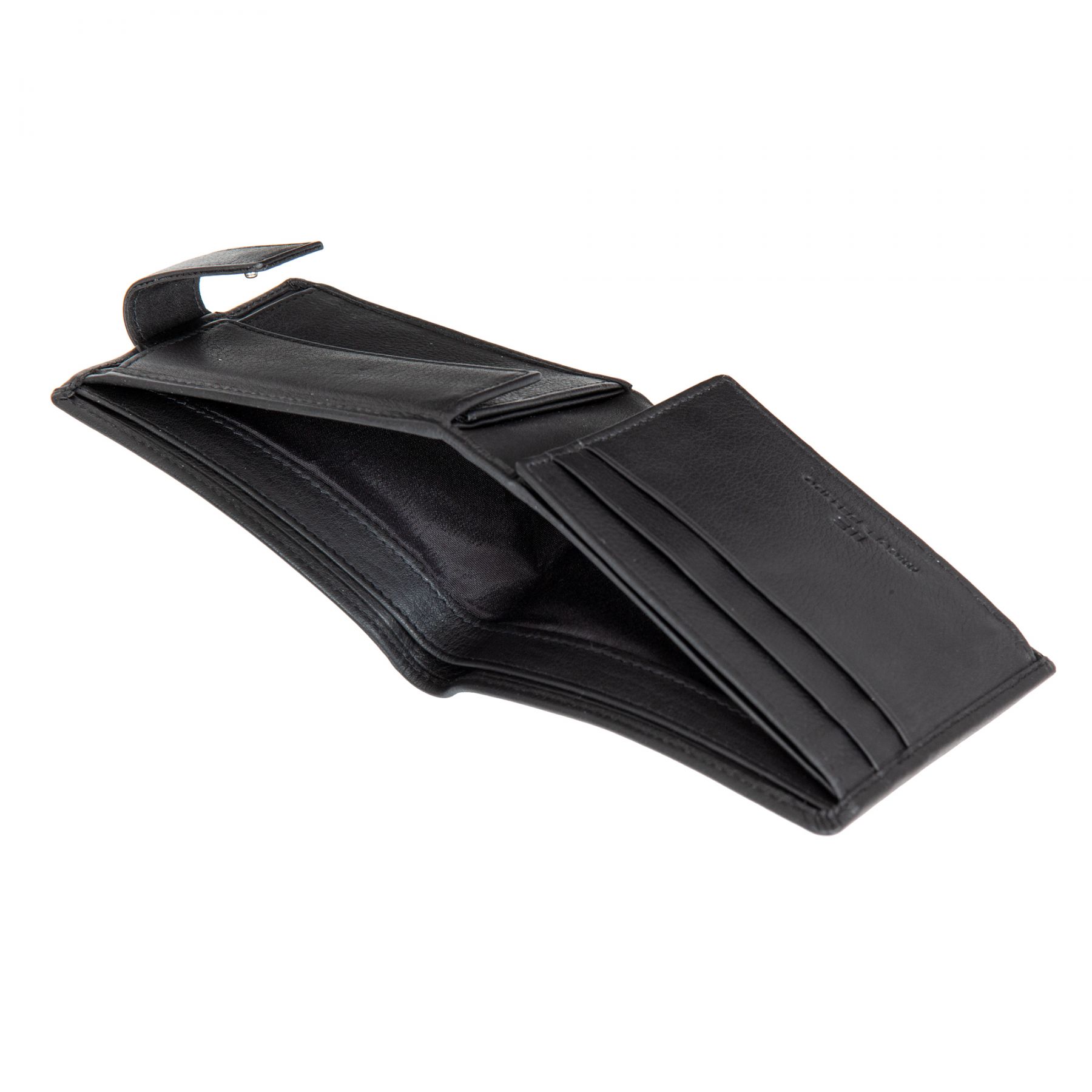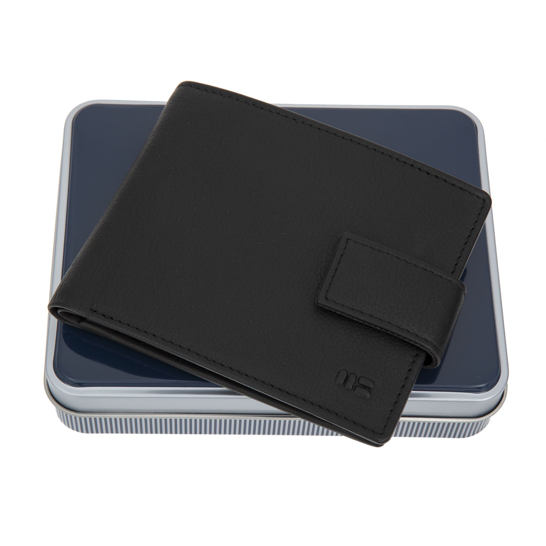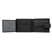 Портмоне раскладывается пополам и закрывается клапаном на кнопке, внутри два отделения для купюр, два потайных кармана, пять кармашков для пластиковых карт, сетчатое отделение для пропуска, карман для мелочи на кнопке. Оснащено RFID-защитой, что позволяет защитить банковские карты от считывания. Упаковано в подарочную жестяную коробку.