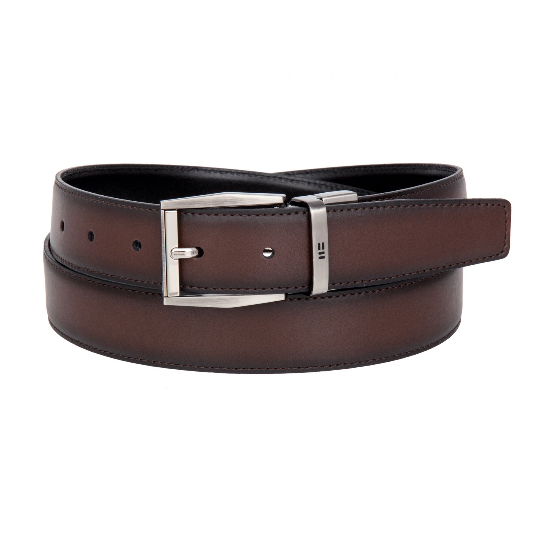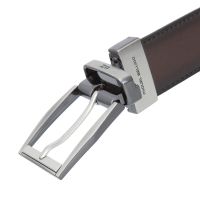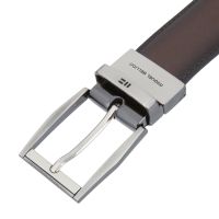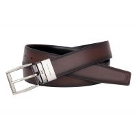 Мужской брючный ремень. Изготовлен из высококачественной кожи. Универсальная классическая двусторонняя модель - простым поворотом пряжки меняет цвет полотна (коричневый/черный). Размер пряжки: 5,5 х 4 см. Поставляется в фирменном мешочке.