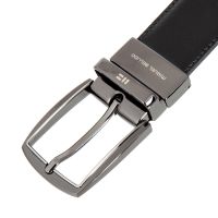Мужской брючный ремень. Изготовлен из высококачественной кожи. Универсальная классическая двусторонняя модель - простым поворотом пряжки меняет цвет полотна (чёрный/коричневый). Размер пряжки: 5,5 х 4 см. Поставляется в фирменном мещочке.