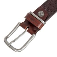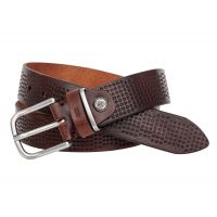 Мужской ремень для джинсов. Особенностью этой модели является натуральное кожаное полотно высокого качества с гравировкой по всей длине. Ремень укорачивается по длине. Пряжка 5,5 х 5 см. Поставляется в фирменном мешочке.