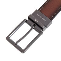 Мужской брючный ремень. Изготовлен из высококачественной кожи. Универсальная классическая двусторонняя модель - простым поворотом пряжки меняет цвет полотна (чёрный/светло - коричневый). Размер пряжки: 5 х 4 см. Поставляется в фирменном мещочке.