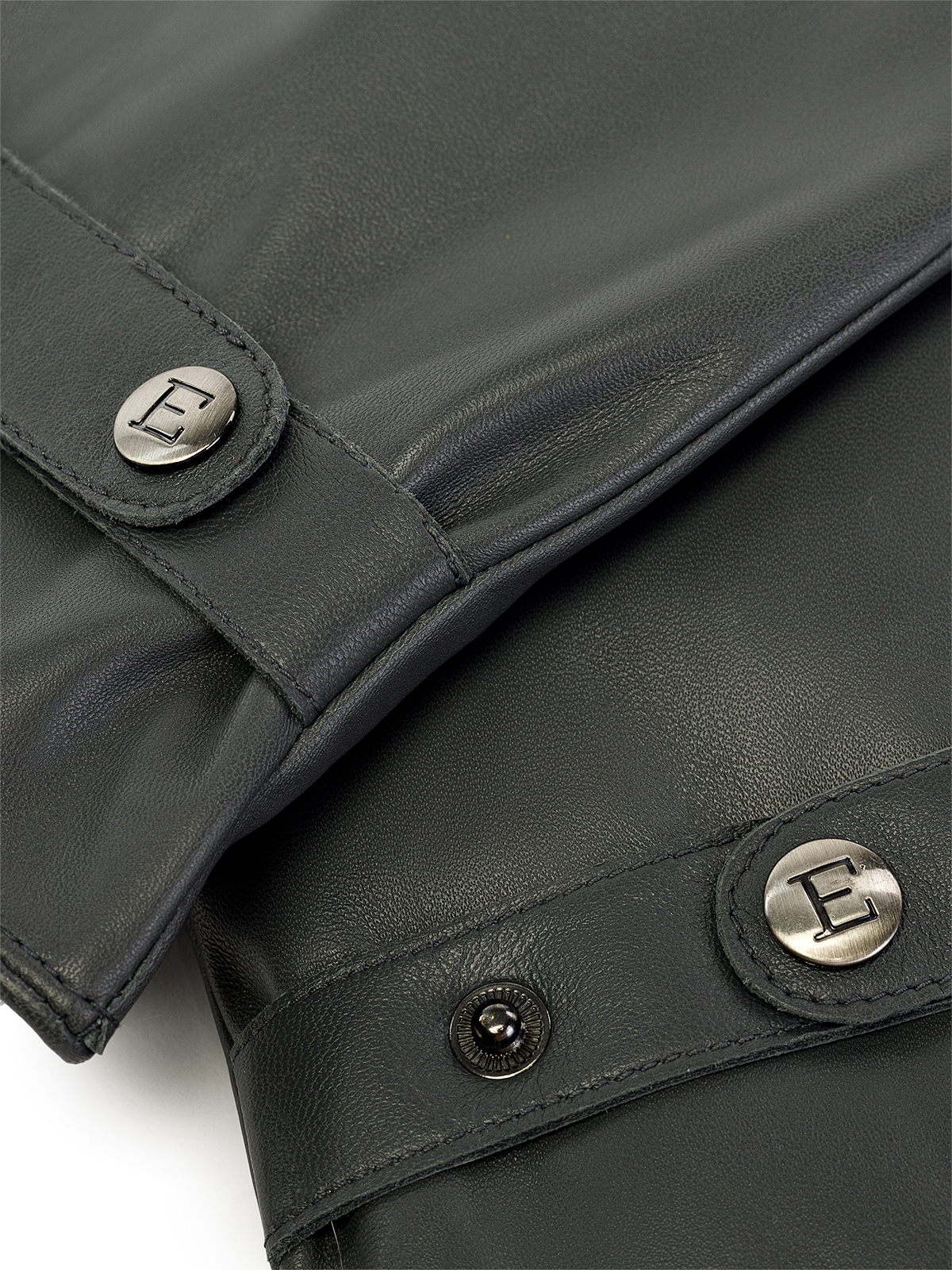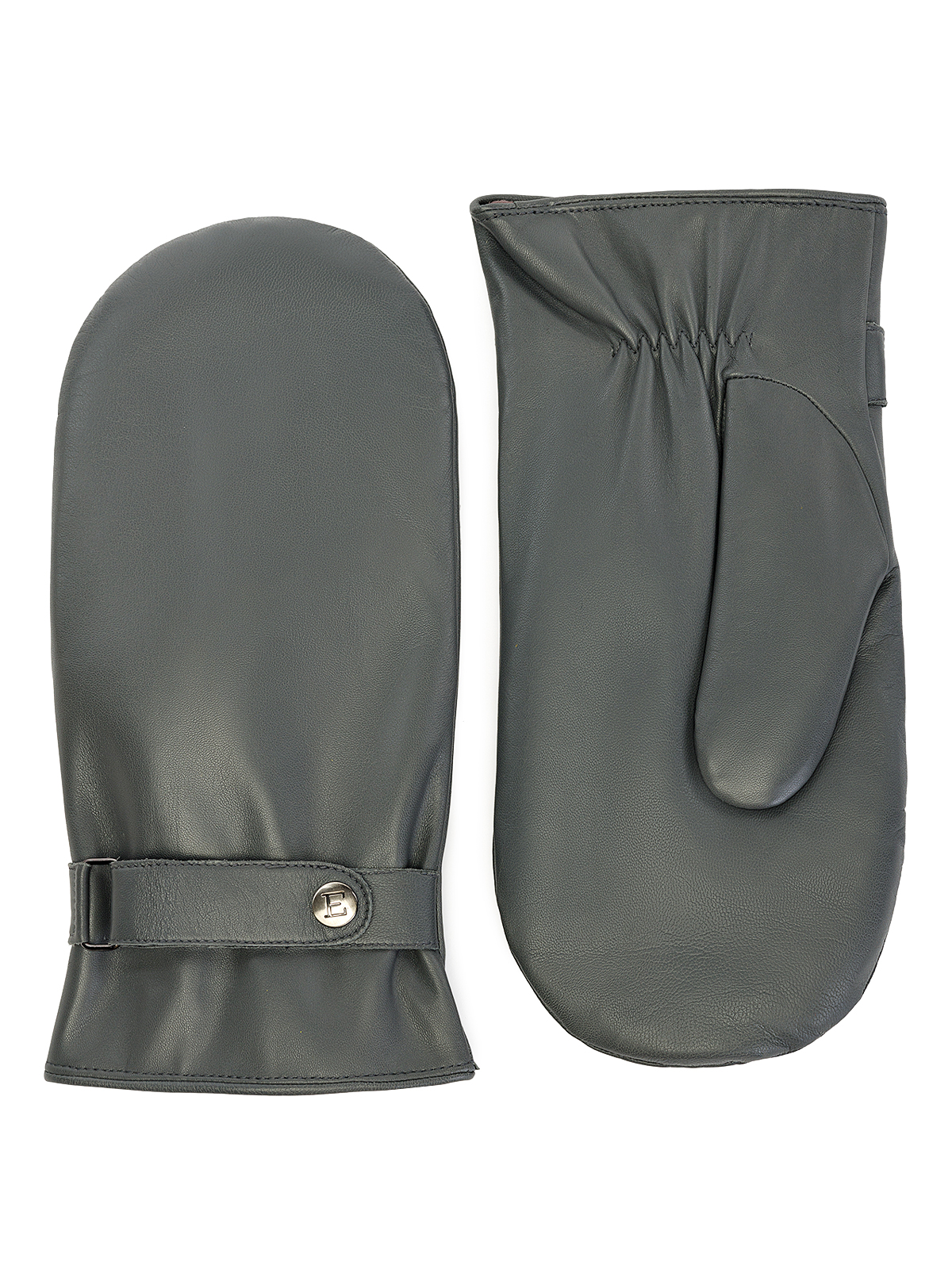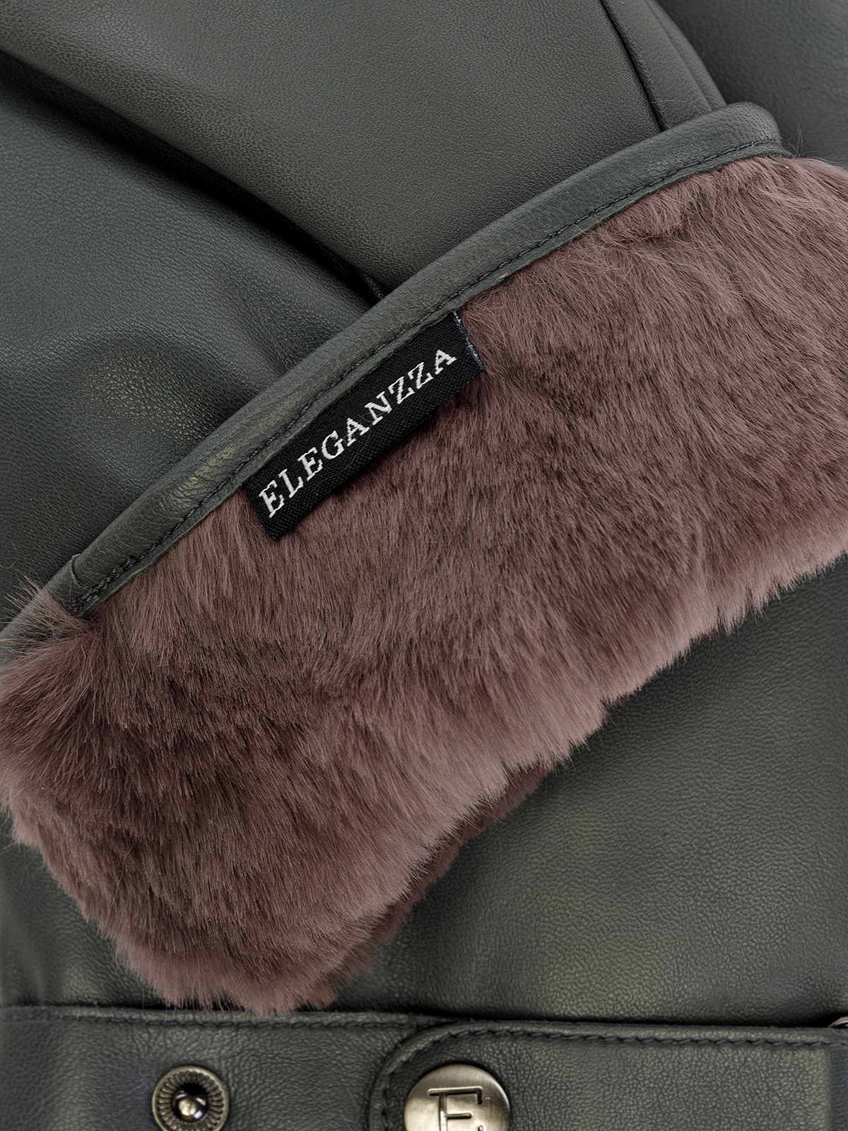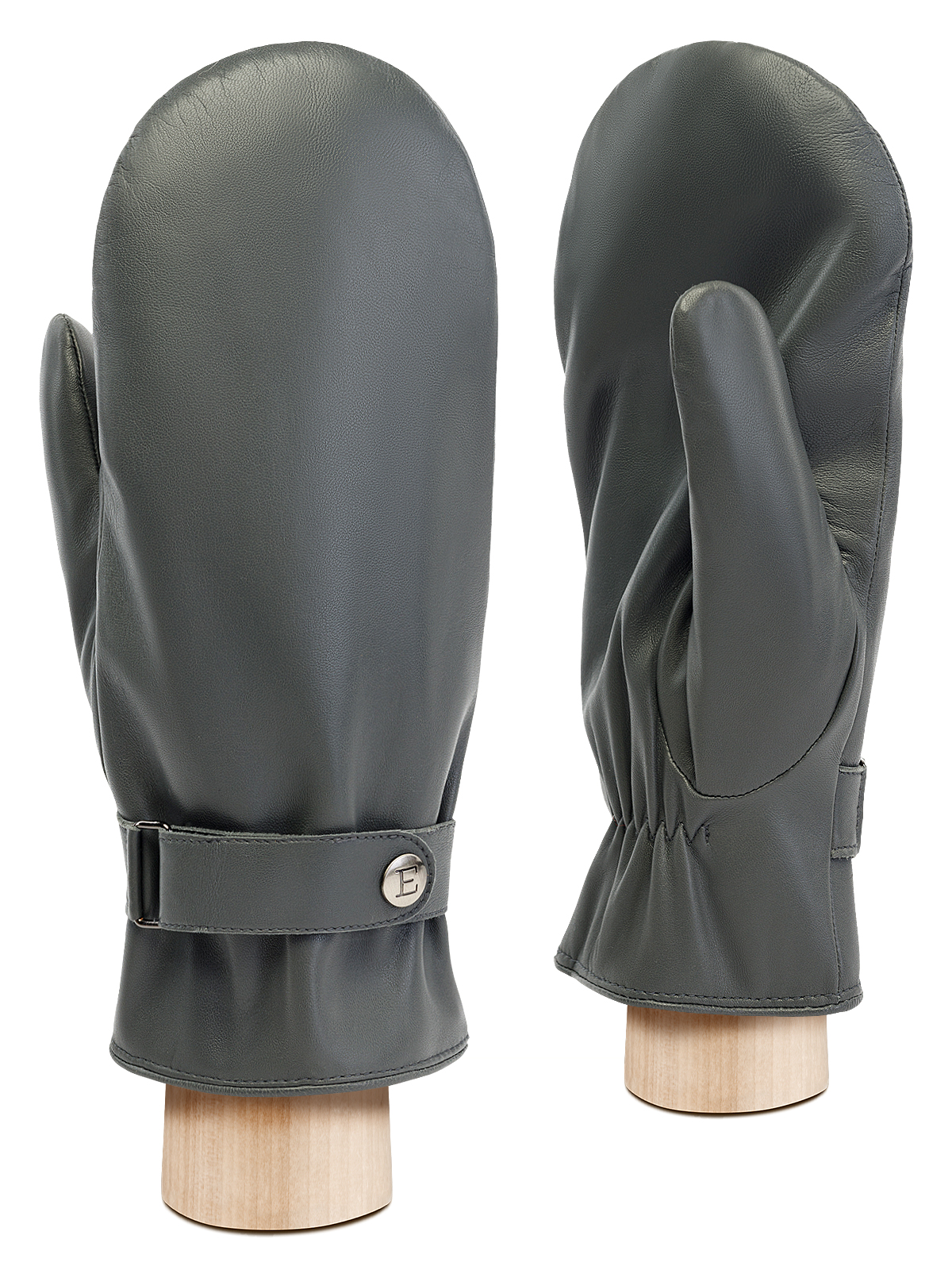 Рукавицы торговой марки ELEGANZZA производства Китай из натуральной кожи ягненка. Подкладка - натуральный мех (кролик). Отделка - лицевая сторона украшена рабочим ремешком на кнопке с фирменной символикой бренда. Длина манжеты от нижней точки большого пальца до края перчаток - 7 см.