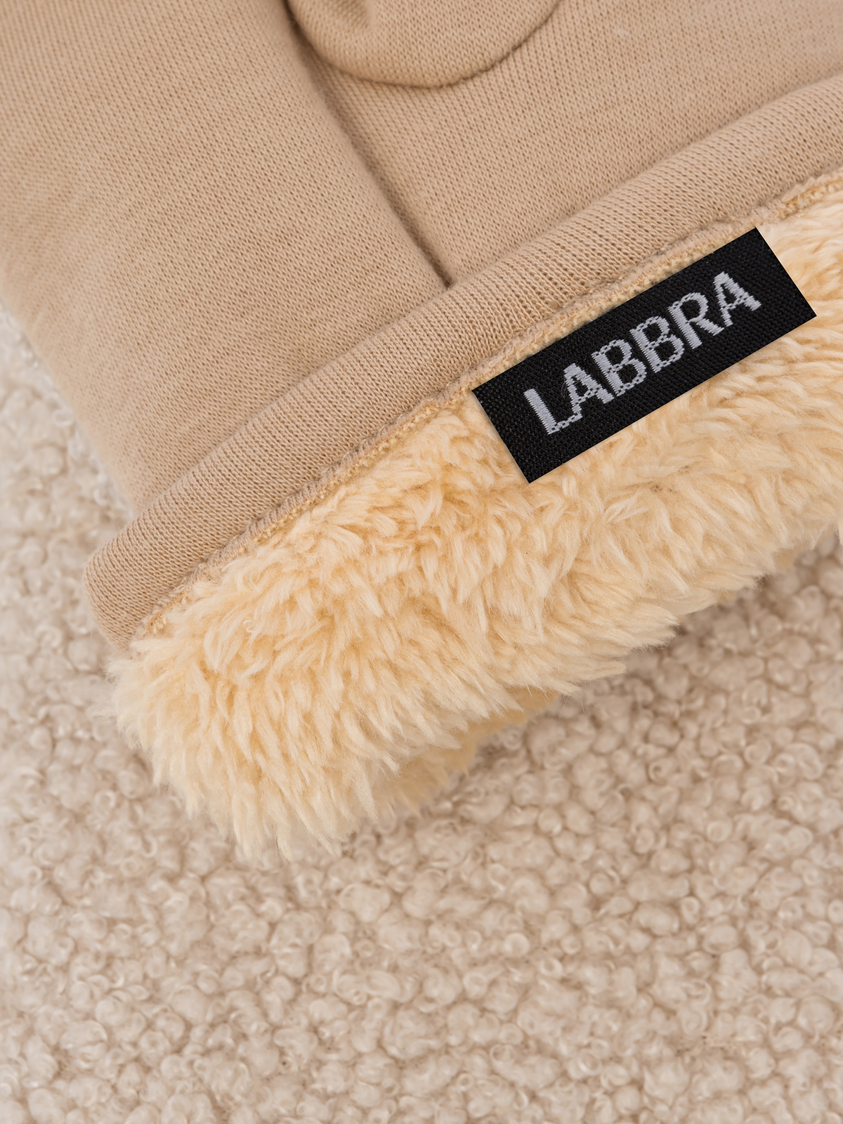 Рукавицы торговой марки LABBRA производства Китай выполнены из трикотажного полотна. Состав трикотажа: 50% хлопок 50% полиэстер. Подкладка: флис 100% полиэстер. Длина манжеты от нижней точки большого пальца до края перчаток - 8 см. Длина пальцев - средняя. Модель перчатки универсального размера подойдёт на любую полноту руки благодаря хорошему стрейчу и эластичности трикотажа.