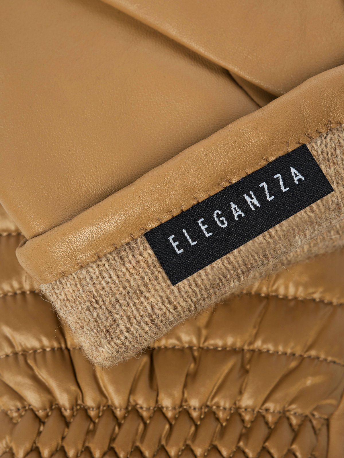 Рукавицы торговой марки ELEGANZZA выполнены из натуральной кожи ягненка. Производство Китай. Подкладка: 100% шерсть.На лицевой части вставка из болоньи с декоративными строчками и функциональной утяжкой. Длина манжеты от нижней точки большого пальца до края перчаток - 5 см. Длина пальцев - средняя.