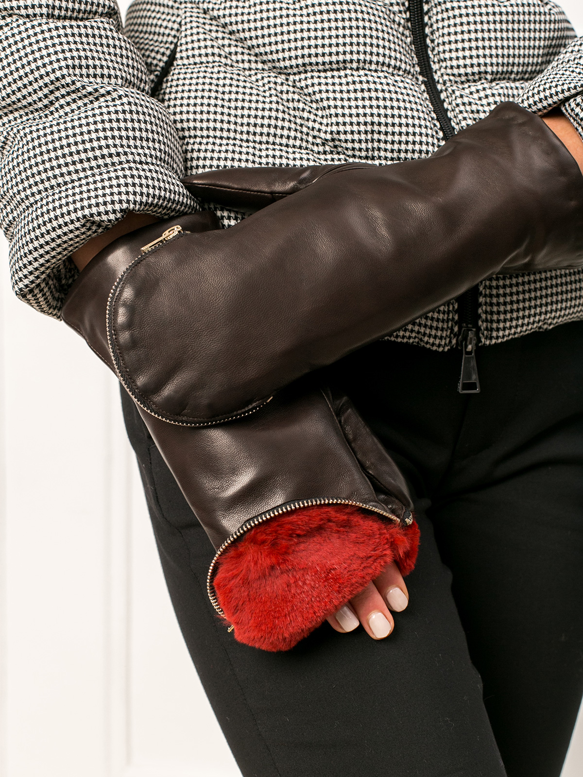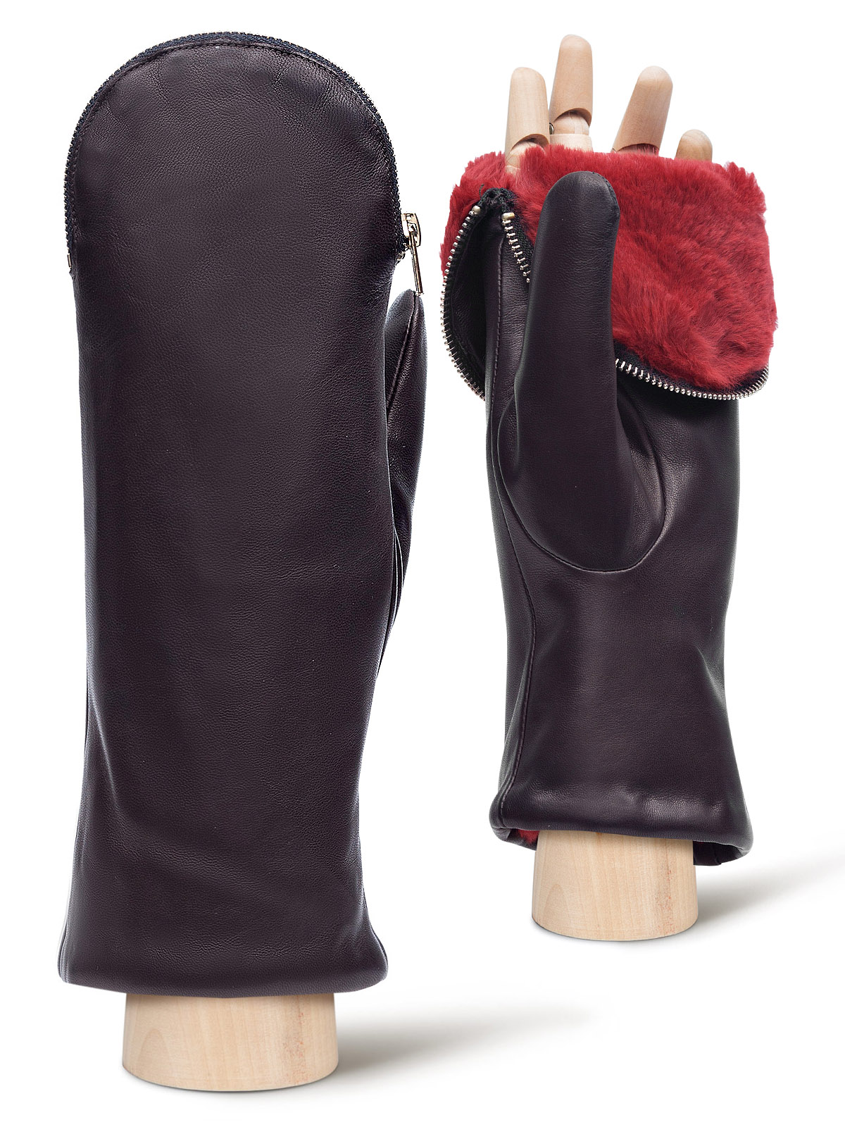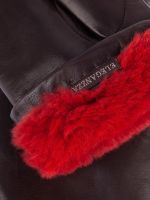 Рукавицы женские торговой марки ELEGANZZA производства Китай изготовлены из натуральной кожи ягнёнка. Отделка - рабочая молния по верхнему шву рукавиц меховая подкладка контрастного цвета. Подкладка: 100% мех кролика. Длина манжеты от нижней точки большого пальца до края перчаток - 75 см. Длина пальцев - средняя.