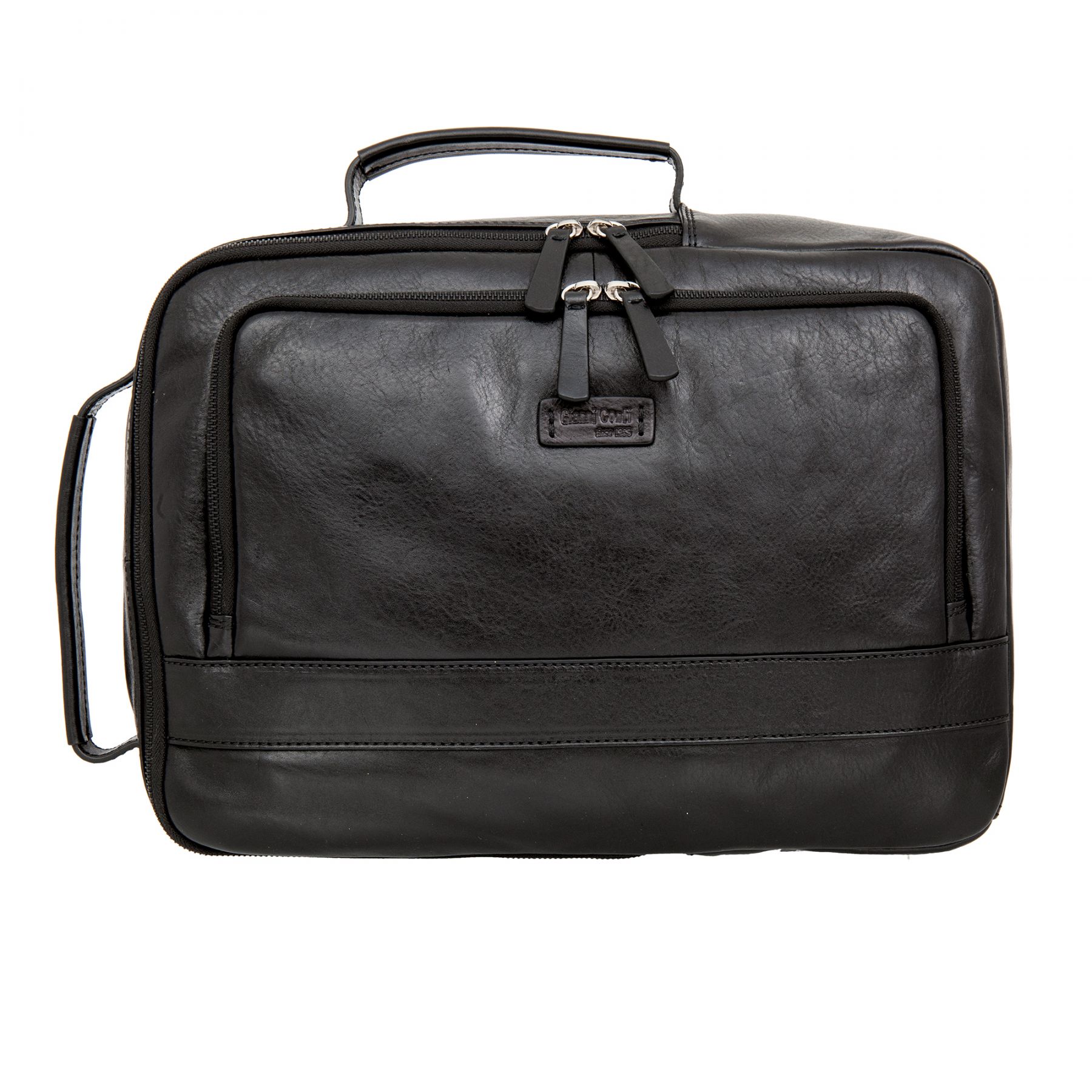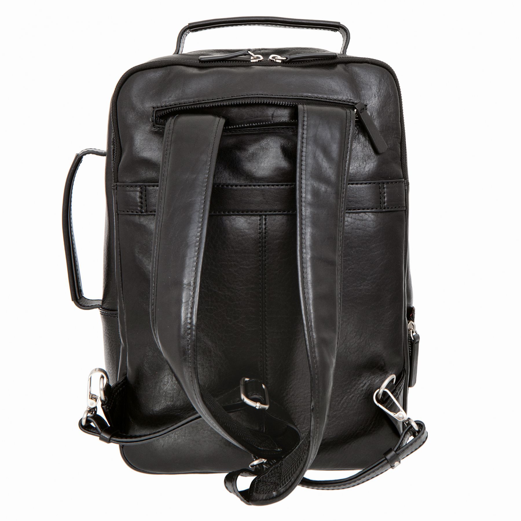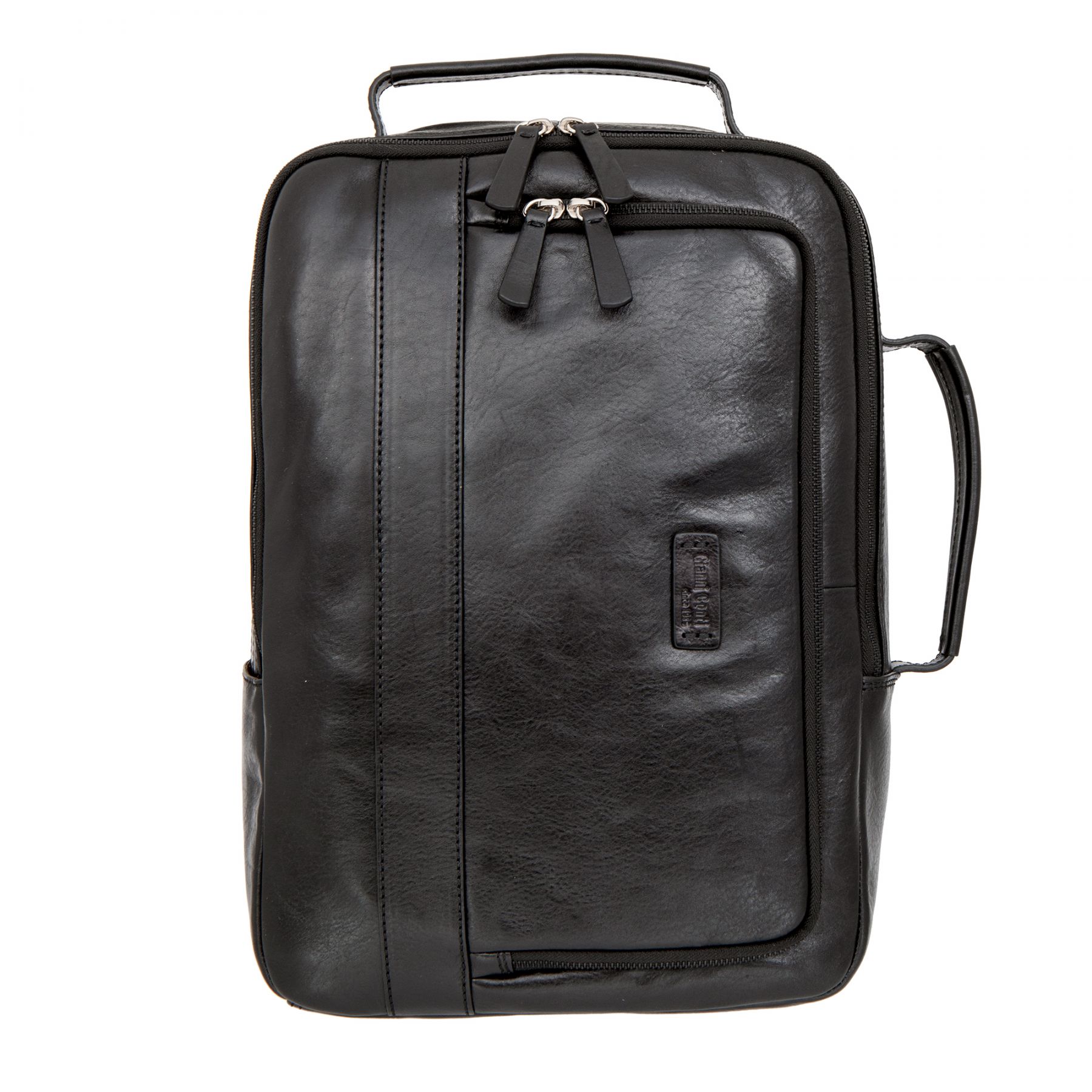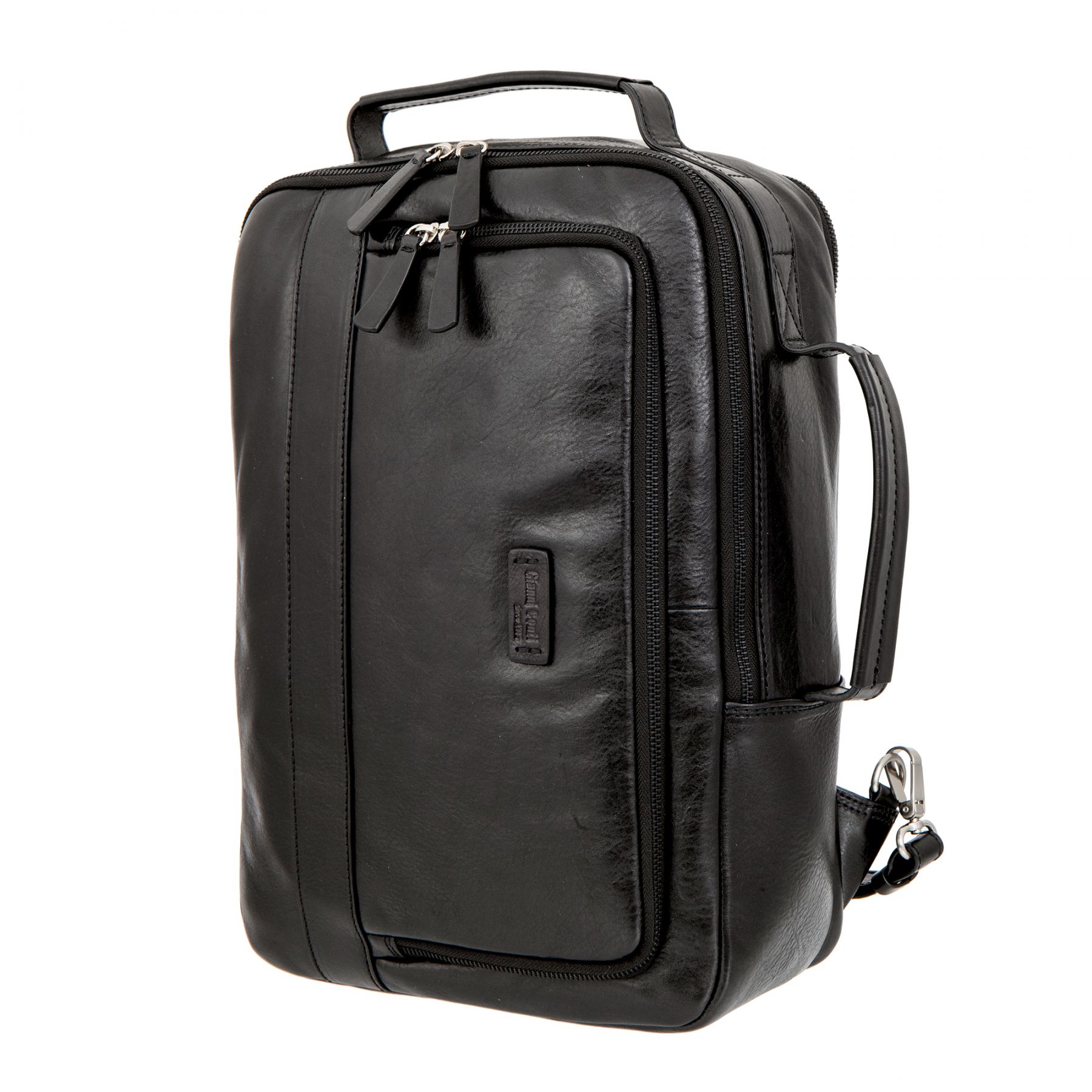 Рюкзак-чемодан Gianni Conti из натуральной кожи, черного цвета, с одним отделом на двойной молнии. В основном отделении имеется отделение для планшета или ноутбука на липучке, карман для документов на молнии, два кармашка для мелких предметов. С внешней стороны на лицевой стенке карман быстрого доступа на молнии и сбоку имеется одно отделение на молнии. На задней стенке один карман на молнии и один карман для регулируемых лямок на молнии. Имеется две ручки, горизонтального и вертикального положения. Сзади имеется приспособление для крепления ручки чемодана.
