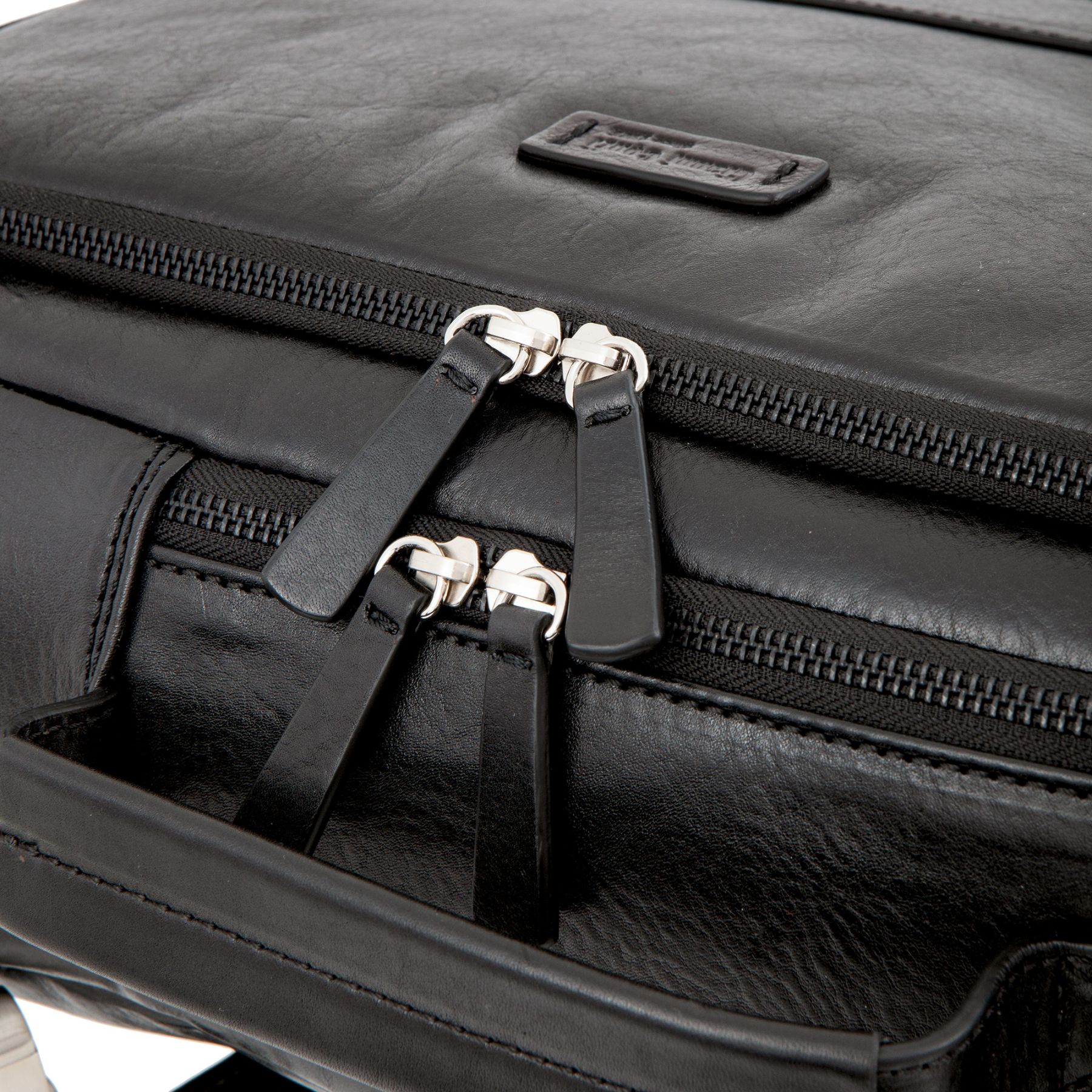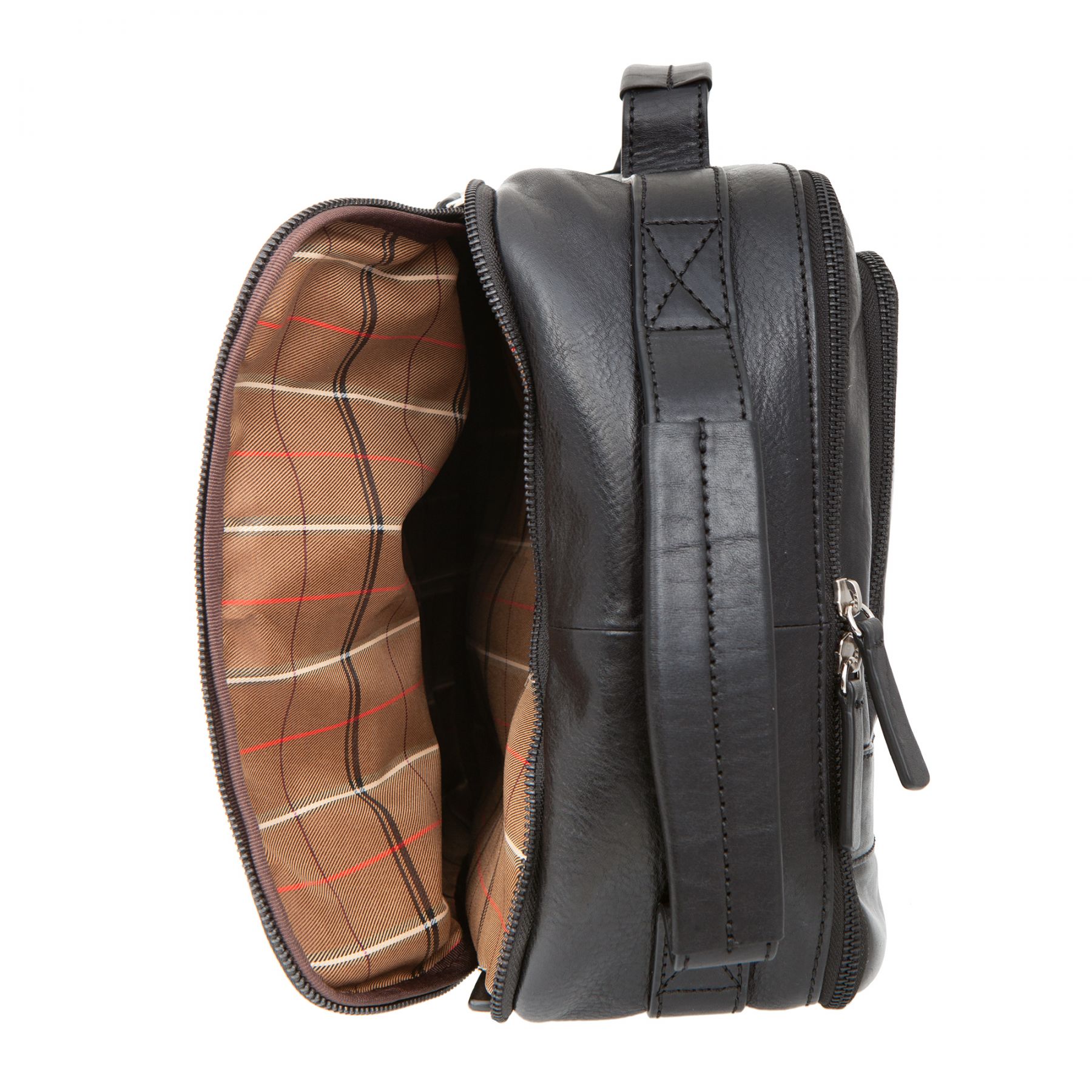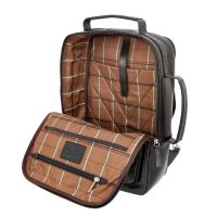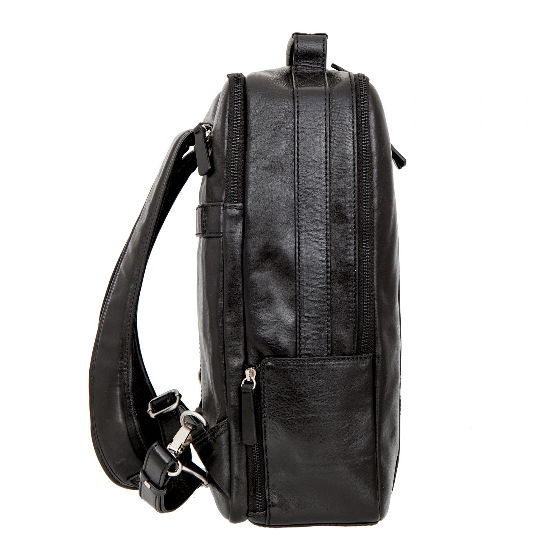 Рюкзак-чемодан Gianni Conti из натуральной кожи, черного цвета, с одним отделом на двойной молнии. В основном отделении имеется отделение для планшета или ноутбука на липучке, карман для документов на молнии, два кармашка для мелких предметов. С внешней стороны на лицевой стенке карман быстрого доступа на молнии и сбоку имеется одно отделение на молнии. На задней стенке один карман на молнии и один карман для регулируемых лямок на молнии. Имеется две ручки, горизонтального и вертикального положения. Сзади имеется приспособление для крепления ручки чемодана.