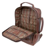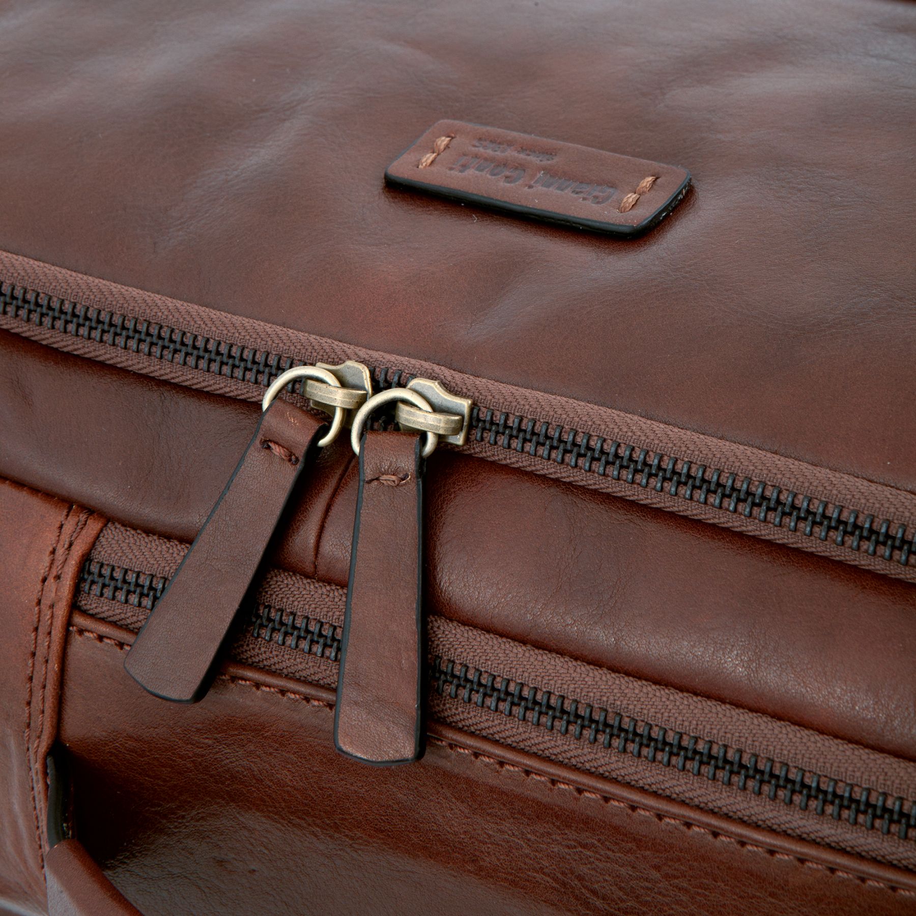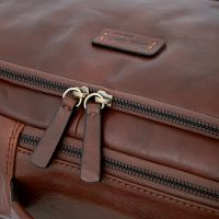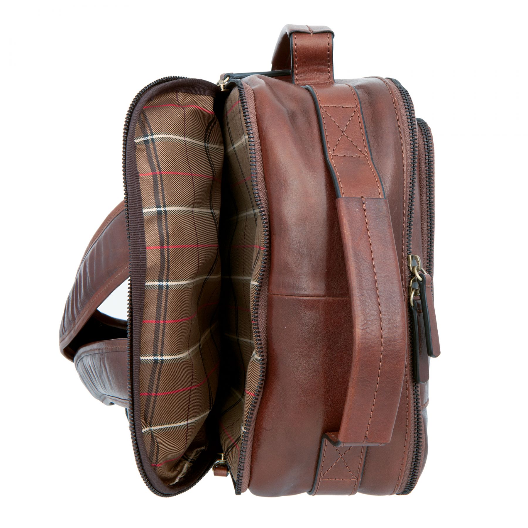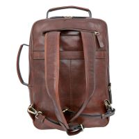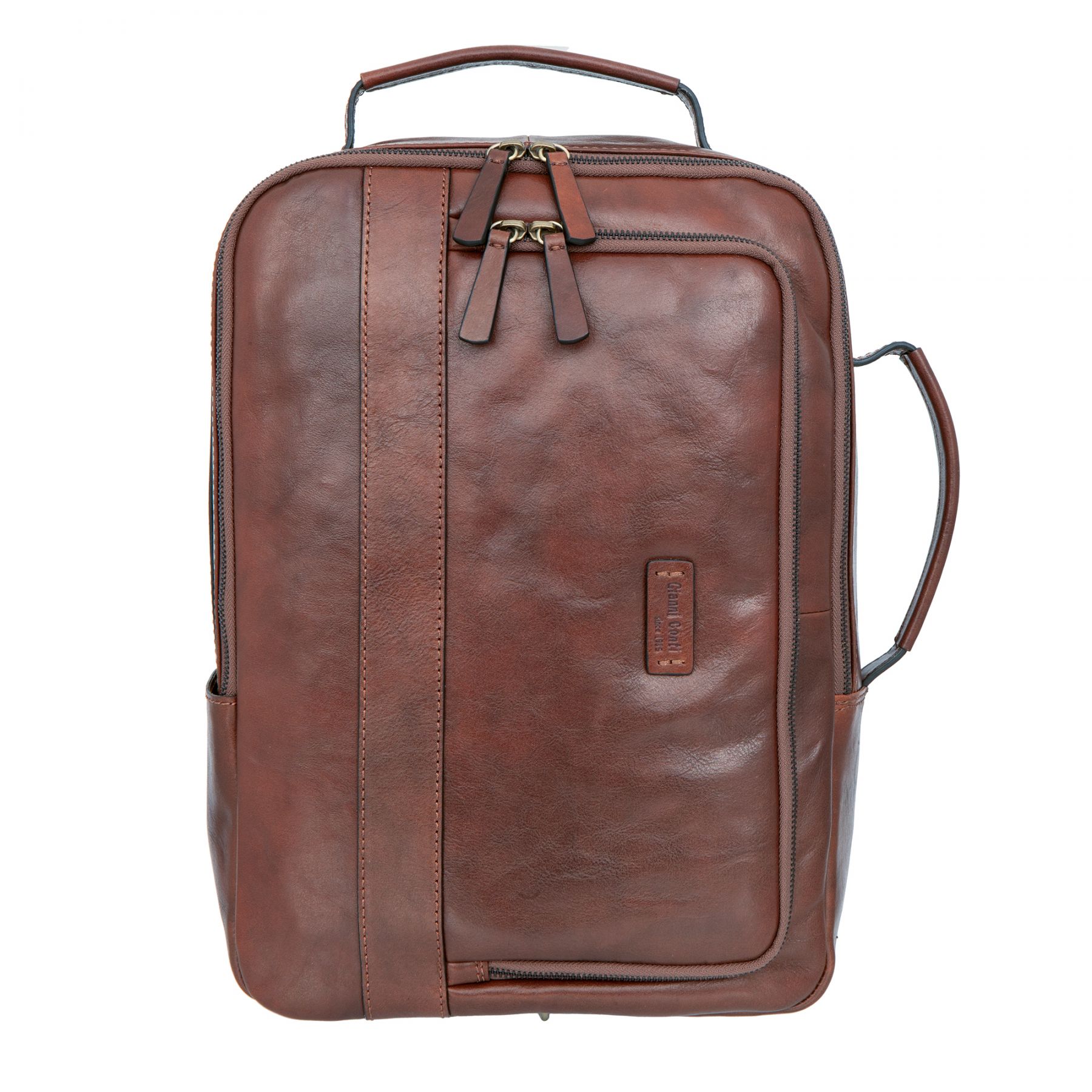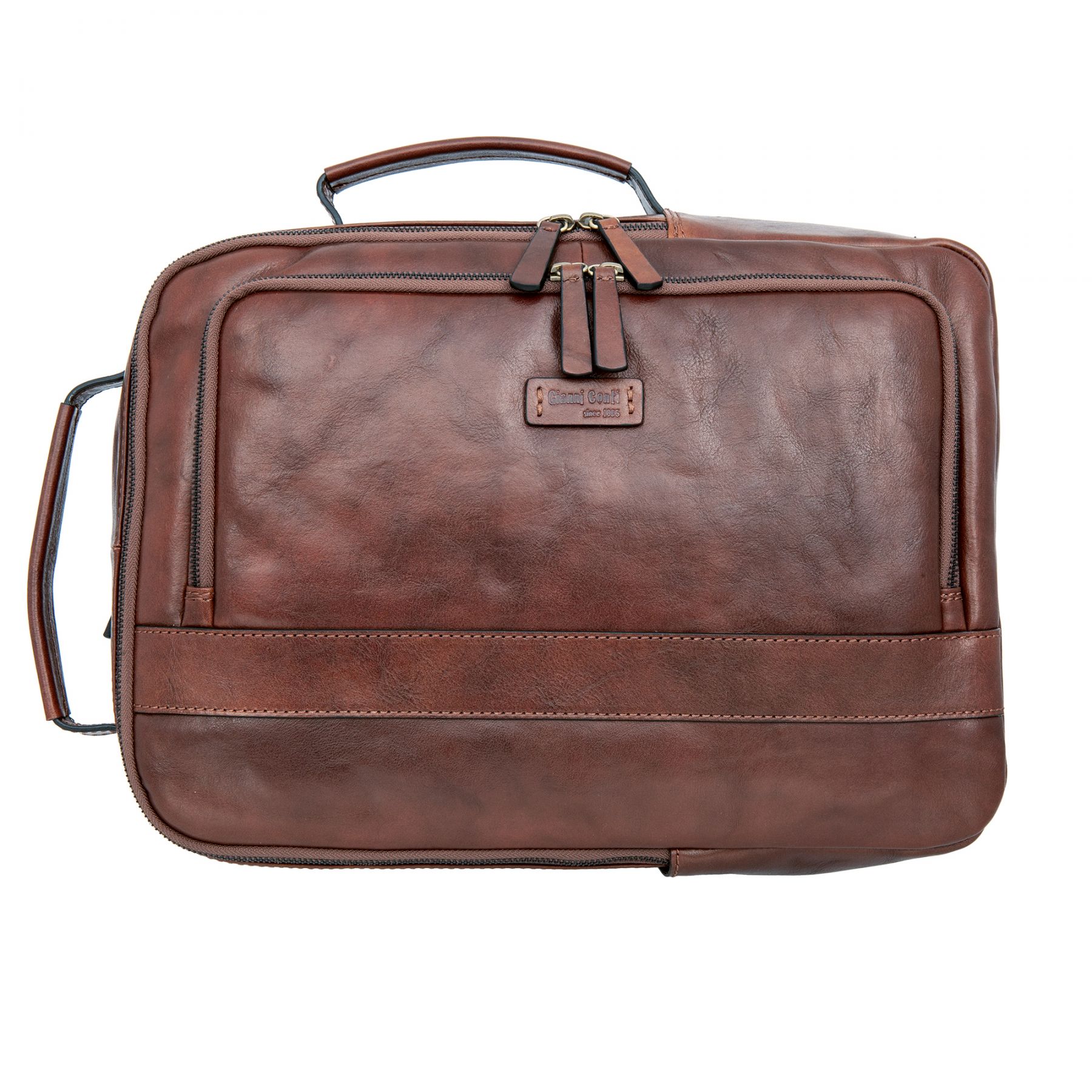 Рюкзак-чемодан Gianni Conti из натуральной кожи, рыжего цвета, с одним отделом на двойной молнии. В основном отделении имеется отделение для планшета или ноутбука на липучке, карман для документов на молнии, два кармашка для мелких предметов. С внешней стороны на лицевой стенке карман быстрого доступа на молнии и сбоку имеется одно отделение на молнии. На задней стенке один карман на молнии и один карман для регулируемых лямок на молнии. Имеется две ручки, горизонтального и вертикального положения. Сзади имеется приспособление для крепления ручки чемодана.