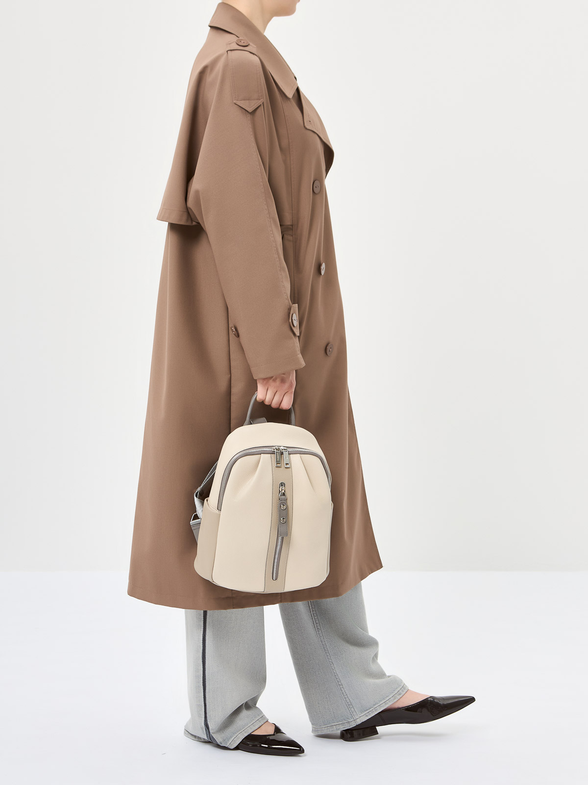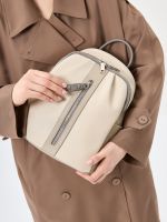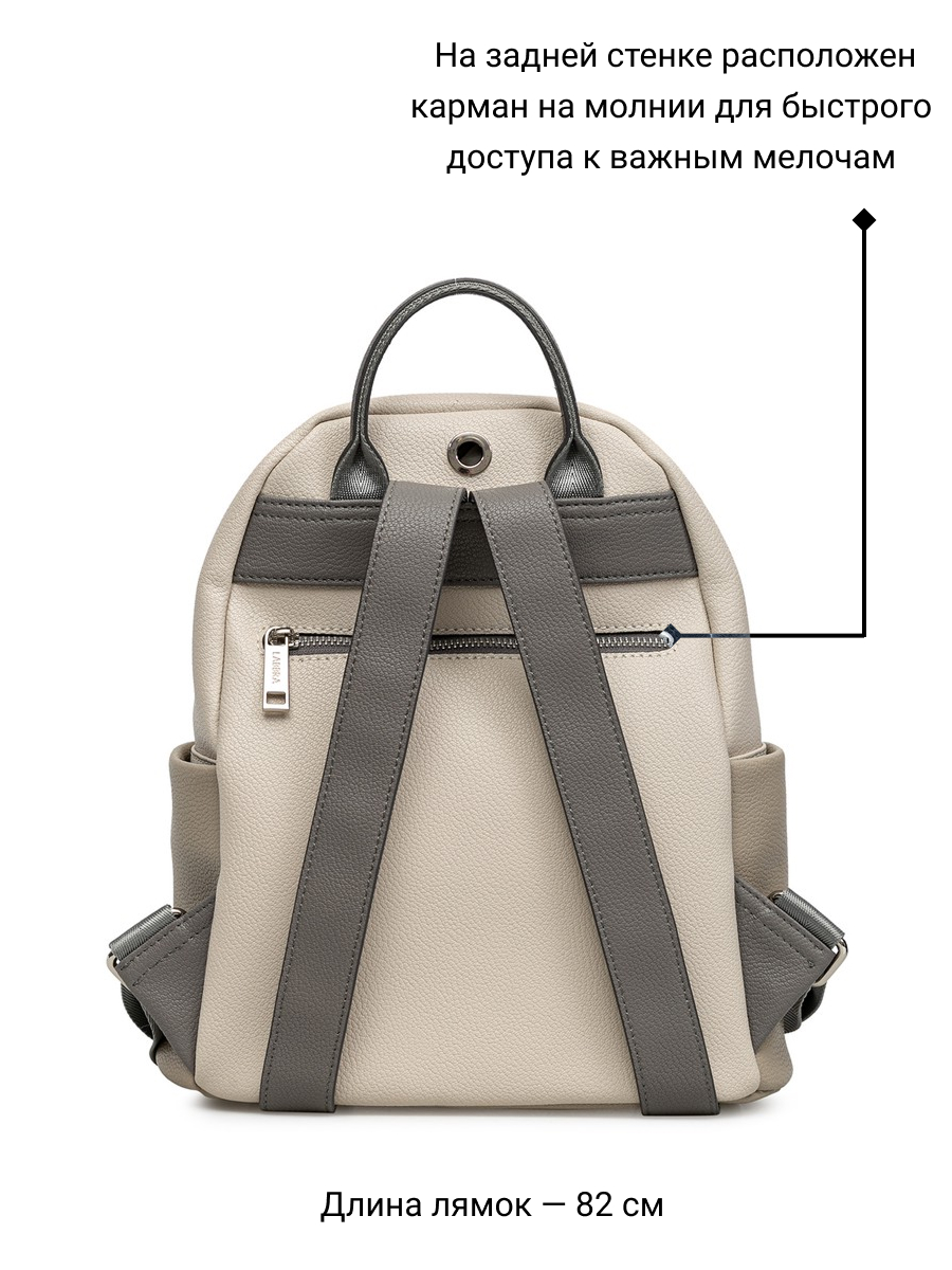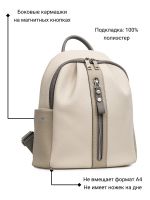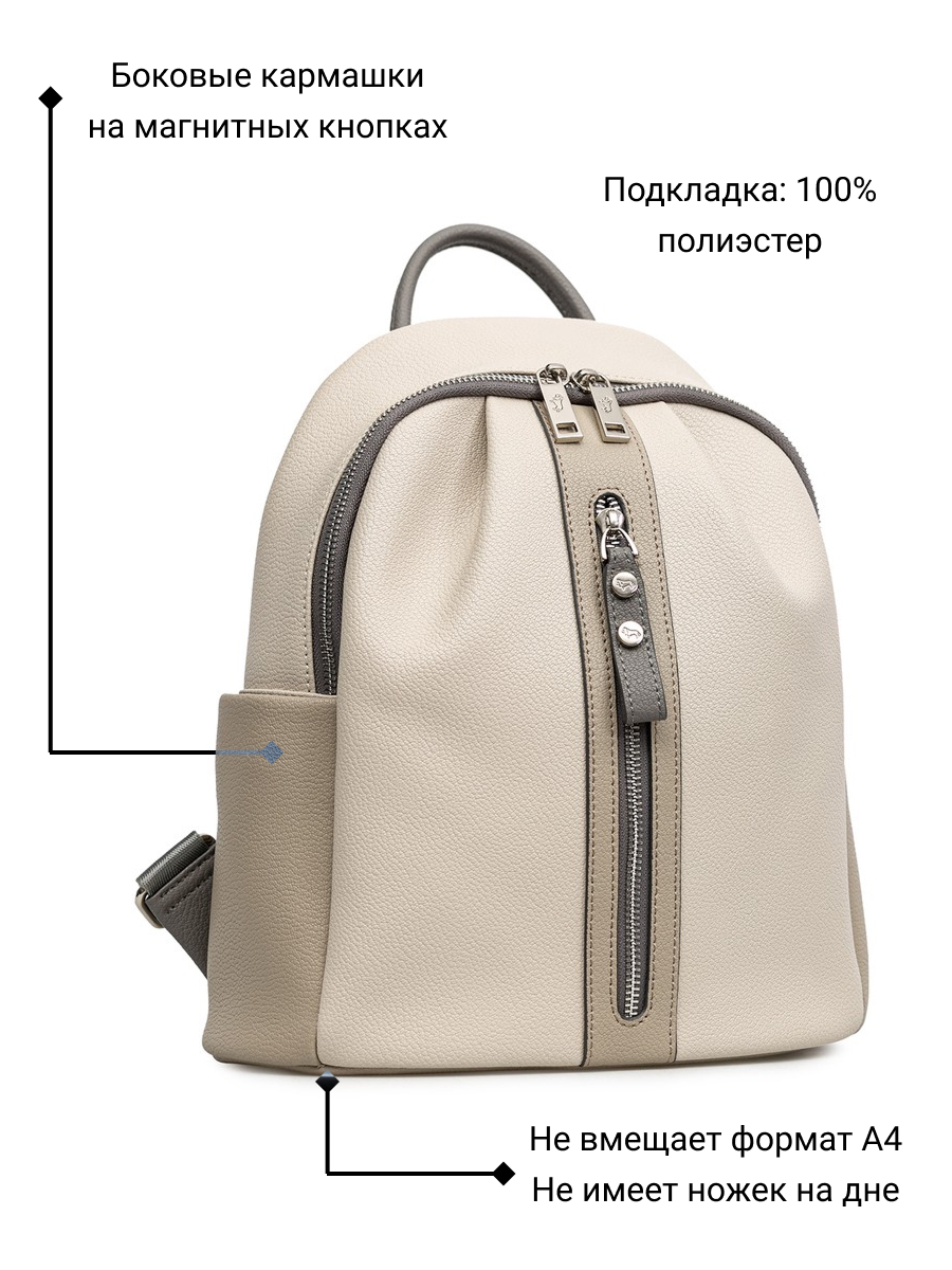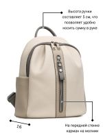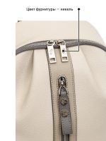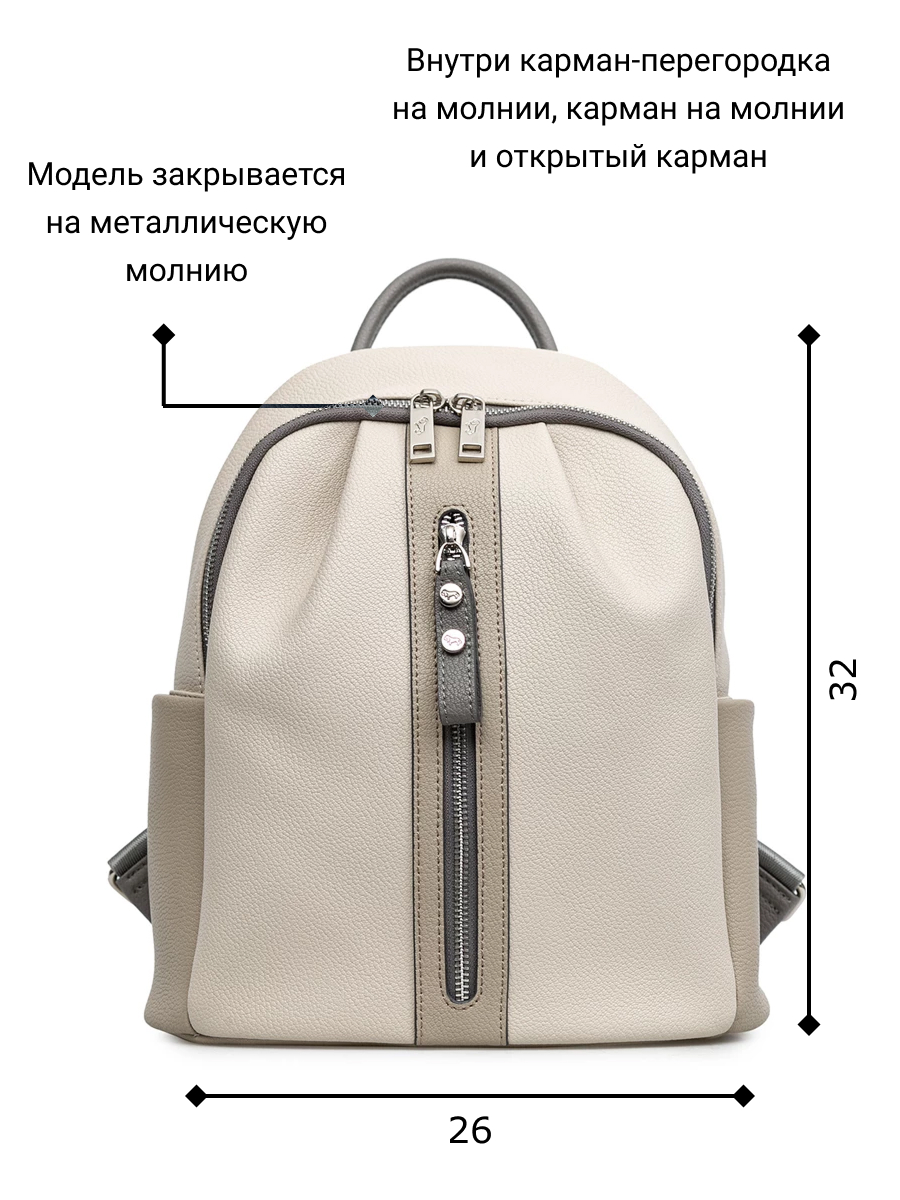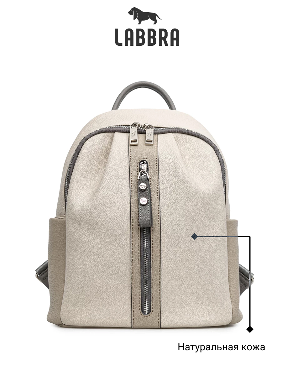 Женский рюкзак торговой марки Labbra из натуральной кожи. Модель закрывается на металлическую молнию. На передней и задней стенке карман на молнии боковые кармашки на магнитных кнопках. Внутри карман-перегородка на молнии карман на молнии и открытый карман. Высота ручки - 5 см. Длина лямок 82 см. Не вмещает формат А4. Не имеет ножки на дне. Цвет фурнитуры - никель.