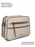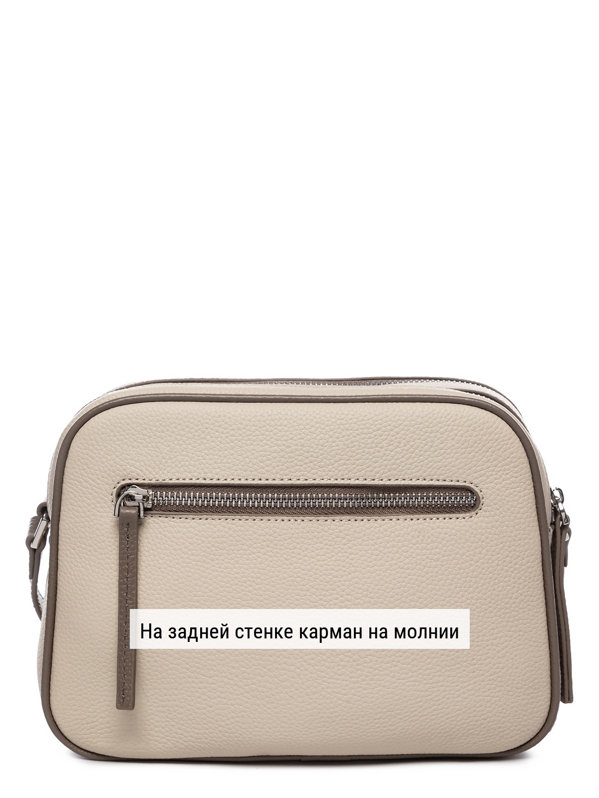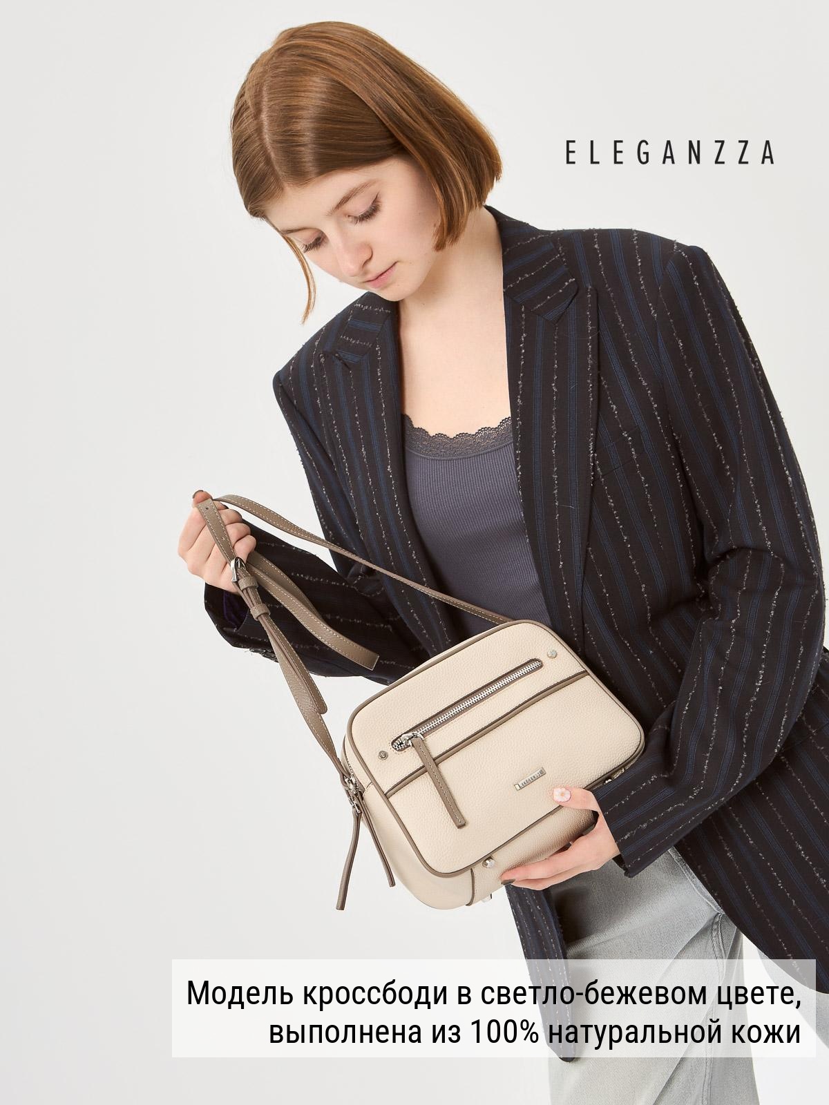 Женская сумка торговой марки Eleganzza из натуральной кожи. Модель имеет два самостоятельных отделения которые закрываются на металлические молнии. Переднее отделение внутри содержит два открытых кармана. Заднее отделение внутри содержит карман на молнии. На передней и задней стенках по одному карману на молнии. Длина наплечного ремня из натуральной кожи - 118 см. ширина - 15 см. Модель имеет ножки на дне.
