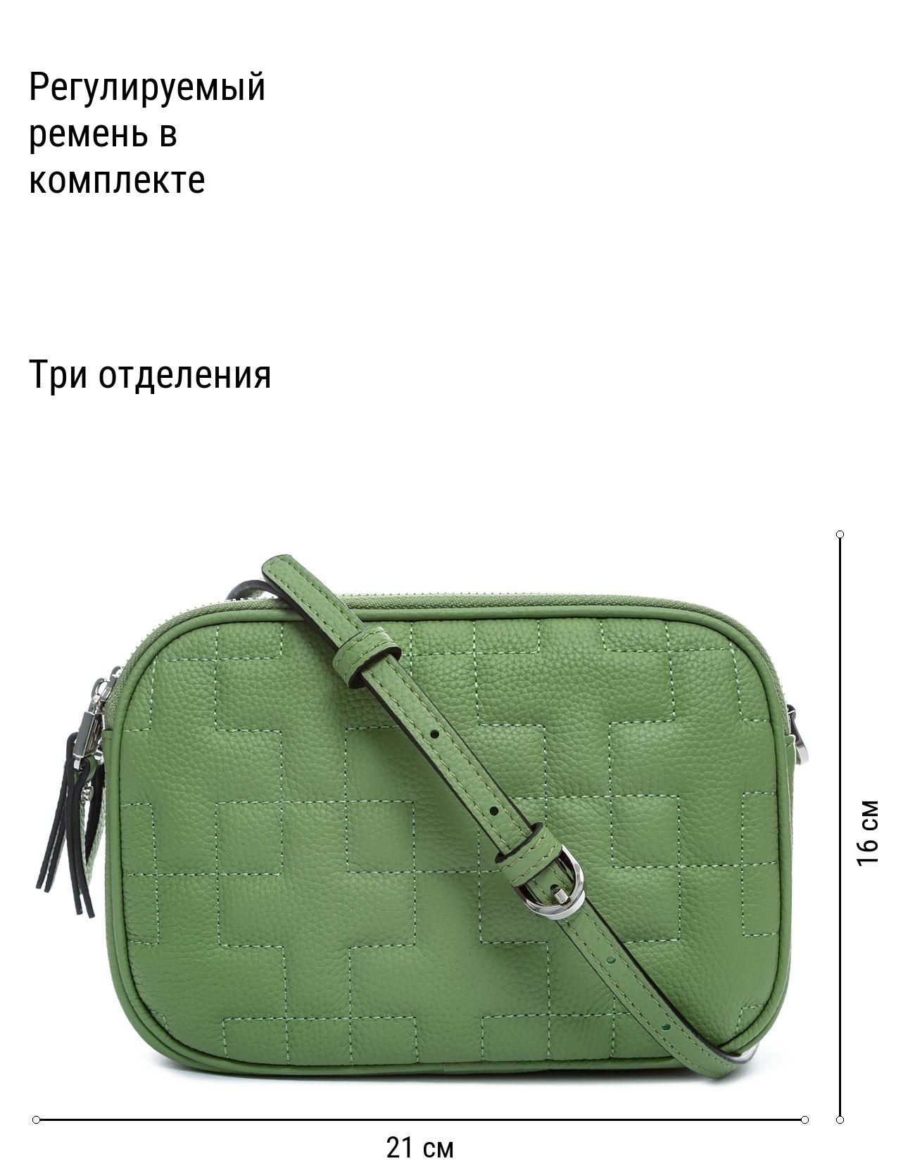 Женская сумка торговой марки ELEGANZZA. Модель имеет три отделения которые закрываются на металлические молнии. Модель содержит внутри два открытых кармана и один карман на молнии. Длина наплечного ремня из натуральной кожи - 118 см. ширина - 11 см. Сумка не имеет ножки на дне. Не вмещает формат А4.